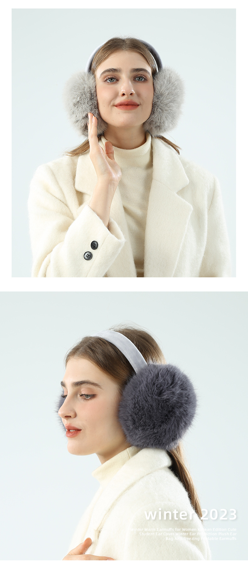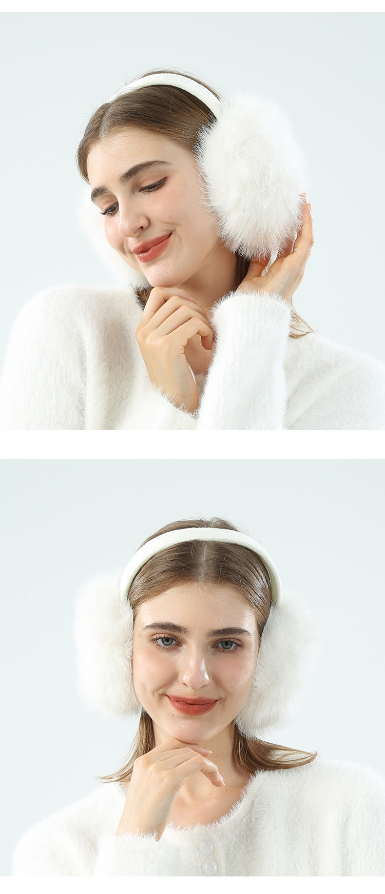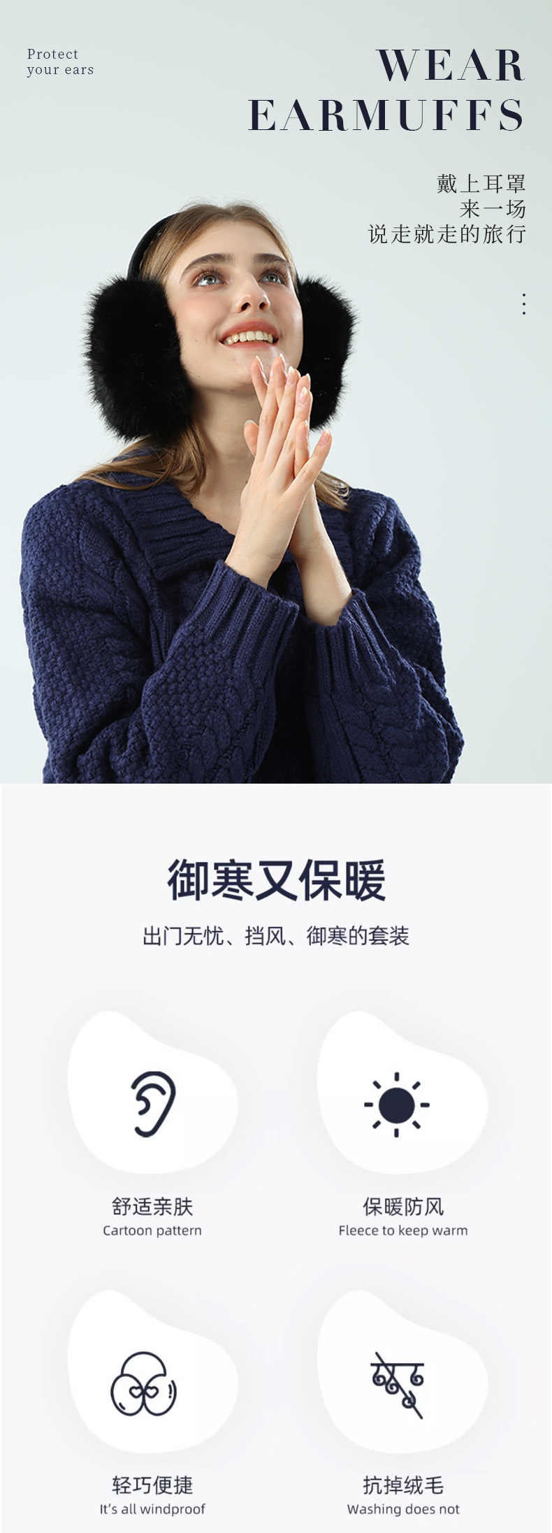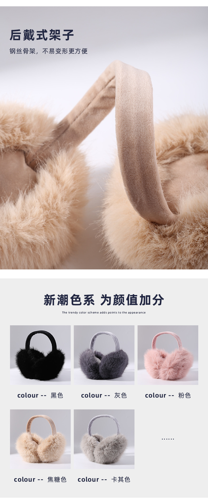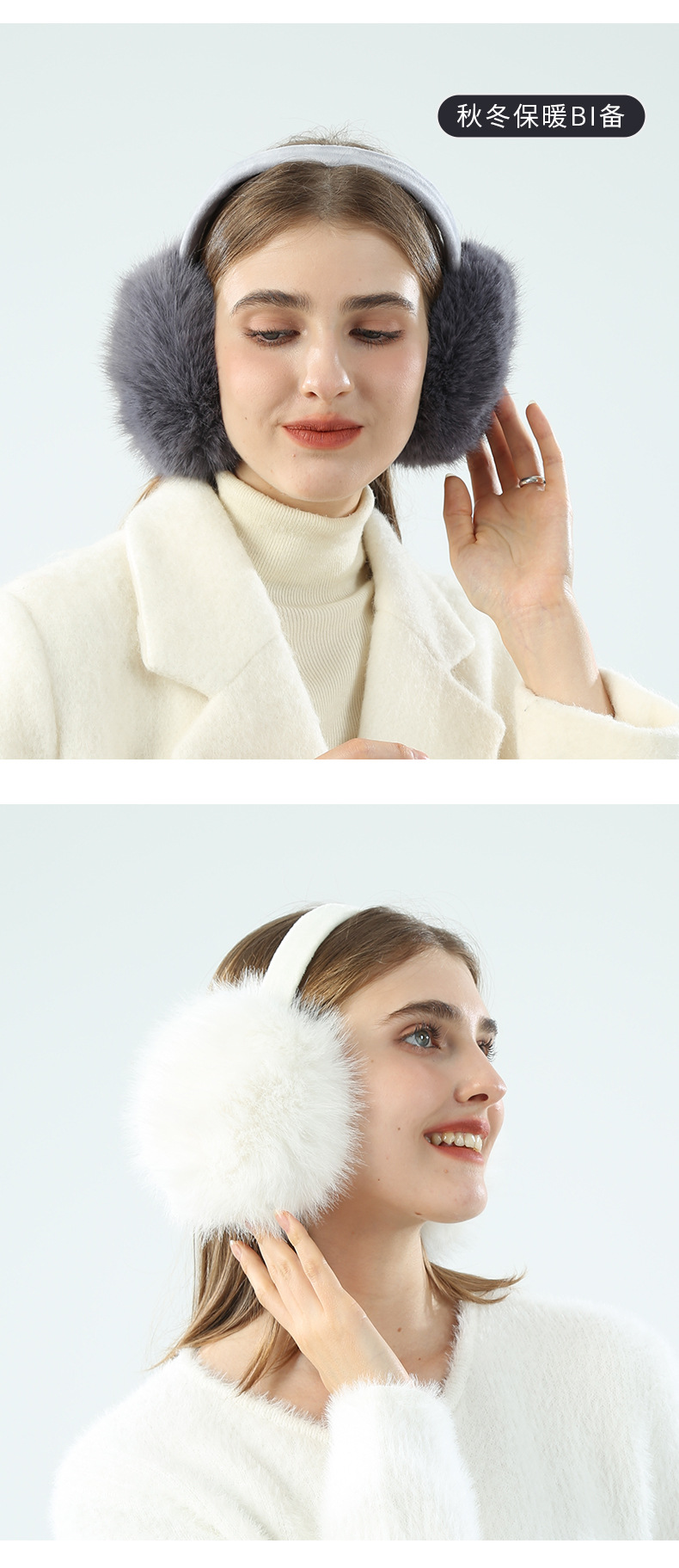 EZ01为仿兔毛材质,细绒杆可折叠收纳,优质骨架佩戴舒适不变形可拆卸耳套,独立包装(产品包装尺寸 长19cm 宽17.5cm 重量89g)