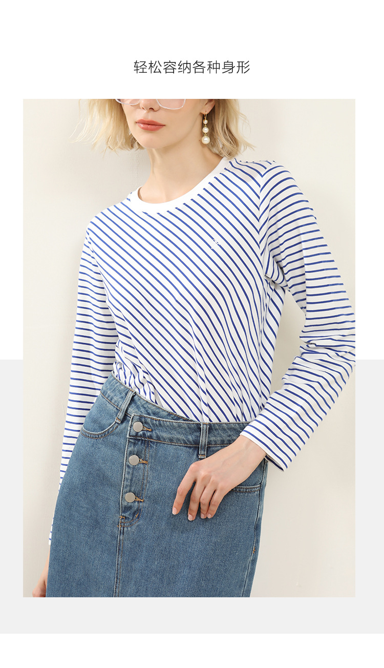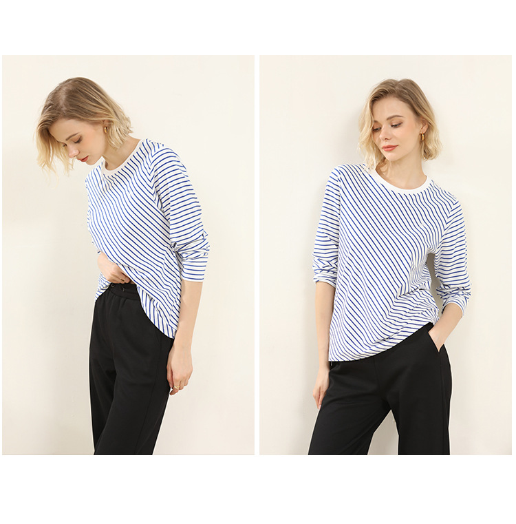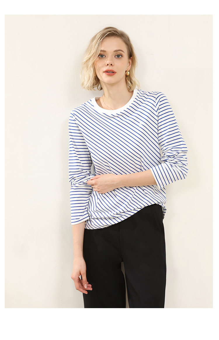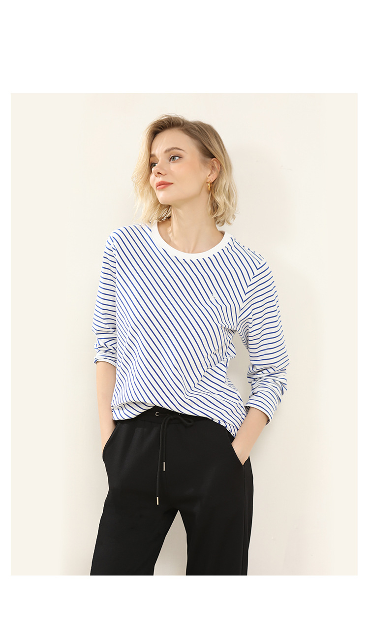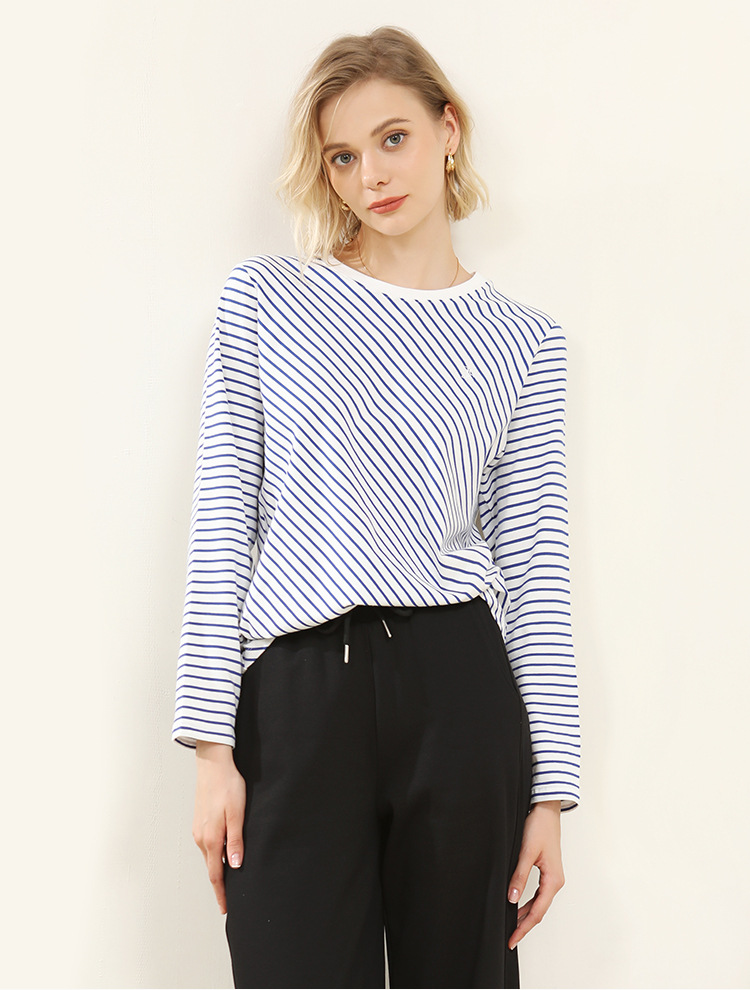 CANVAUS 긴팔 티셔츠 스트라이프 네이비 스타일 라운드 넥 봄과 가을 내부 자수 베이스 셔츠 여성베이스 의류 패션