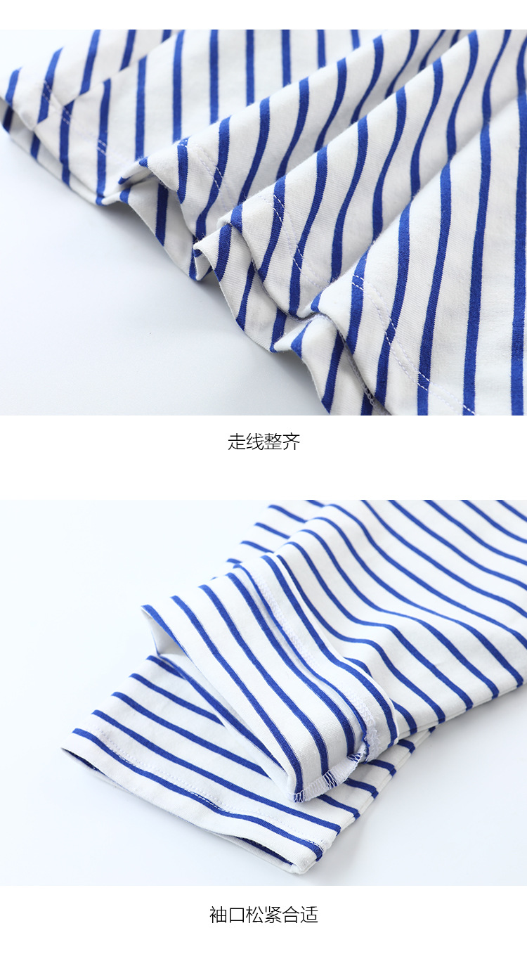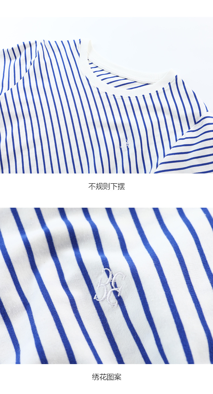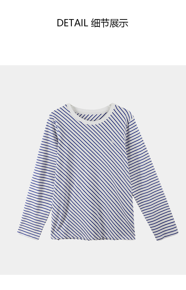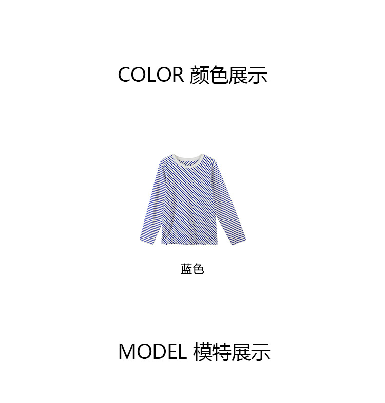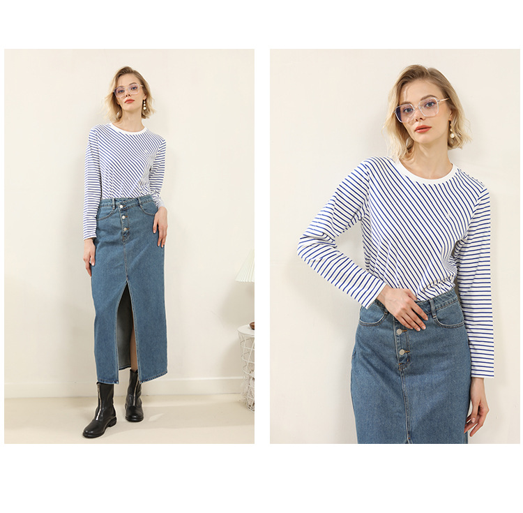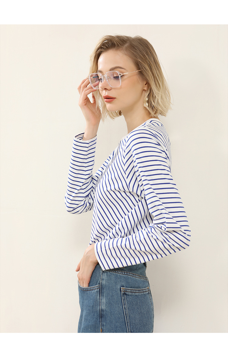 CANVAUS 긴팔 티셔츠 스트라이프 네이비 스타일 라운드 넥 봄과 가을 내부 자수 베이스 셔츠 여성베이스 의류 패션
