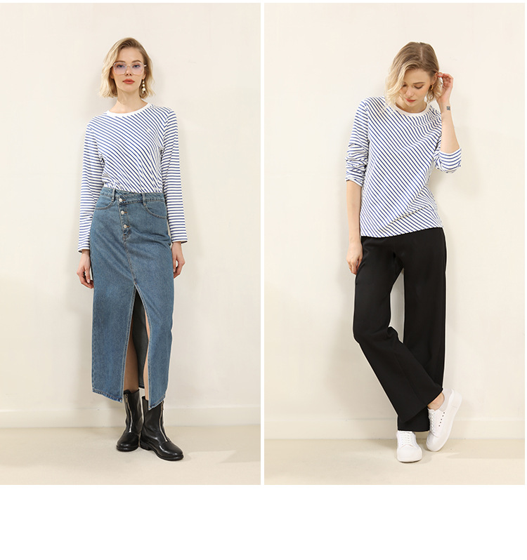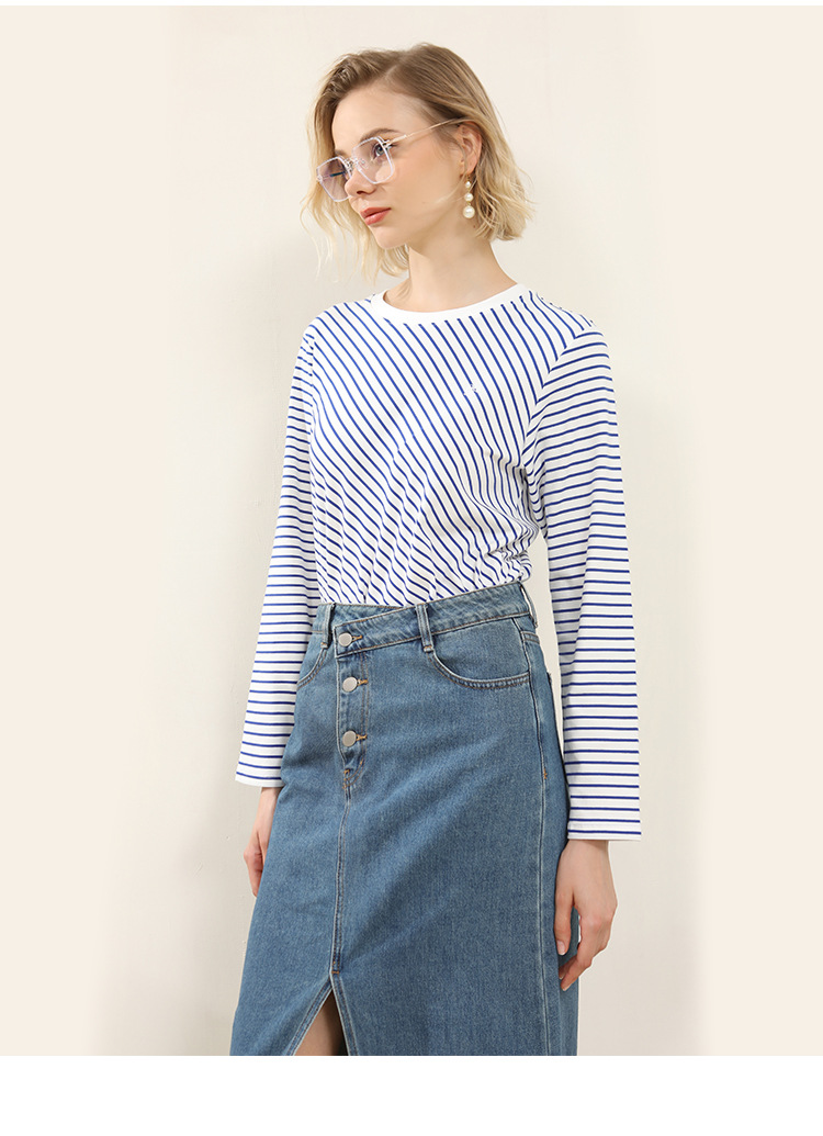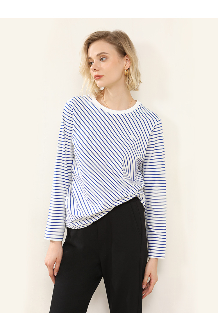 CANVAUS 긴팔 티셔츠 스트라이프 네이비 스타일 라운드 넥 봄과 가을 내부 자수 베이스 셔츠 여성베이스 의류 패션스토어 가기