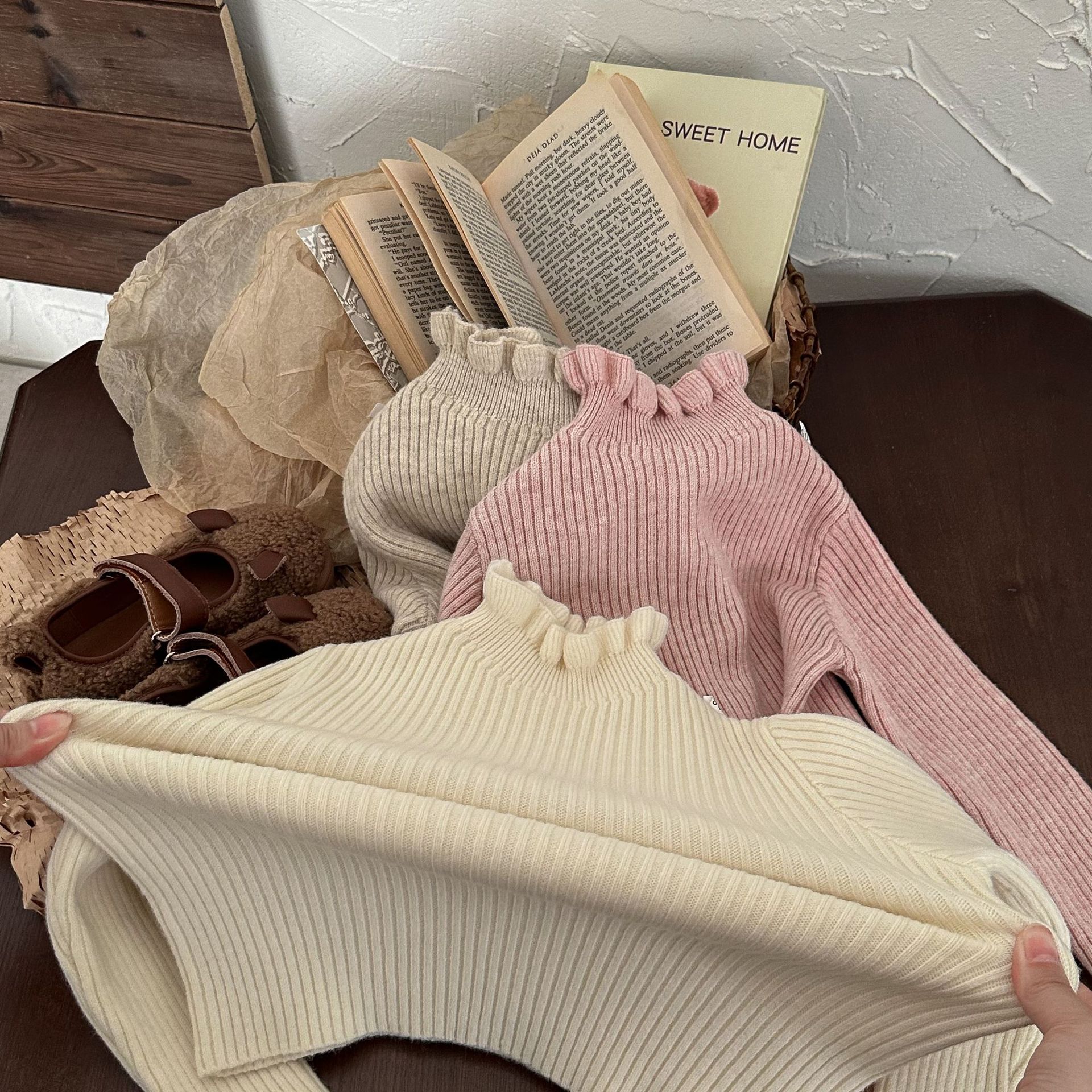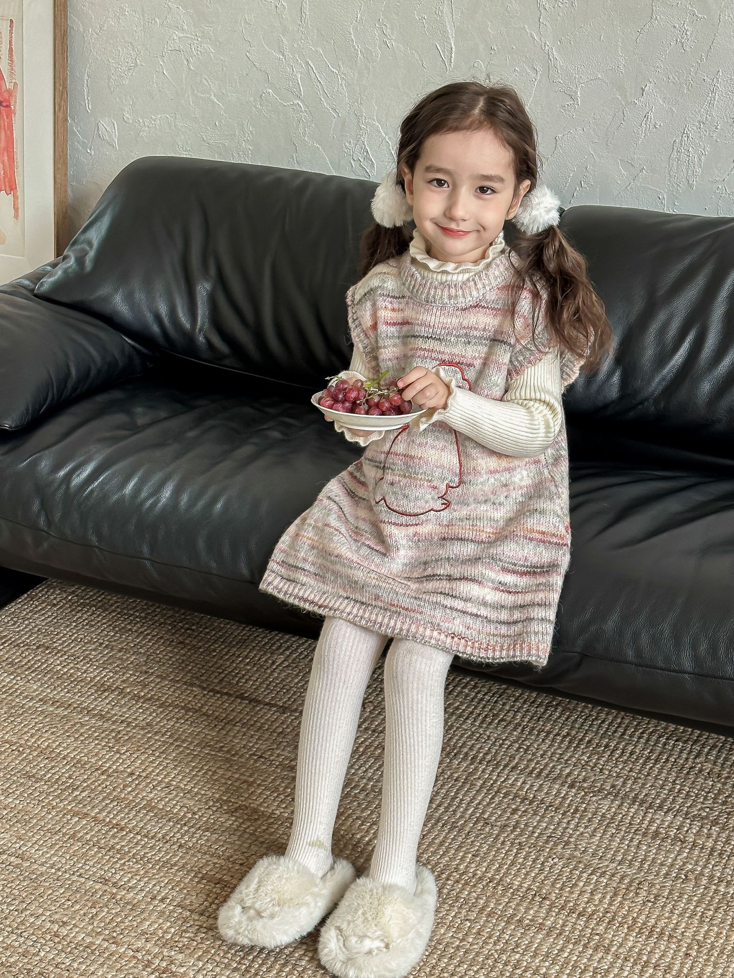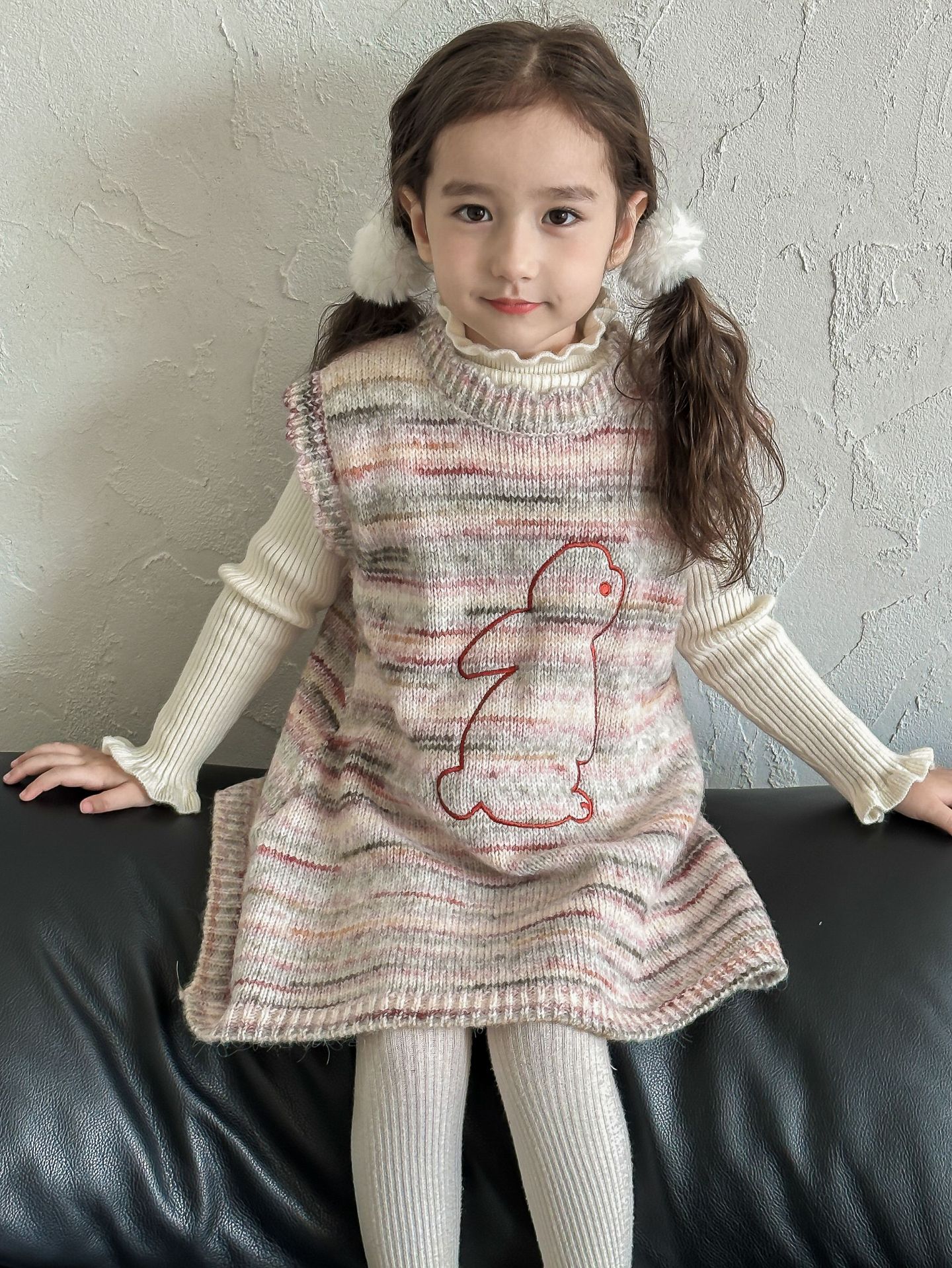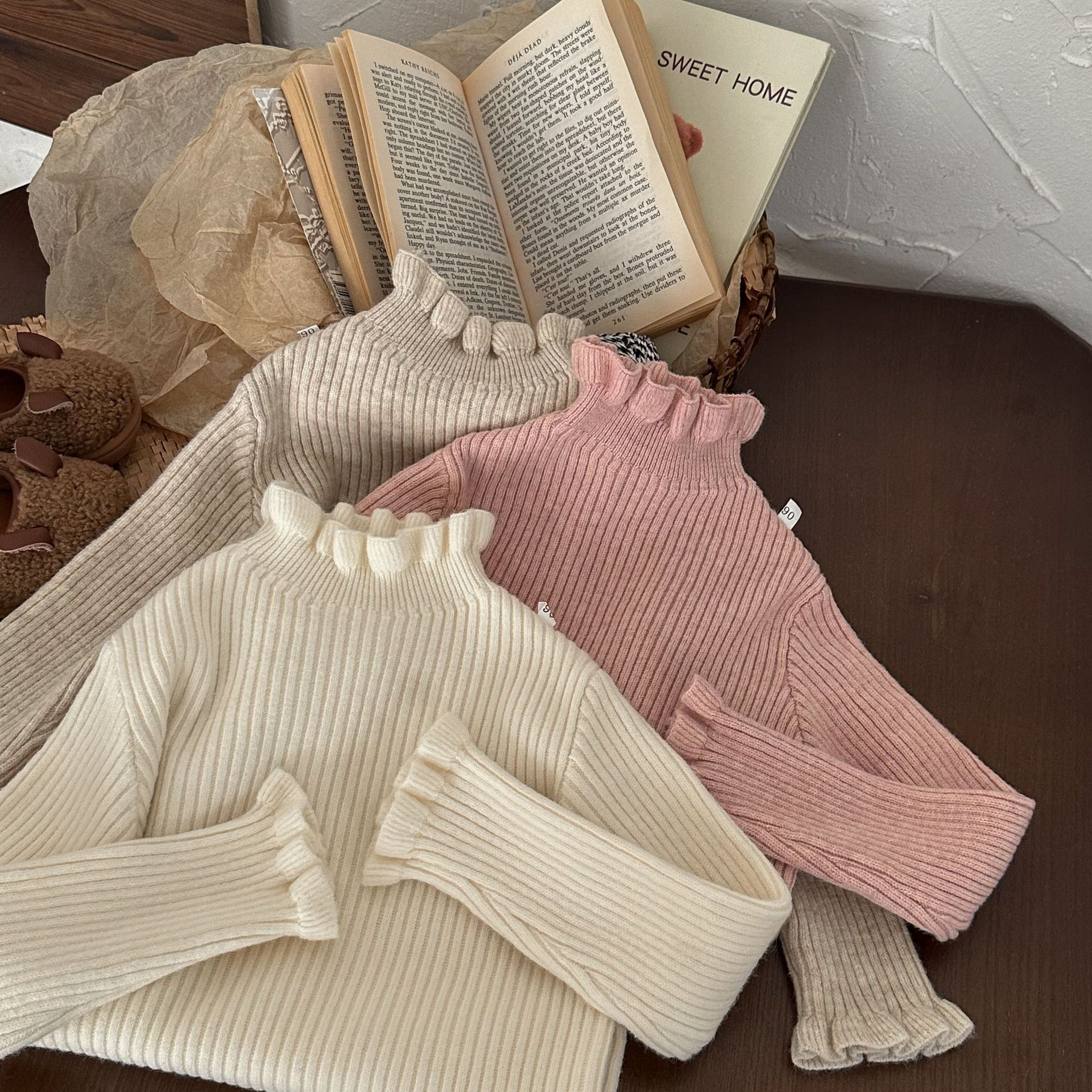 어린이 스웨터 2023 겨울 새로운 어린이 단색 모든 일치 기본 셔츠 소녀 따뜻한 귀 부드러운 왁스 니트 스웨터