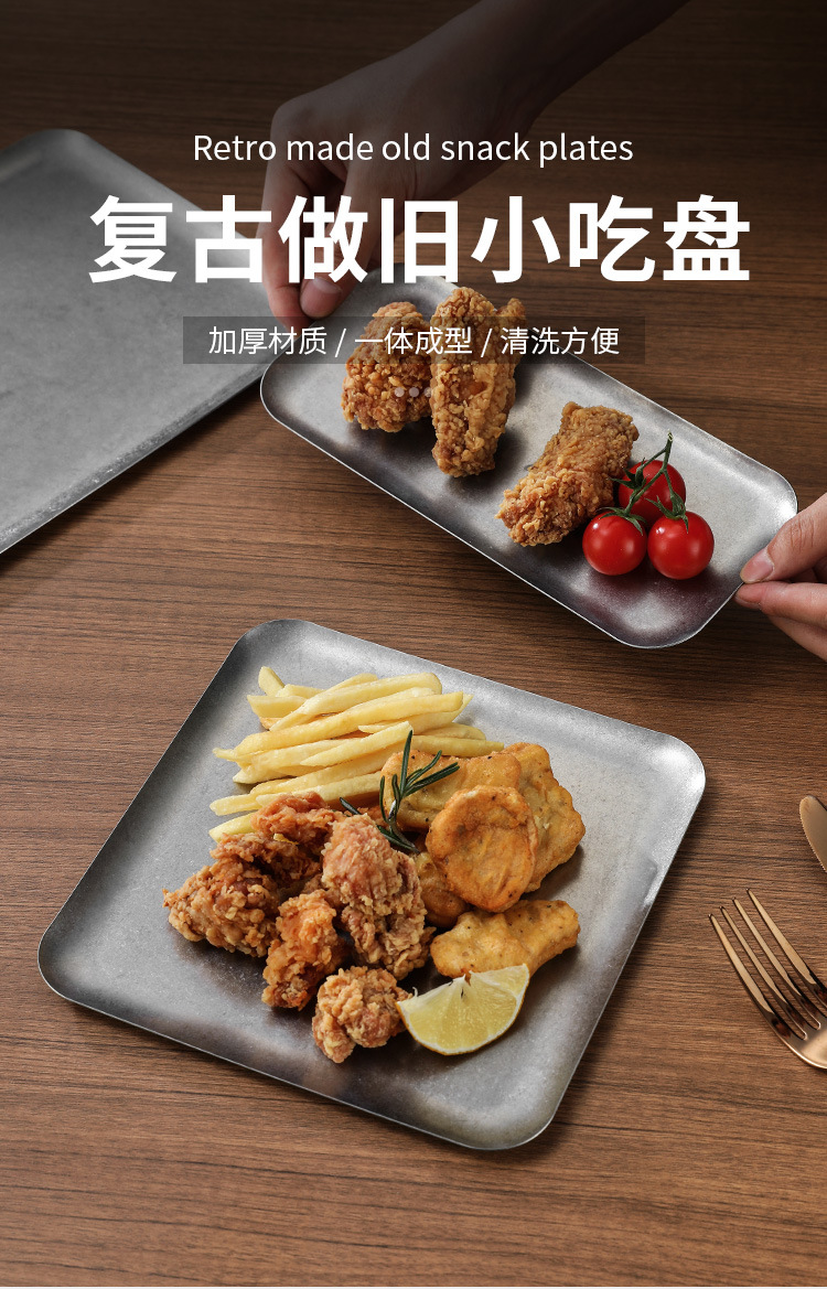 304 스테인레스 스틸 빈티지 골동품 눈송이 회색 산업 스타일 야외 캠핑 트레이 직선 가장자리 트레이 얕은 접시 바베큐 팬