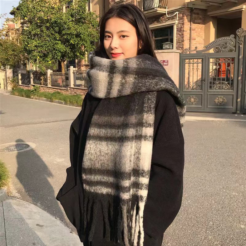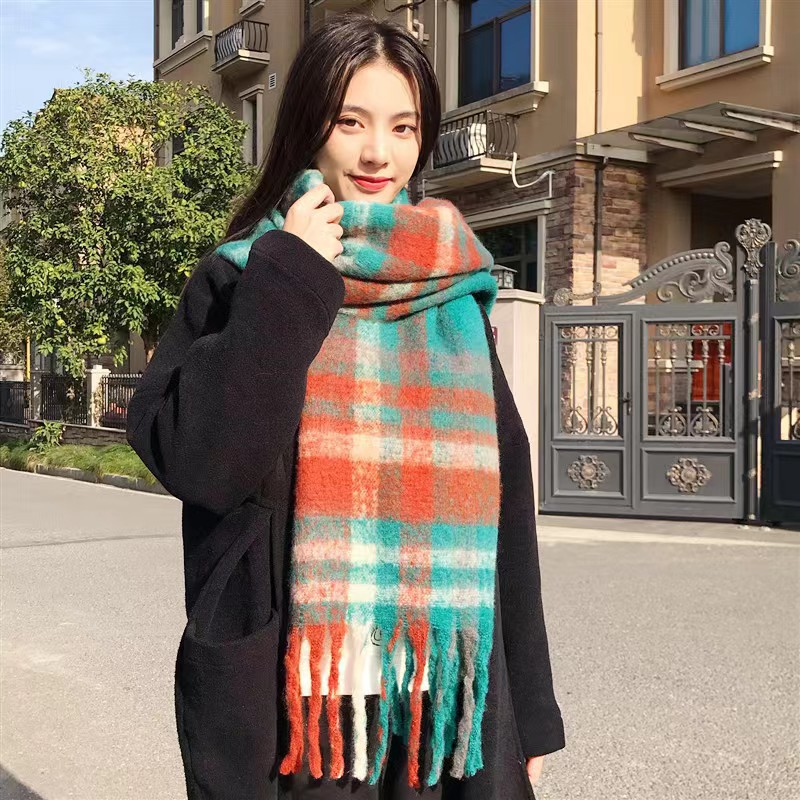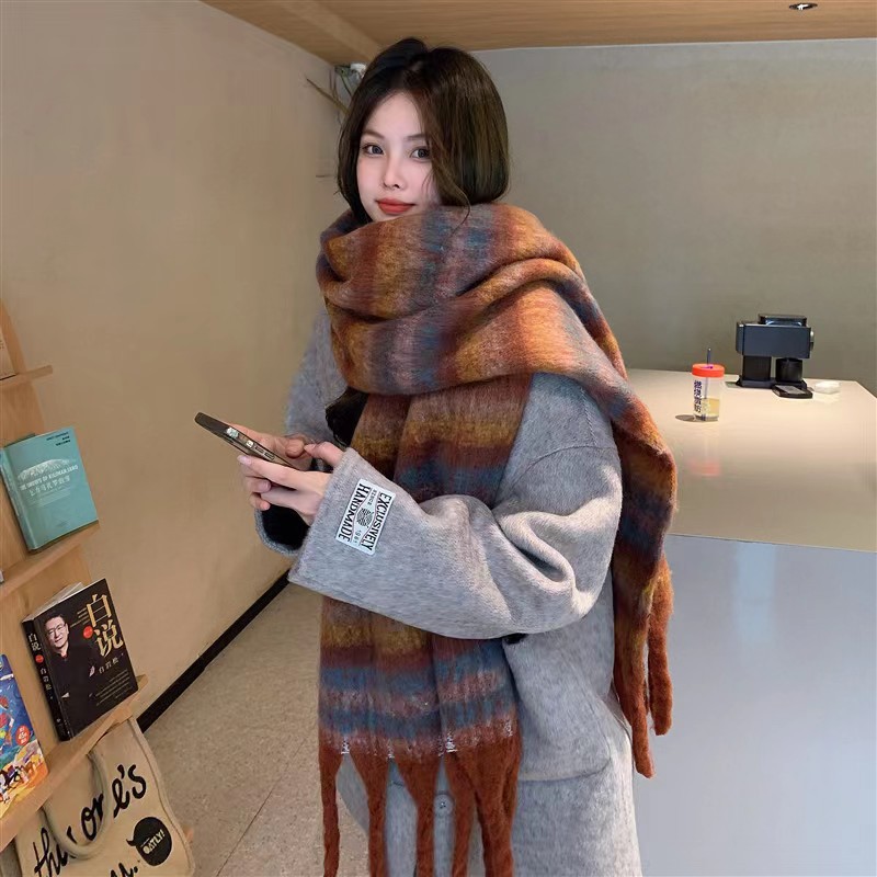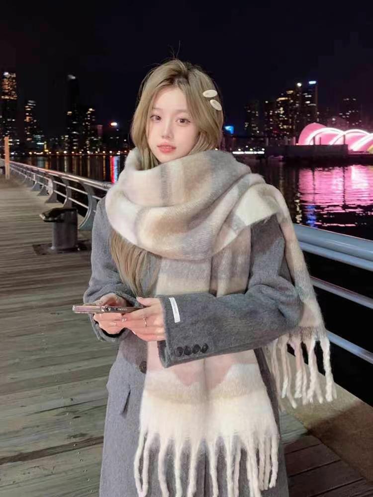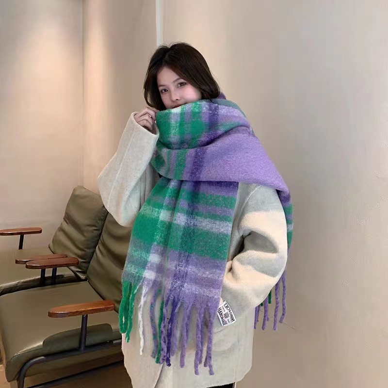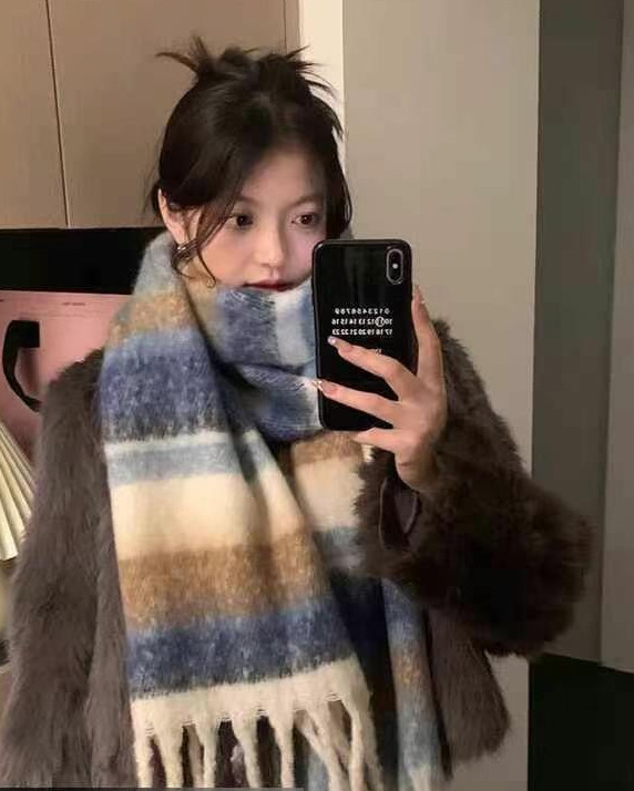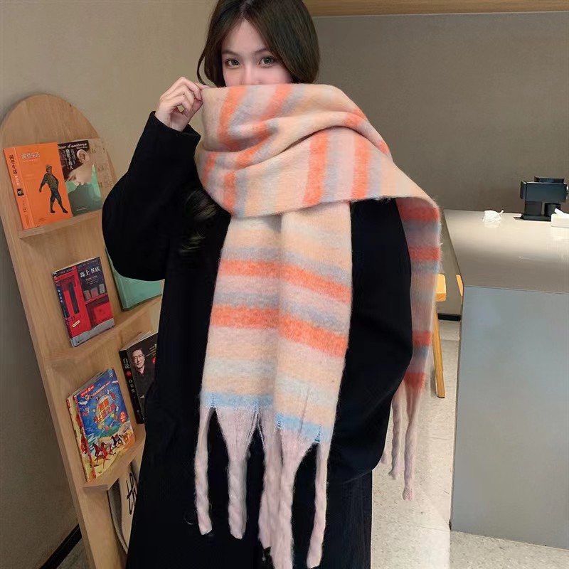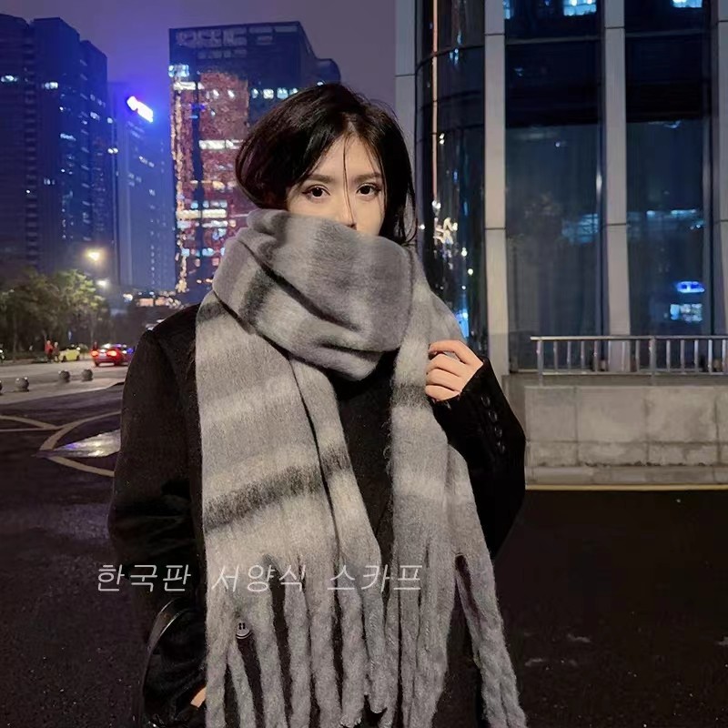 가을과 겨울 대비 컬러 스트라이프 타셀 하이 엔드 센스 스카프 여성 분위기 감각은 두꺼운 따뜻한 격자 무늬 올 매치 한국 스타일 스카프스토어 가기