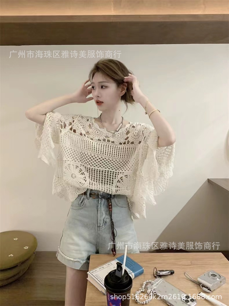 빈티지 게으른 스타일 중공 크로 셰 뜨개질 뿔 소매 스웨터 여성의 가을 새로운 시크 느슨한 슬림 핏 블라우스 탑