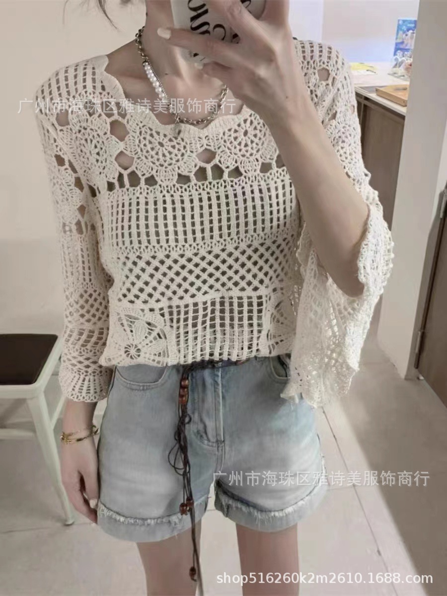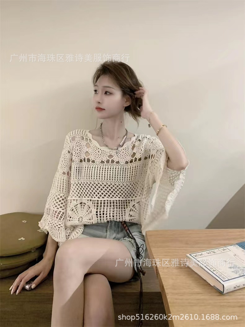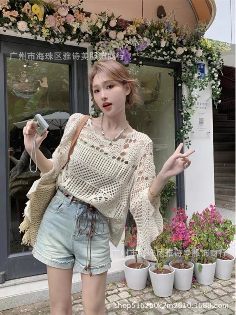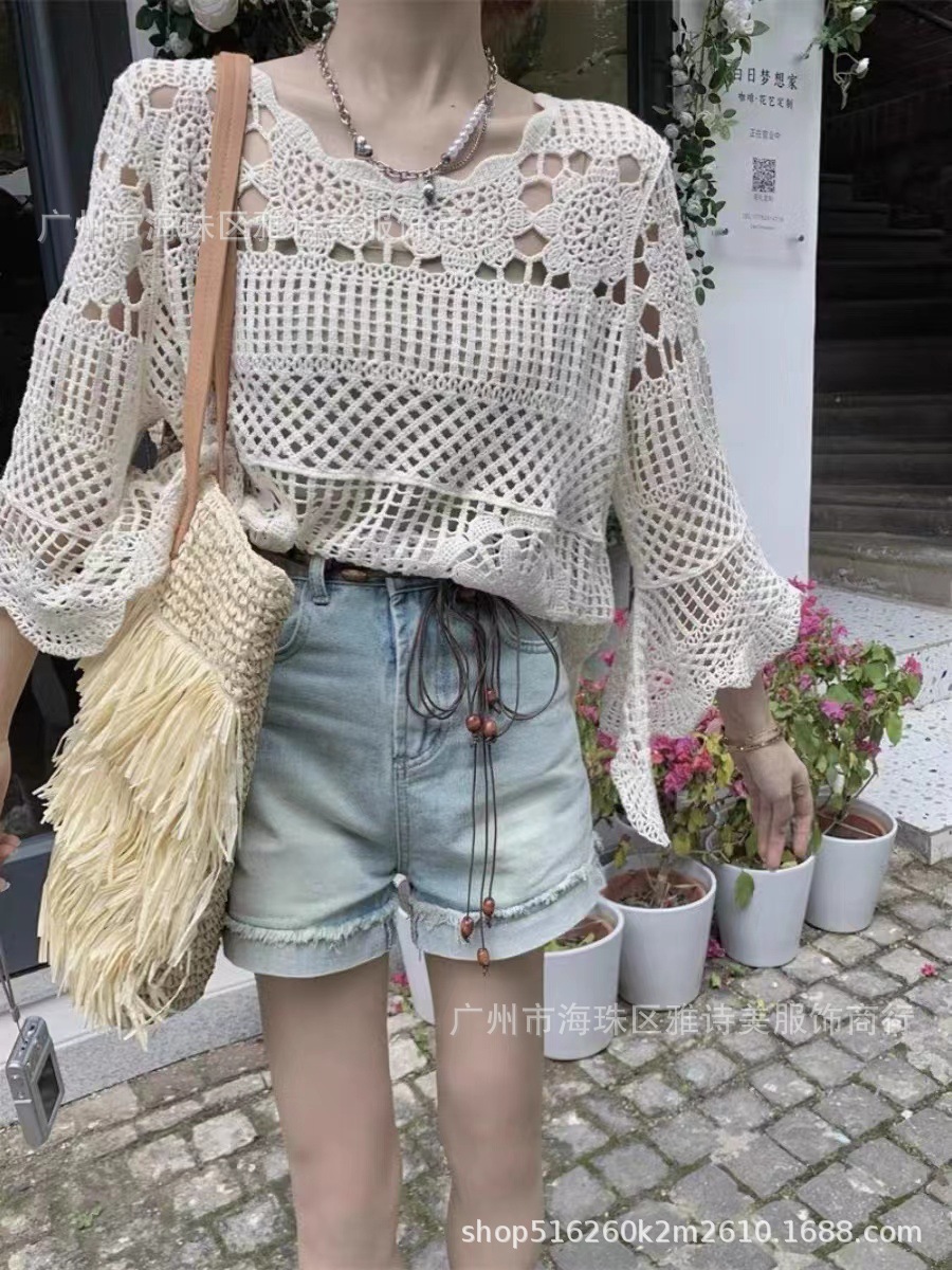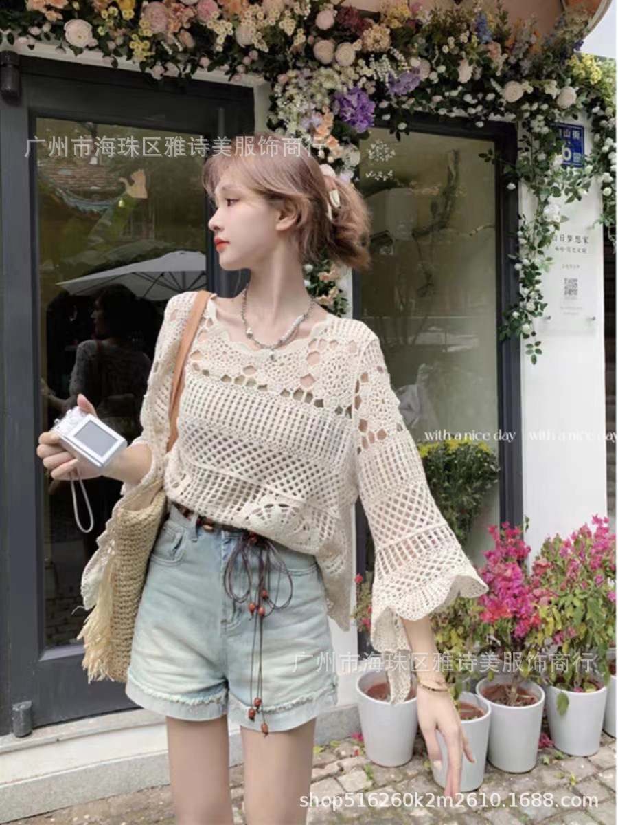 빈티지 게으른 스타일 중공 크로 셰 뜨개질 뿔 소매 스웨터 여성의 가을 새로운 시크 느슨한 슬림 핏 블라우스 탑스토어 가기