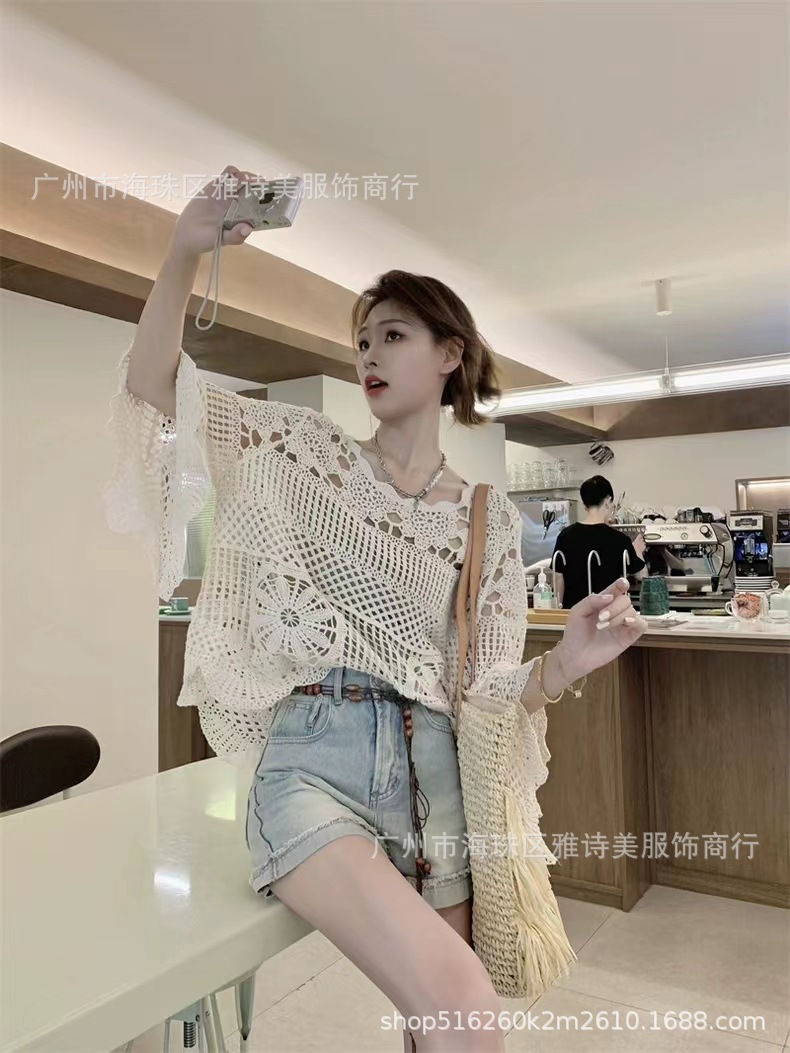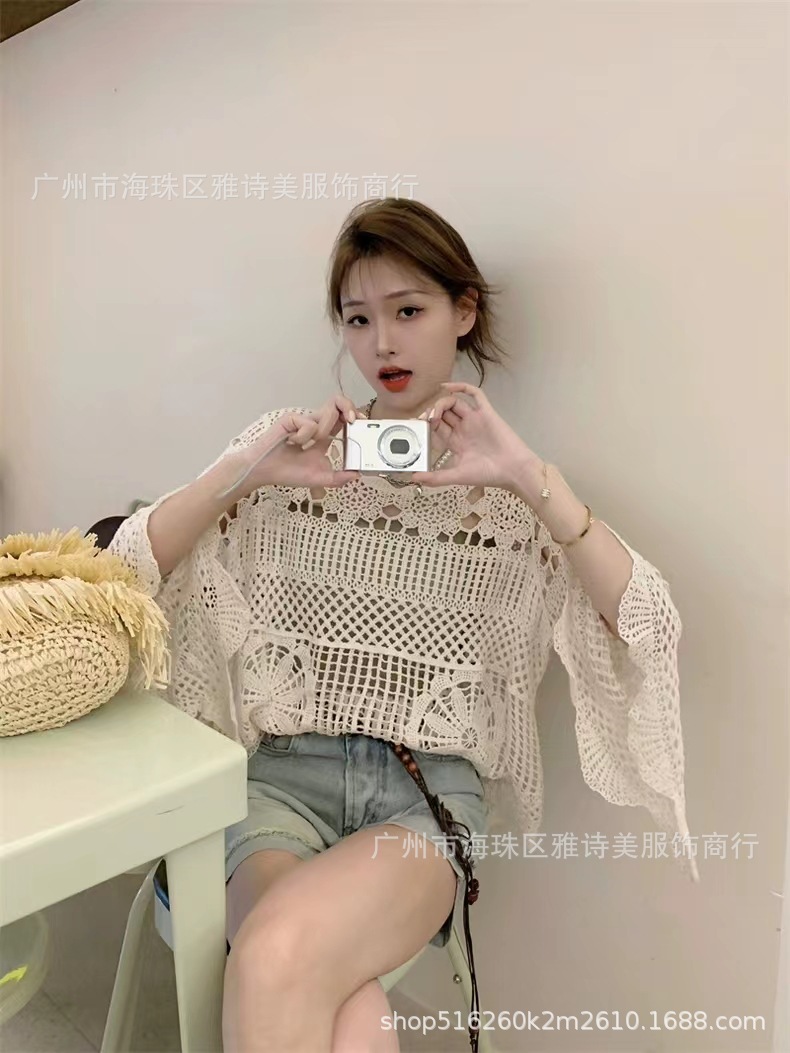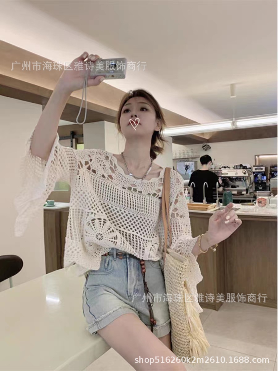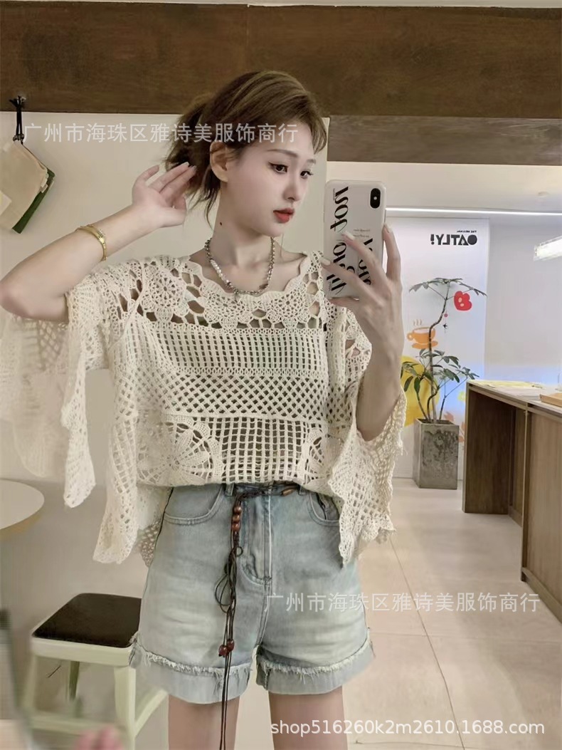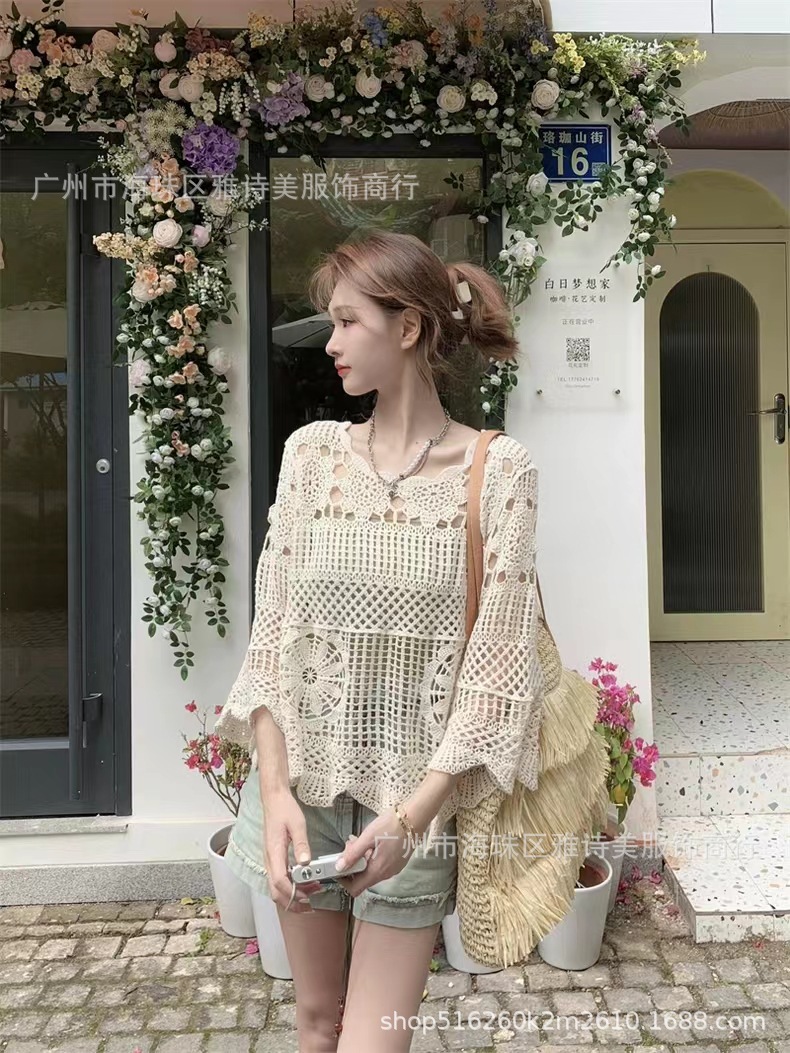 빈티지 게으른 스타일 중공 크로 셰 뜨개질 뿔 소매 스웨터 여성의 가을 새로운 시크 느슨한 슬림 핏 블라우스 탑스토어 가기