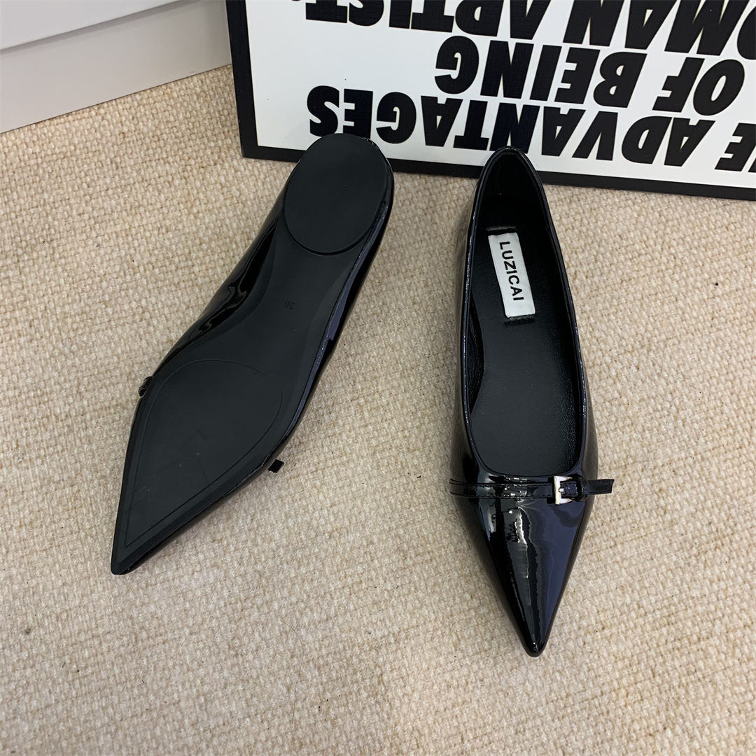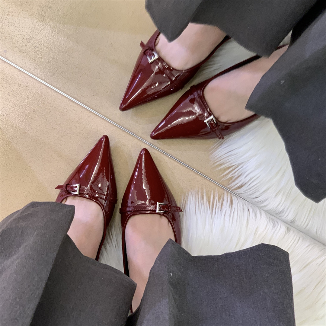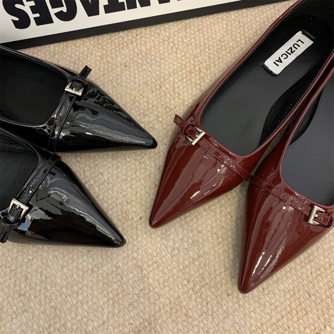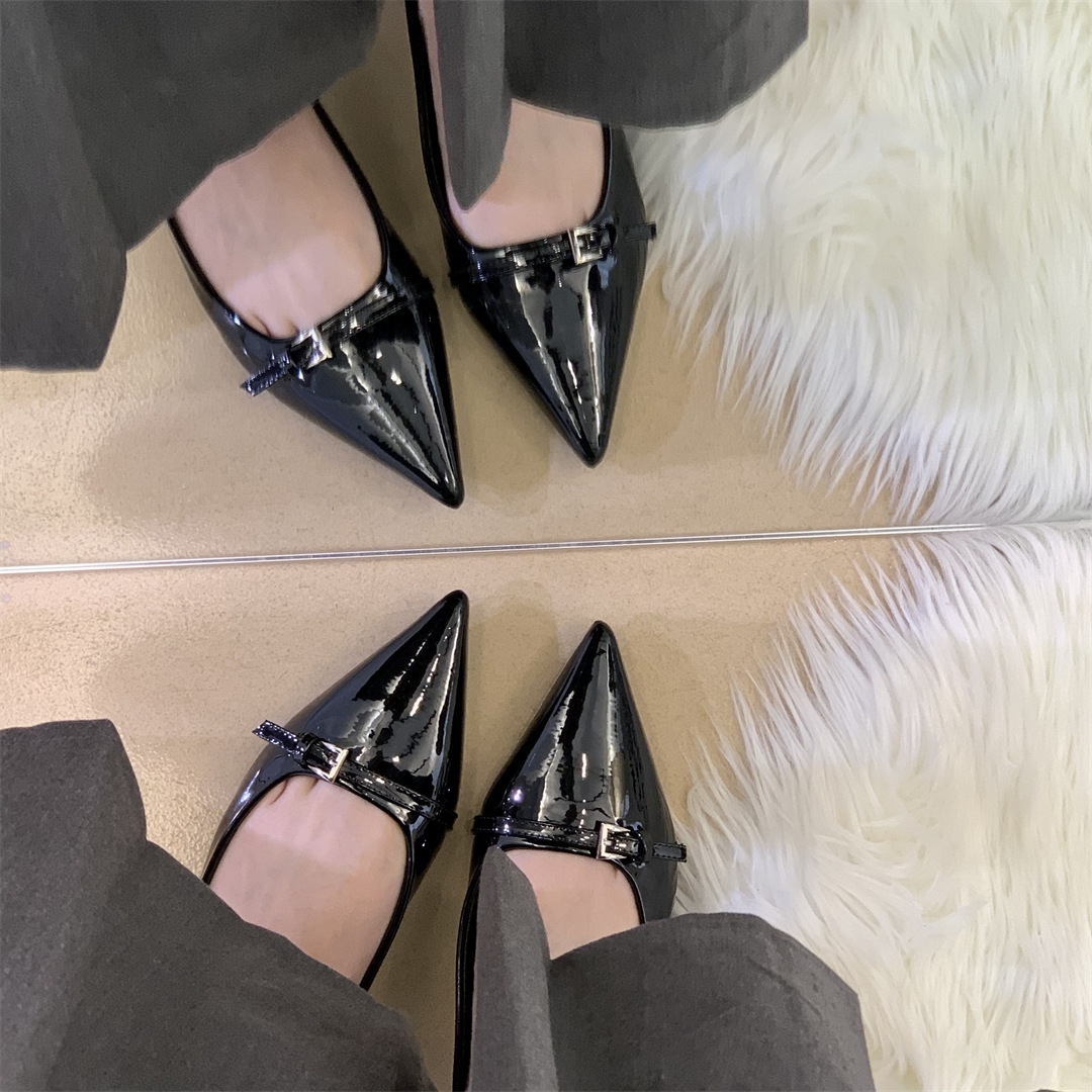 2025년 여름 신상 여성용 프렌치 스타일 블랙 뾰족코 구두, 봄/가을용 에어리 페이턴트 가죽 슈즈스토어 가기