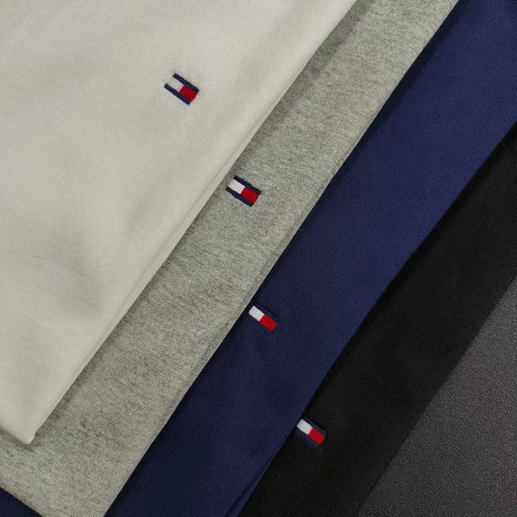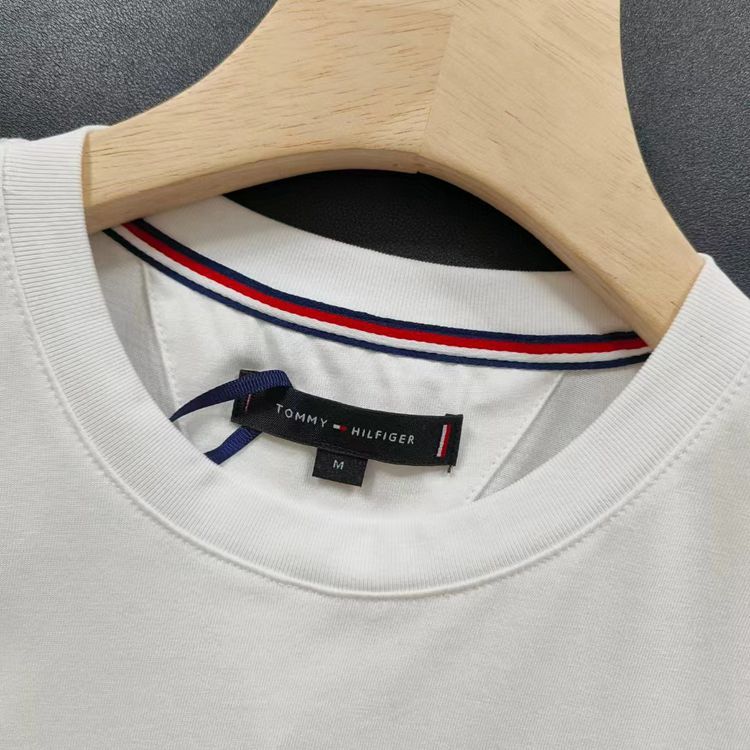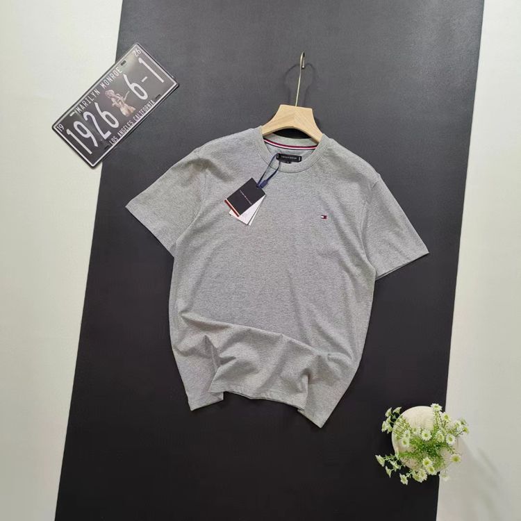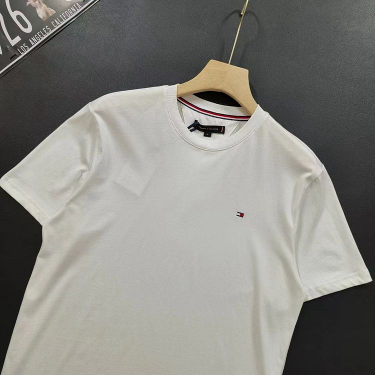 재고 여름 토미 남성 캐주얼 심플 솔리드 컬러 자수 라벨 라운드 넥 풀오버 느슨한 반팔 티셔츠스토어 가기