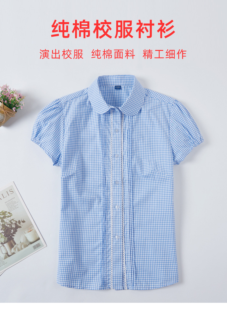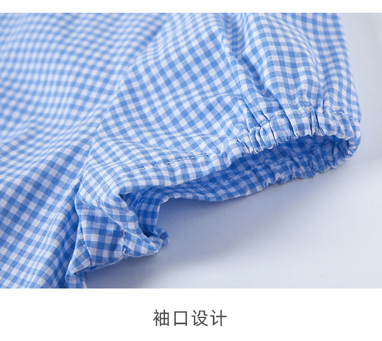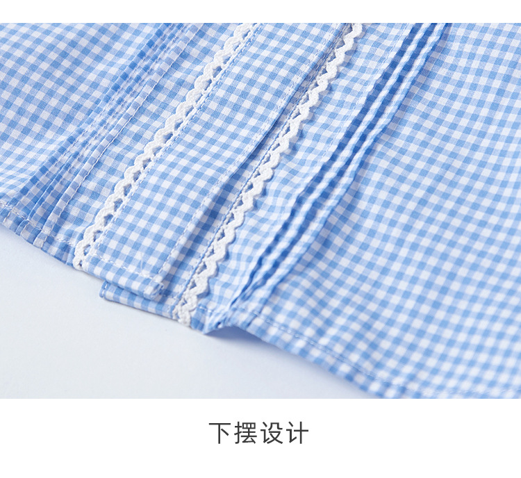 여름 여아 파란색과 흰색 격자 무늬 이쑤시개 주름 레이스 스티치 작은 라운드 넥 여성용 반팔 셔츠 퍼프 슬리브 셔츠