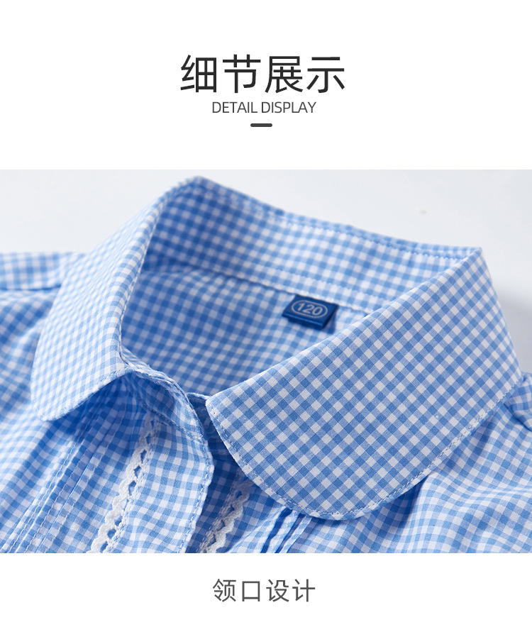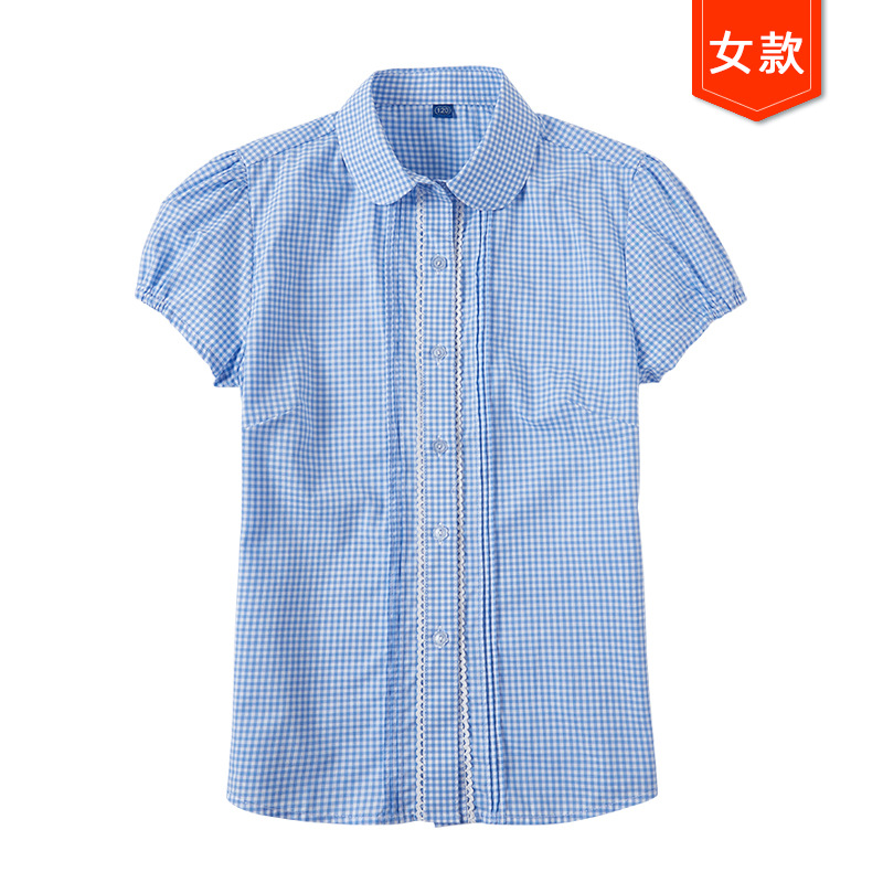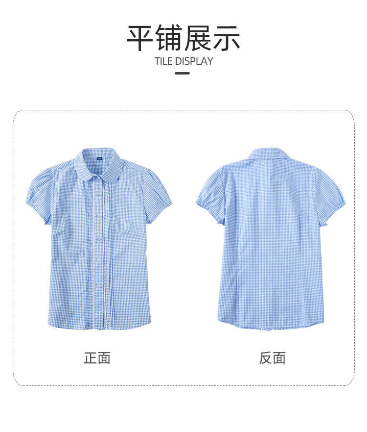 여름 여아 파란색과 흰색 격자 무늬 이쑤시개 주름 레이스 스티치 작은 라운드 넥 여성용 반팔 셔츠 퍼프 슬리브 셔츠스토어 가기