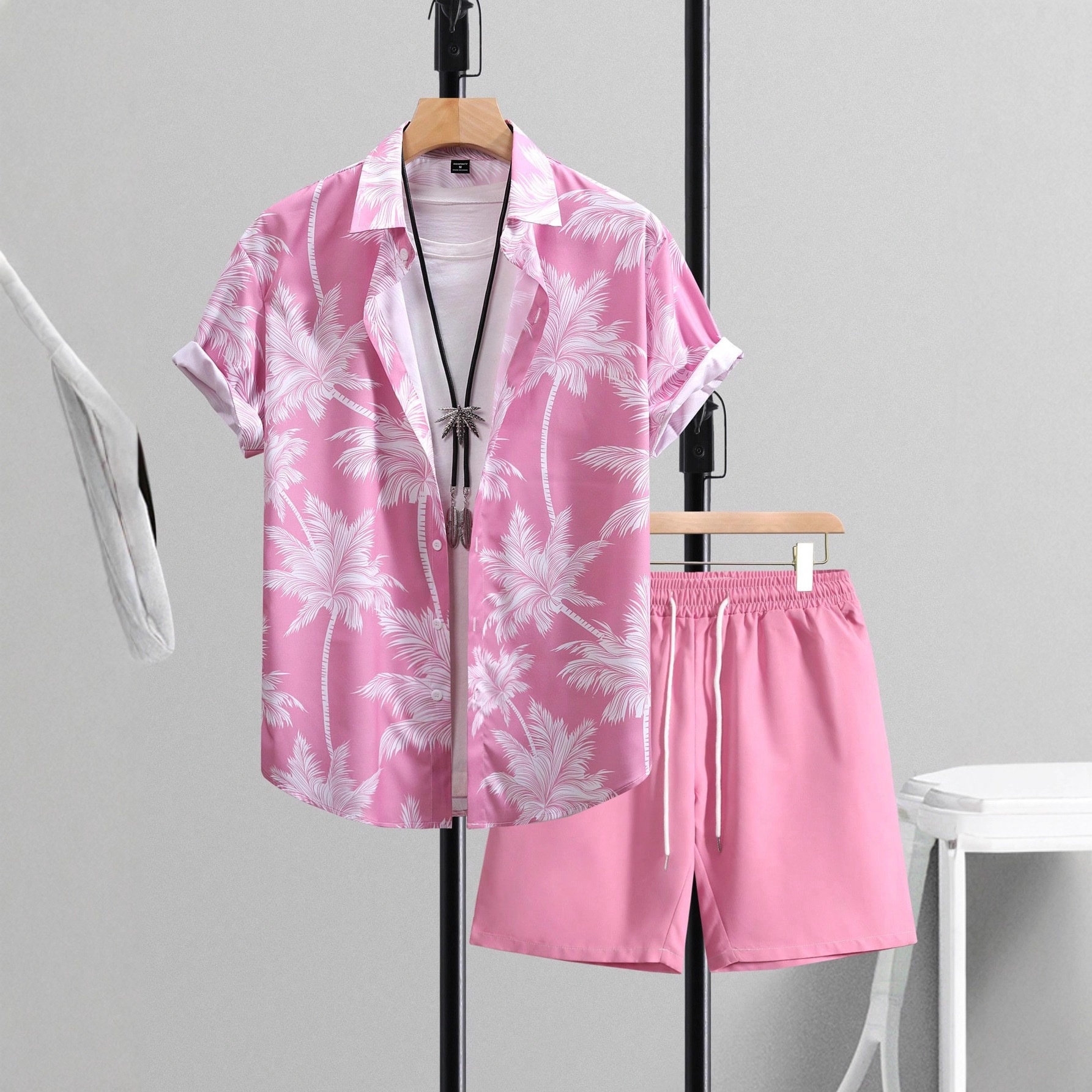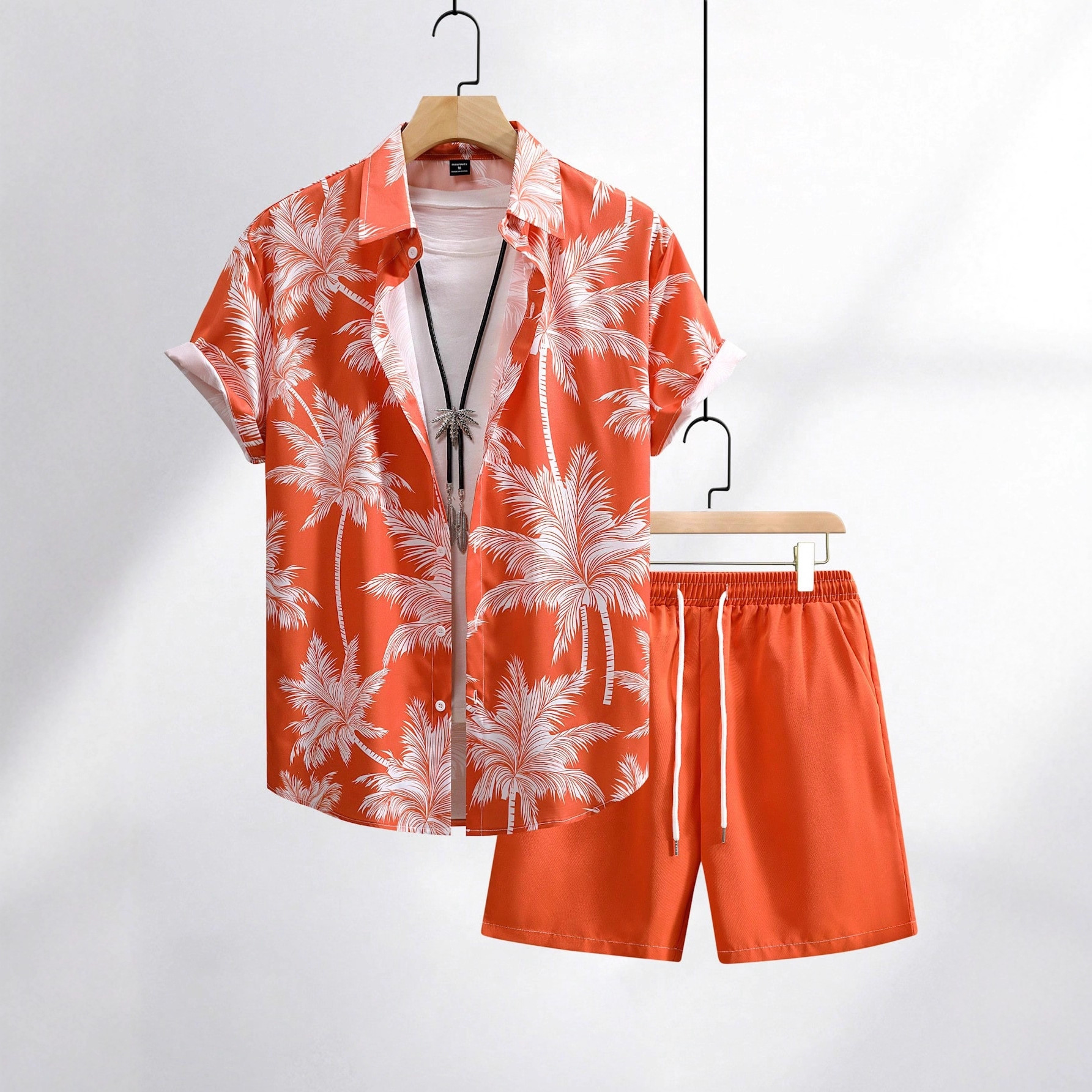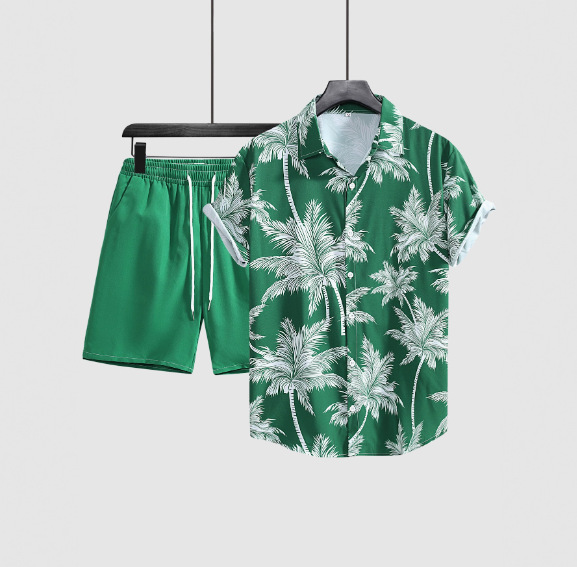 새로운 스타일의 남성용 반팔 셔츠, 얇은 캐주얼 휴가용 녹색 코코넛 나무 프린트, 해외배송 청년 셔츠 도매스토어 가기