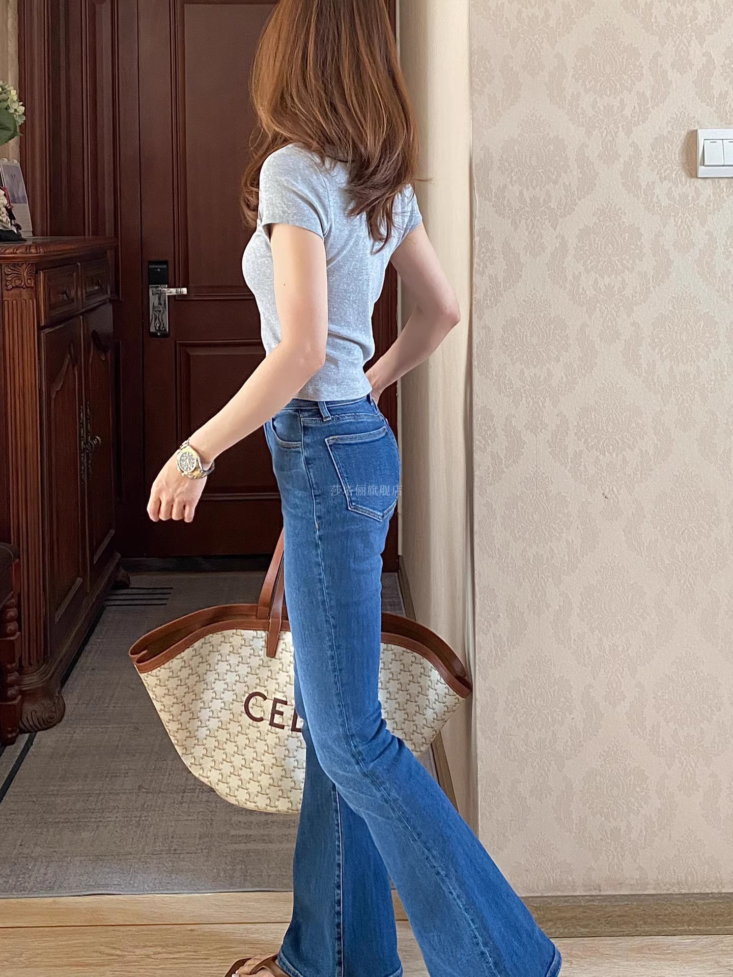 좋은 몸매를 강조하세요! 얇은 4방향 스트레치 마이크로 플레어 청바지 여성용 봄 스타일 작은 체형을 위한 슬림핏 바지
