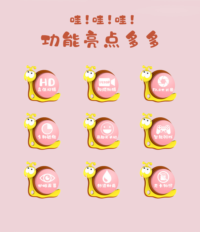 拍照、摄像、4倍变焦、相册、大头贴、滤镜(共44张)、音量大小调节、5款游戏、MP3功能、多种语言可选、可定时拍照可更换屏幕背景图、素描功能。