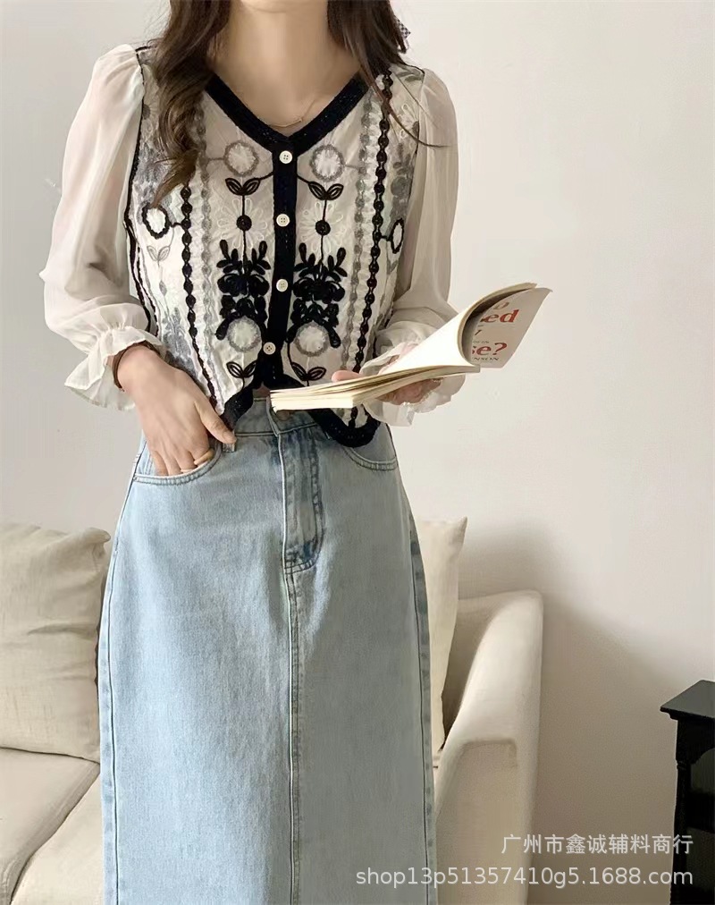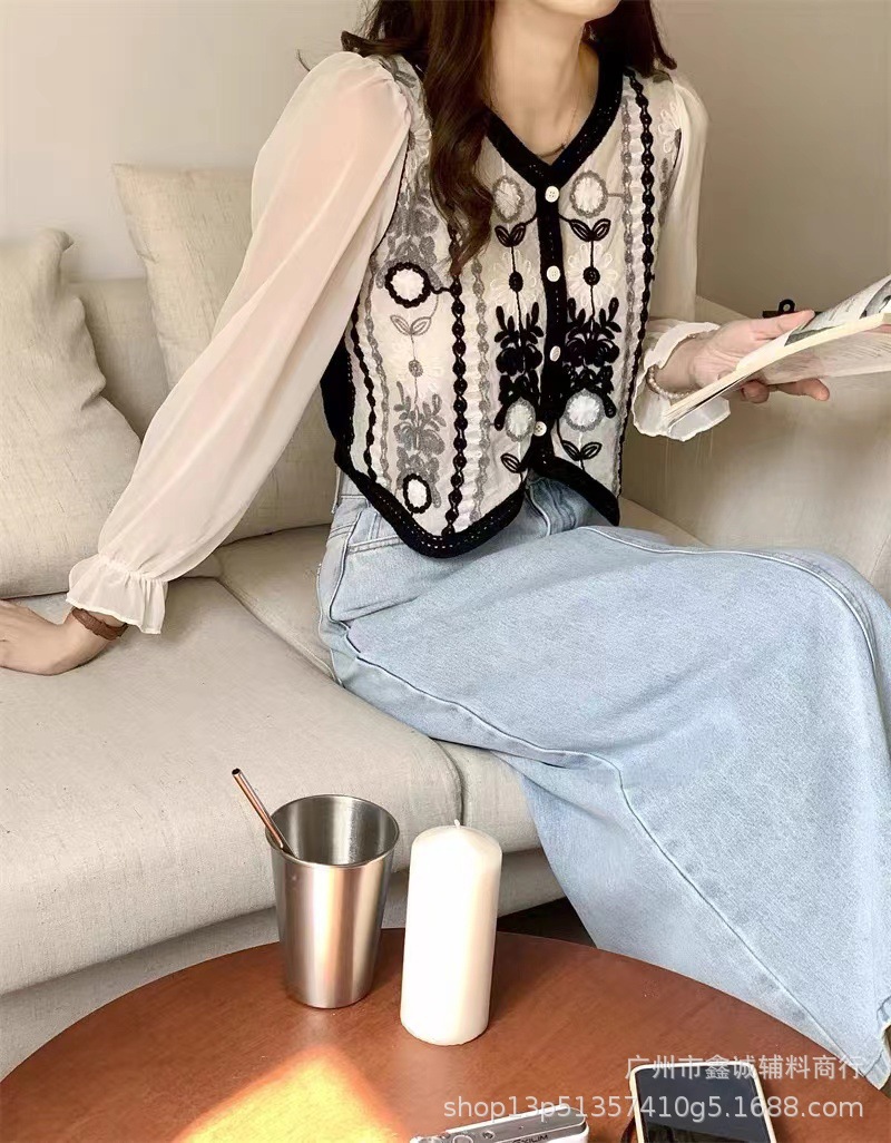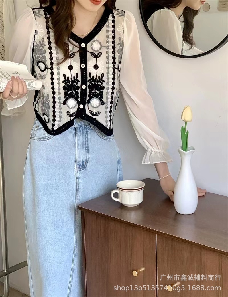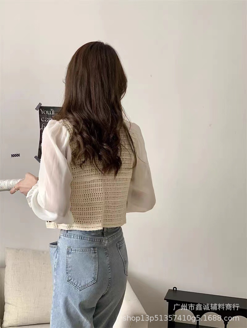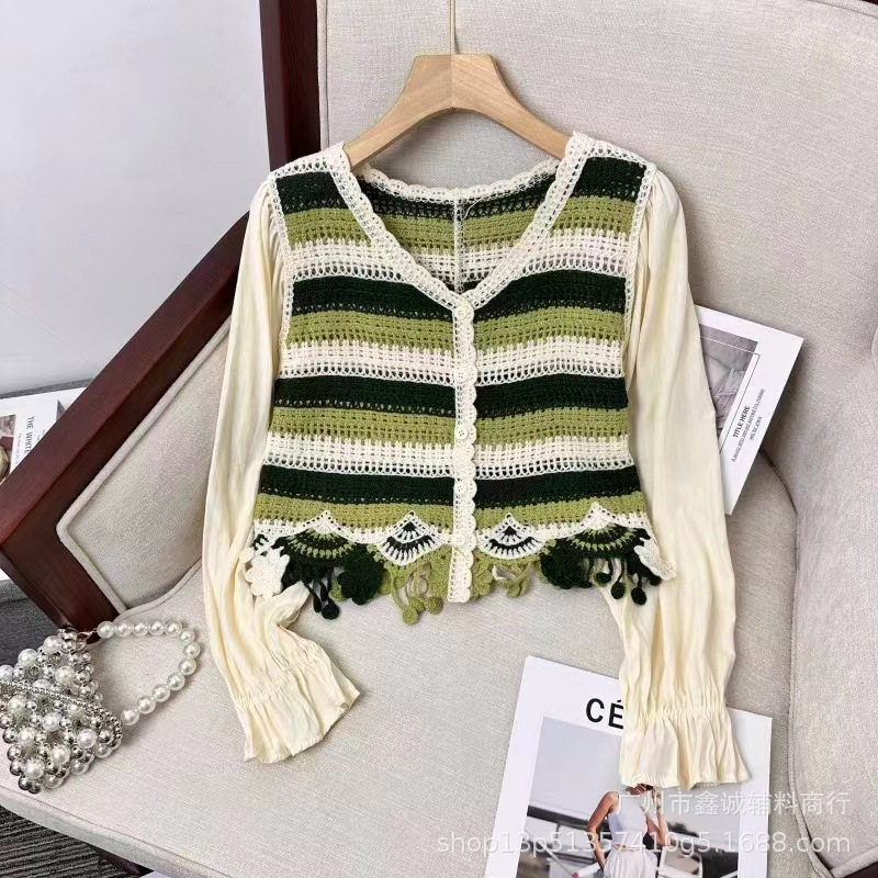 프랑스 스타일 달콤한 세련된 복고풍 통근 스타일 한국 스타일 대비 색상 중공 크로 셰 뜨개질 틈새 쉬폰 여성용 긴 소매 가디건 탑