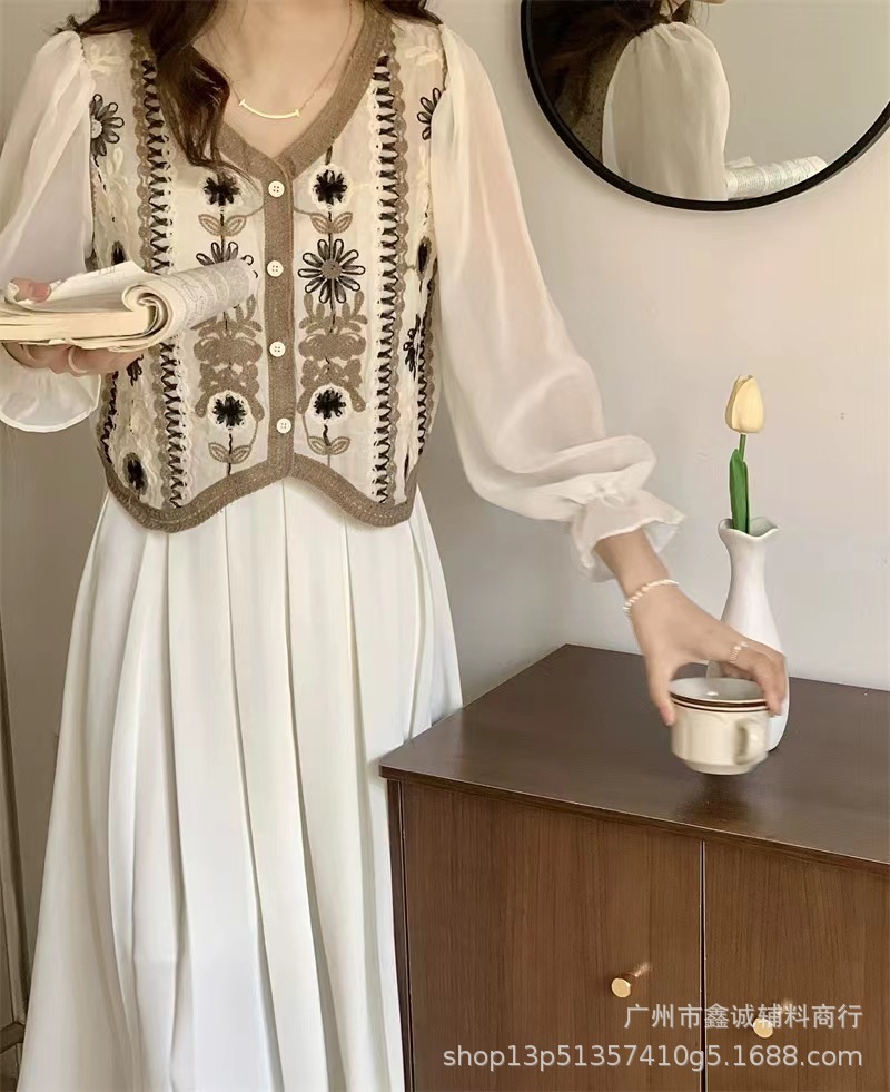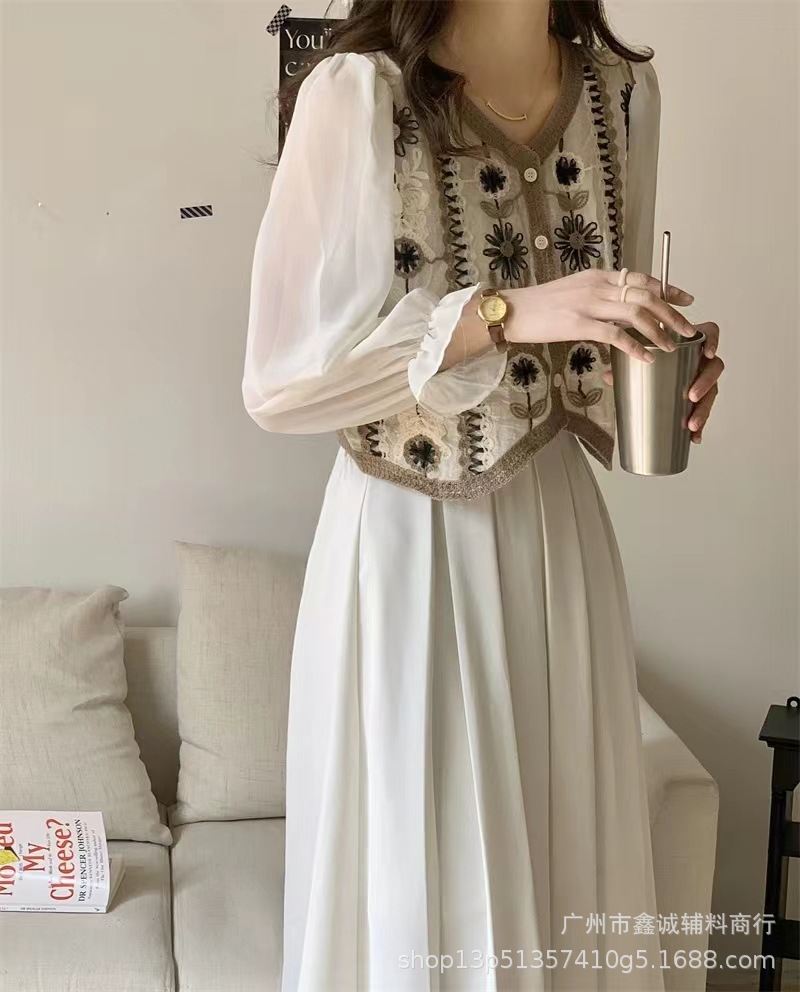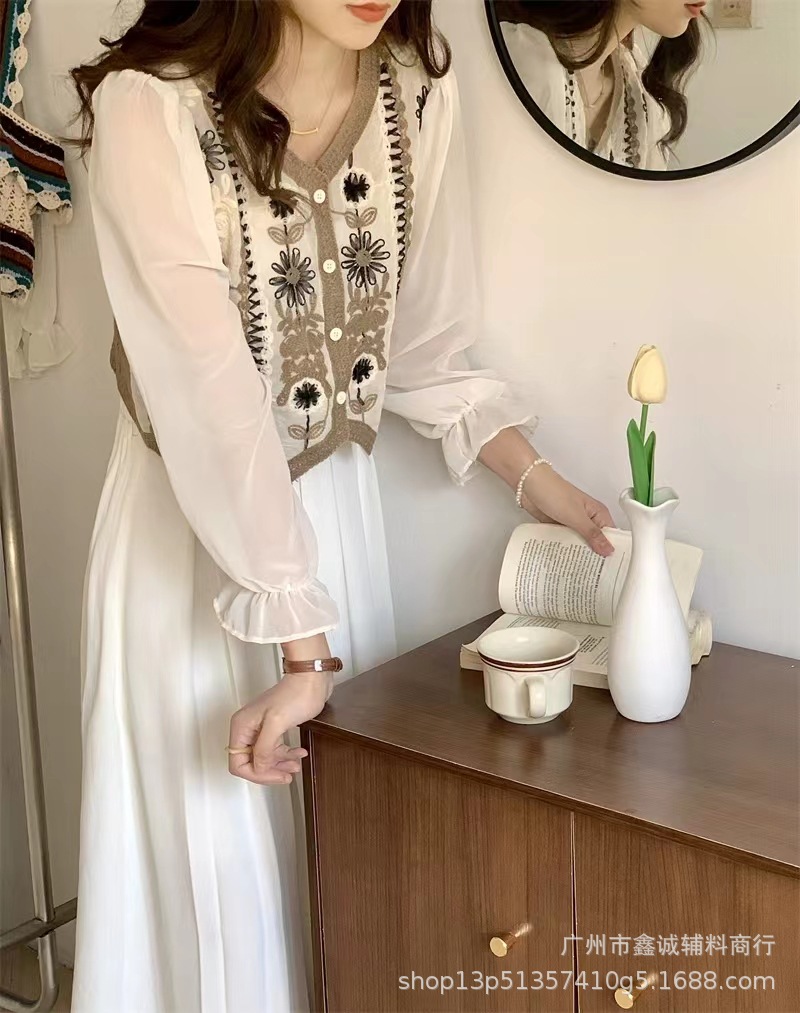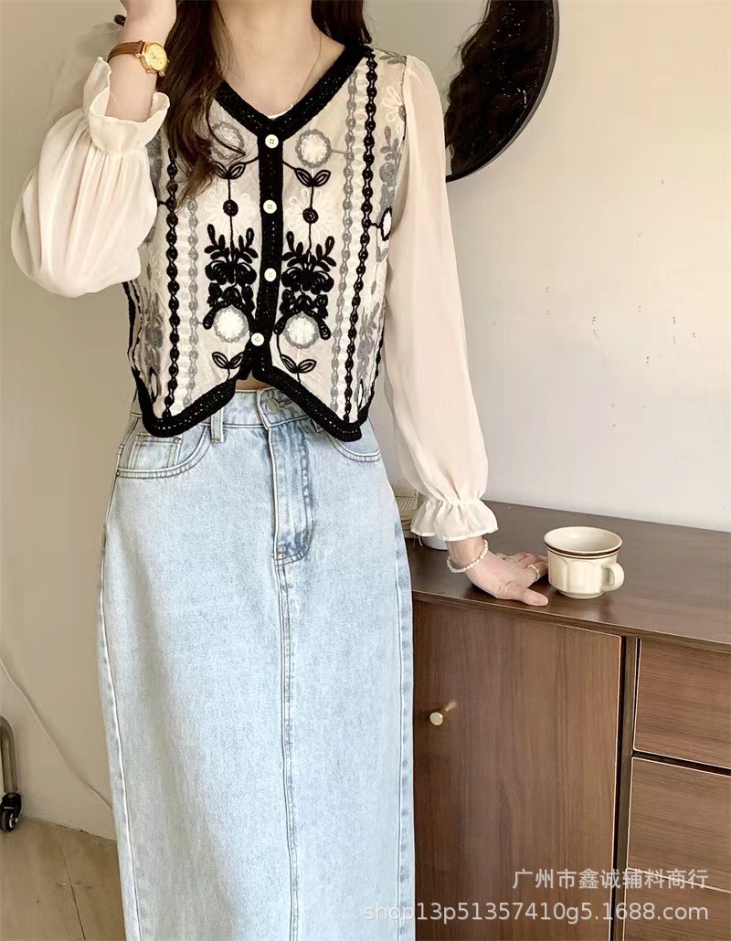 프랑스 스타일 달콤한 세련된 복고풍 통근 스타일 한국 스타일 대비 색상 중공 크로 셰 뜨개질 틈새 쉬폰 여성용 긴 소매 가디건 탑