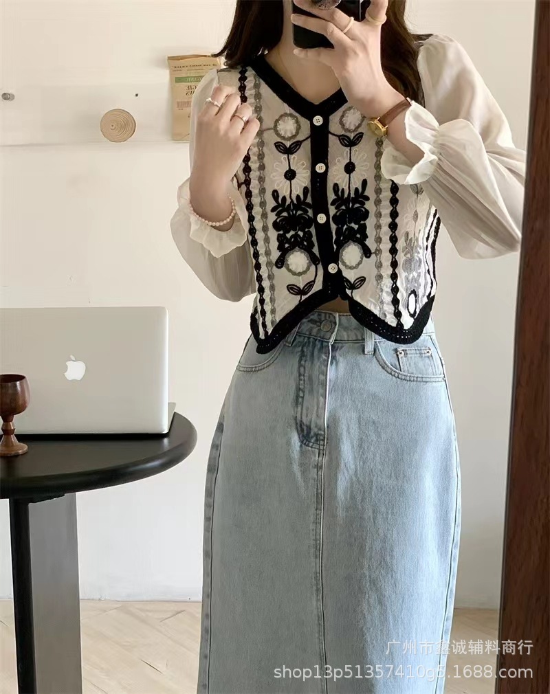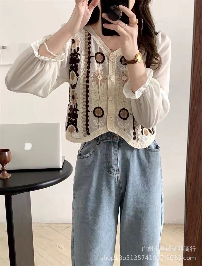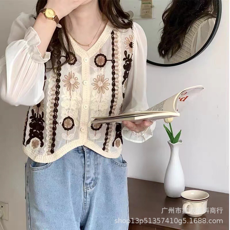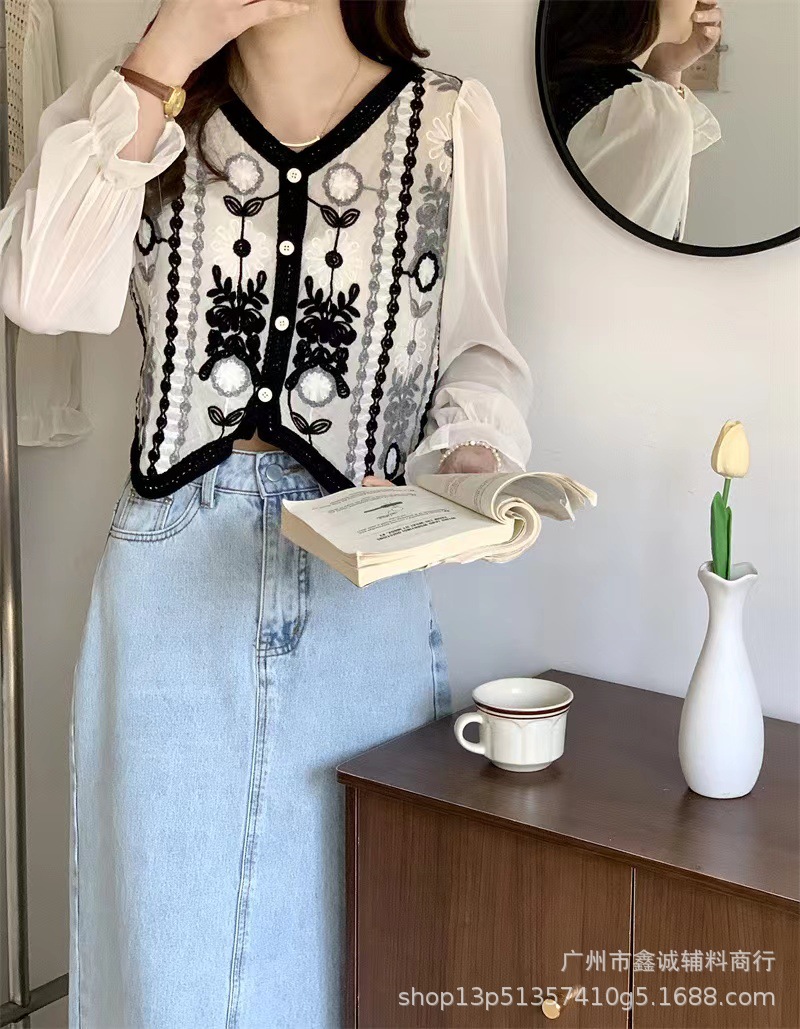 프랑스 스타일 달콤한 세련된 복고풍 통근 스타일 한국 스타일 대비 색상 중공 크로 셰 뜨개질 틈새 쉬폰 여성용 긴 소매 가디건 탑스토어 가기