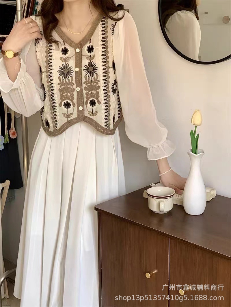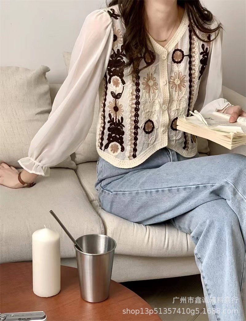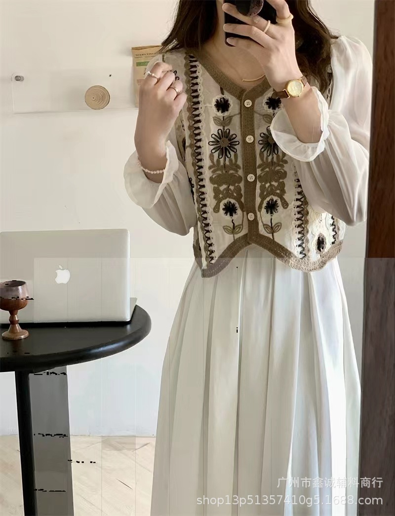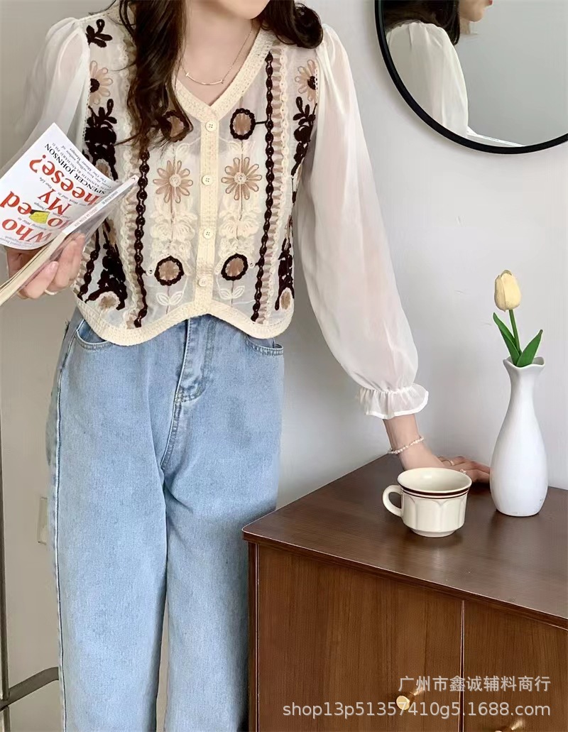 프랑스 스타일 달콤한 세련된 복고풍 통근 스타일 한국 스타일 대비 색상 중공 크로 셰 뜨개질 틈새 쉬폰 여성용 긴 소매 가디건 탑스토어 가기