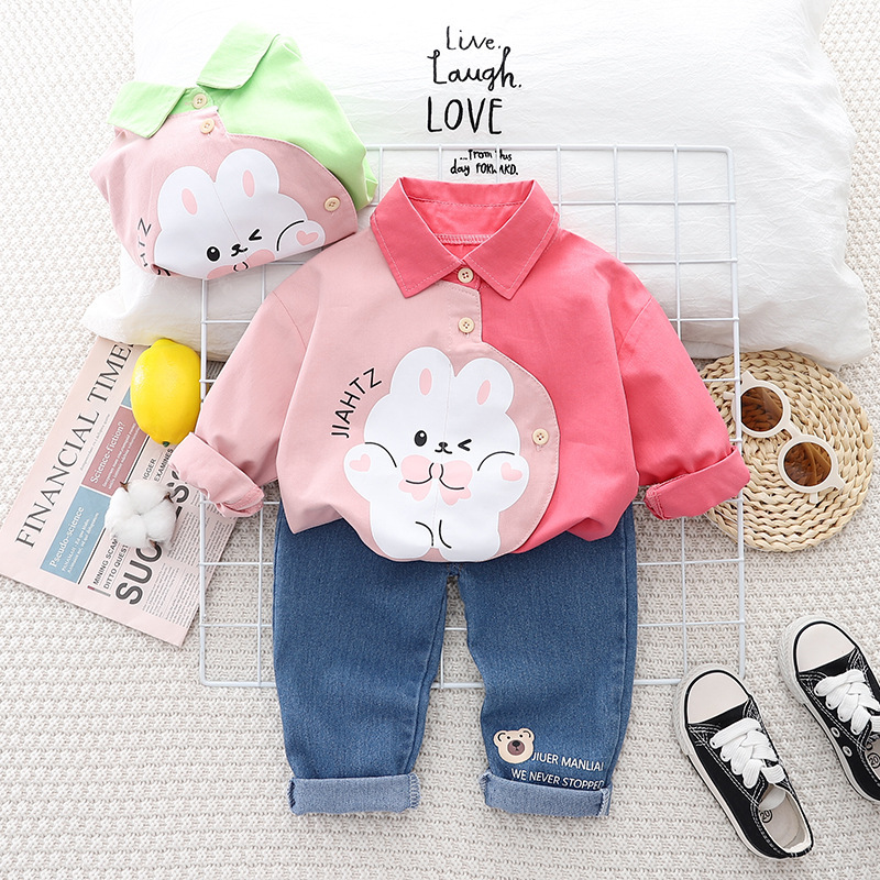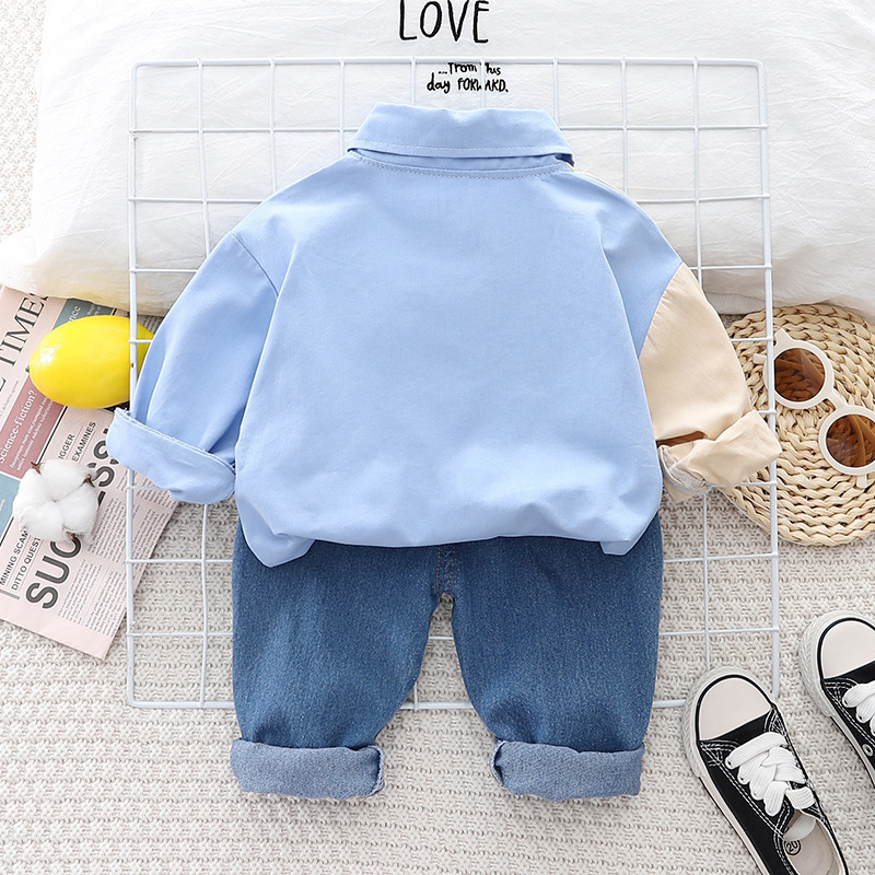 2023 봄 새 소년 옷깃 셔츠 긴 소매 세트 소년 아기 캐주얼 데님 바지 머리를위한 투피스 세트스토어 가기