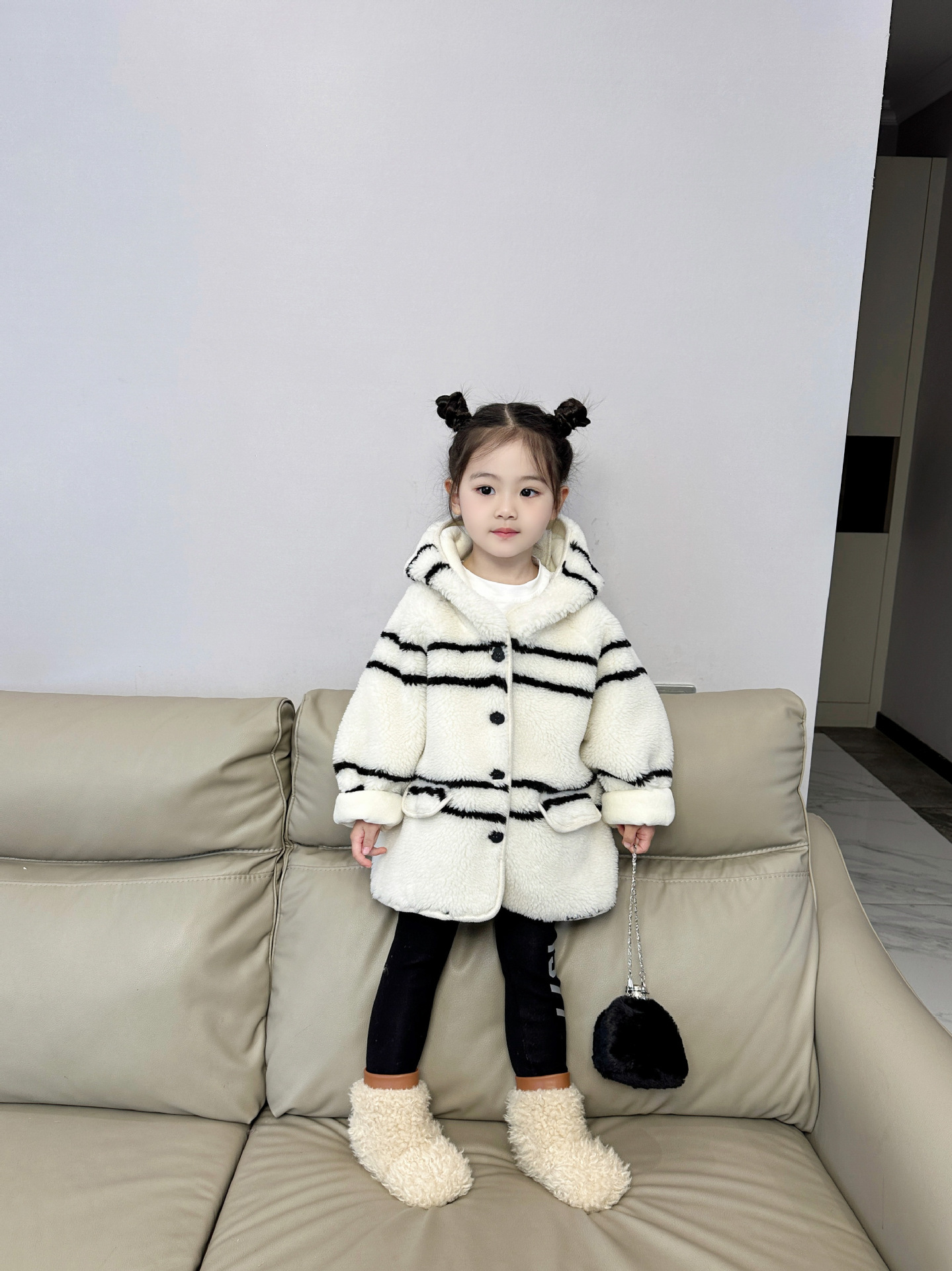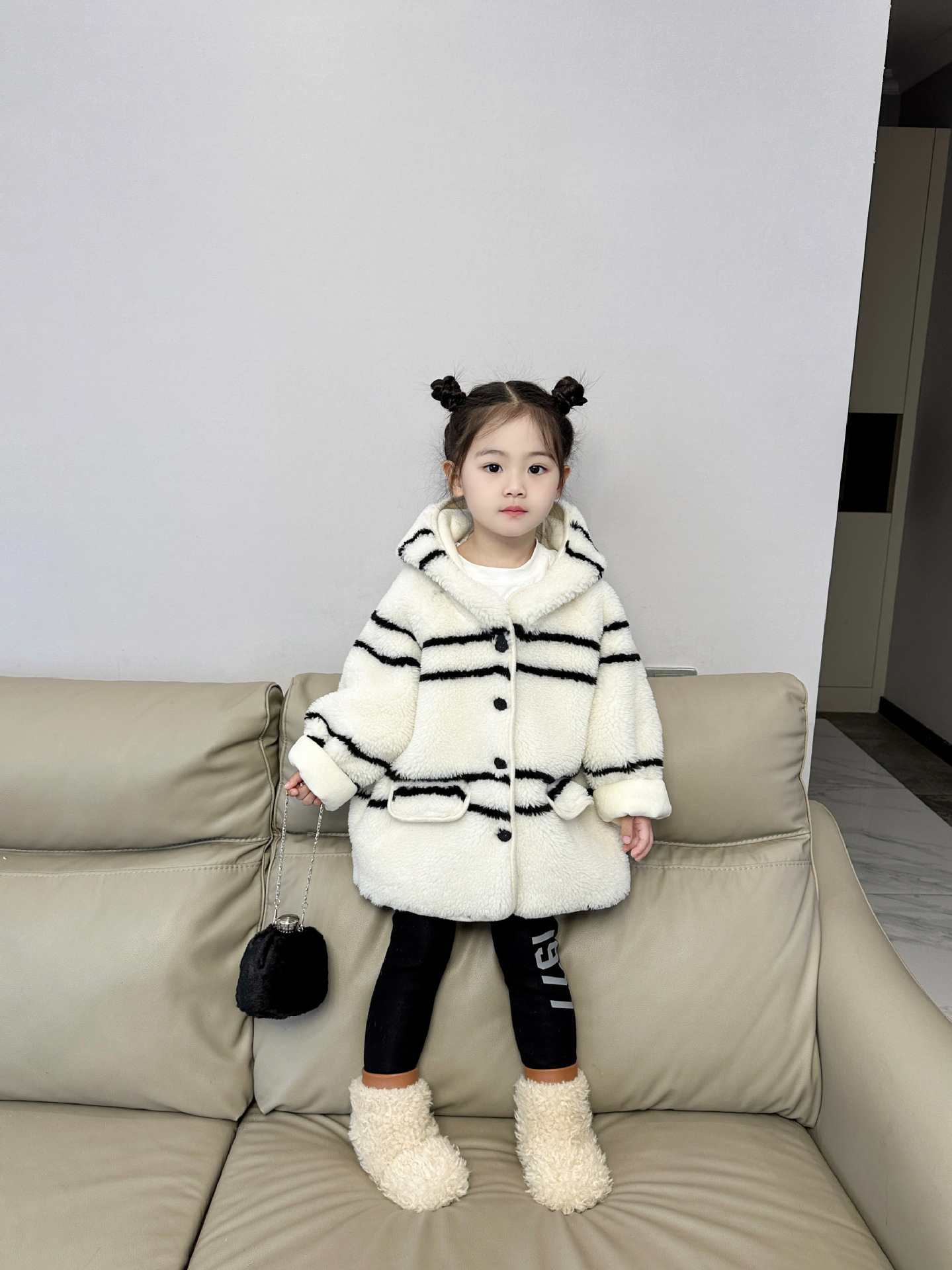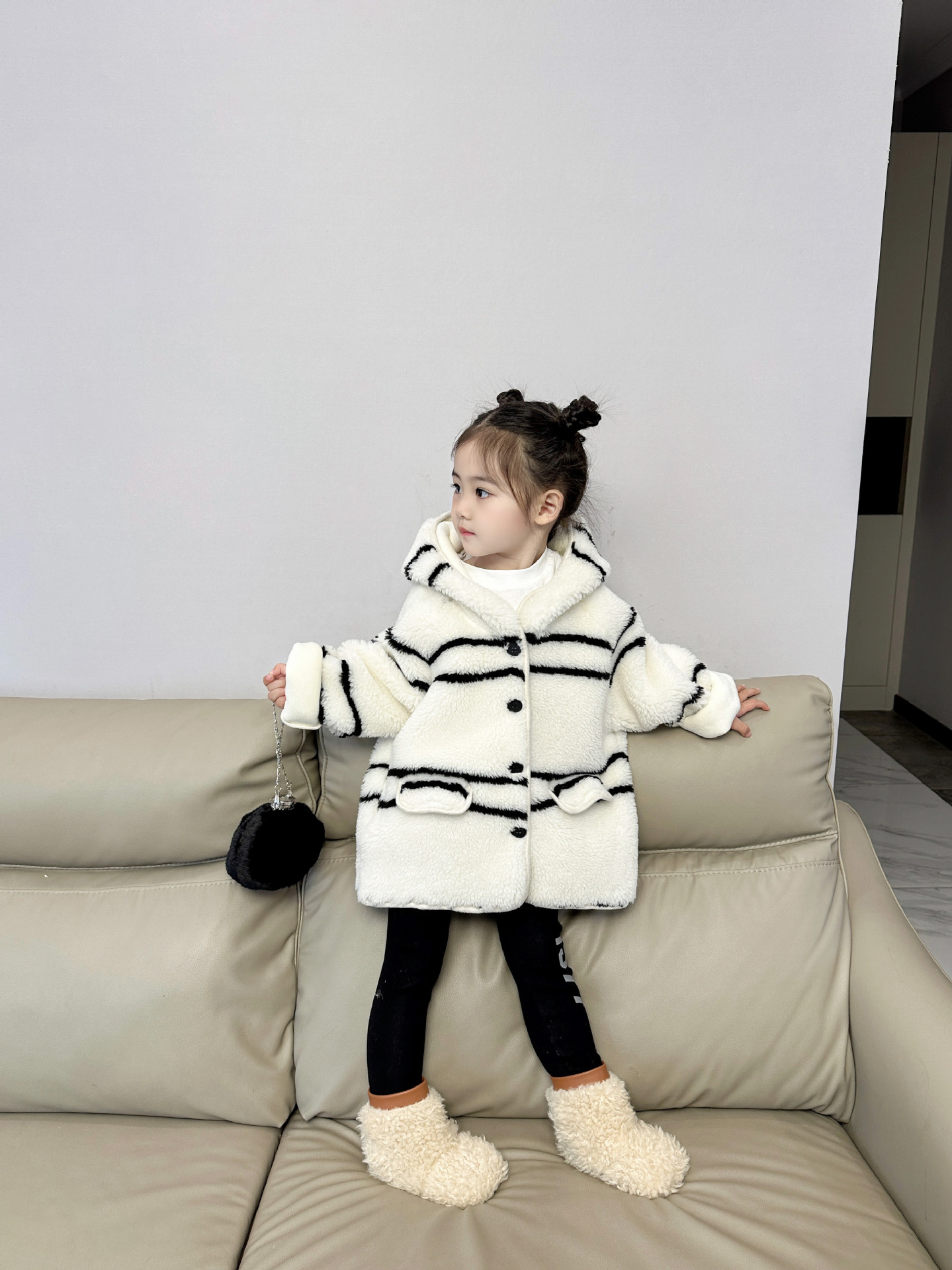 반품 불가, 정가 65, 여아용 스트라이프 퍼 후드 플리스 재킷, 겨울용 아동용 패셔너블하고 다재다능한 스타일스토어 가기