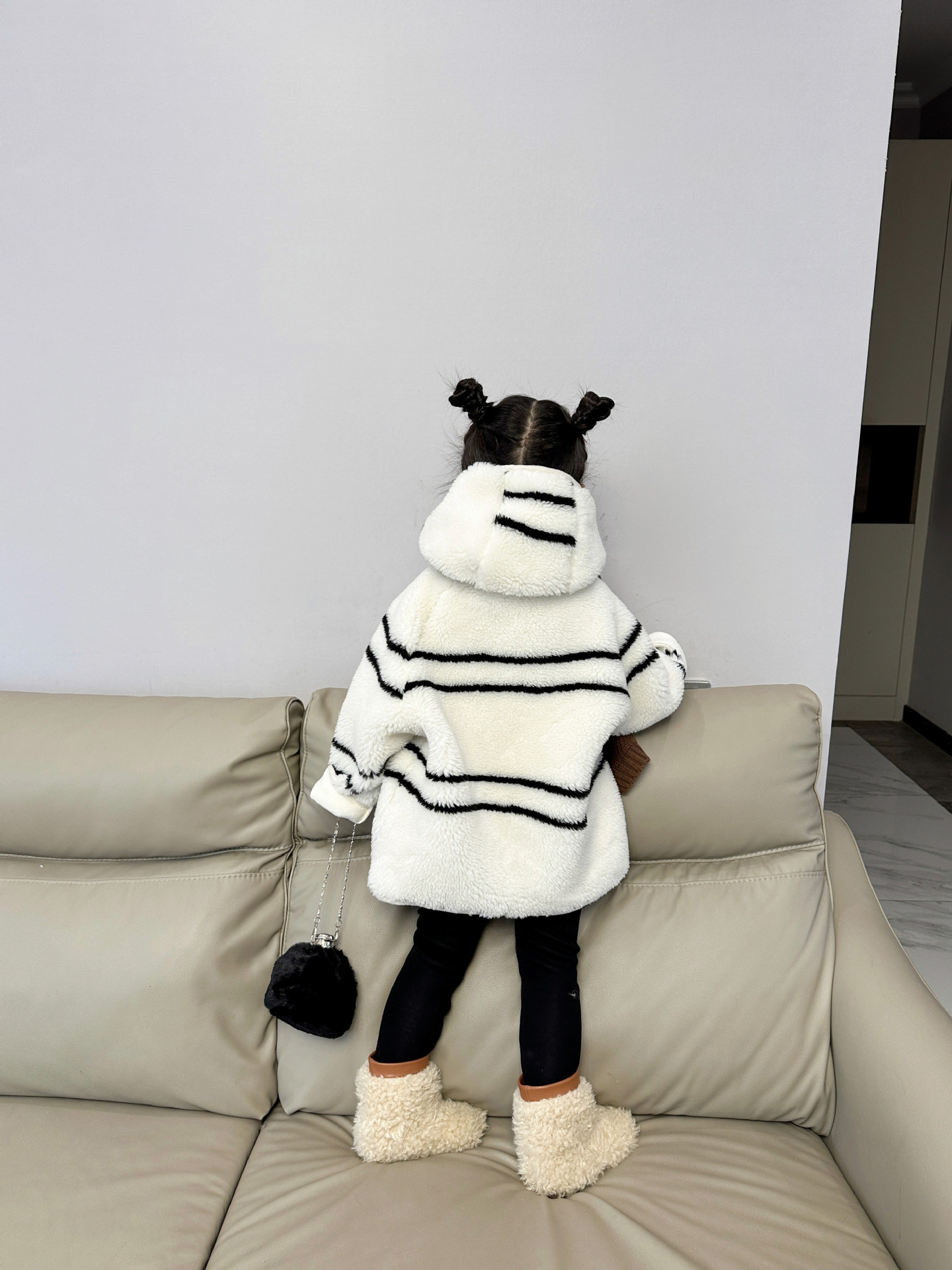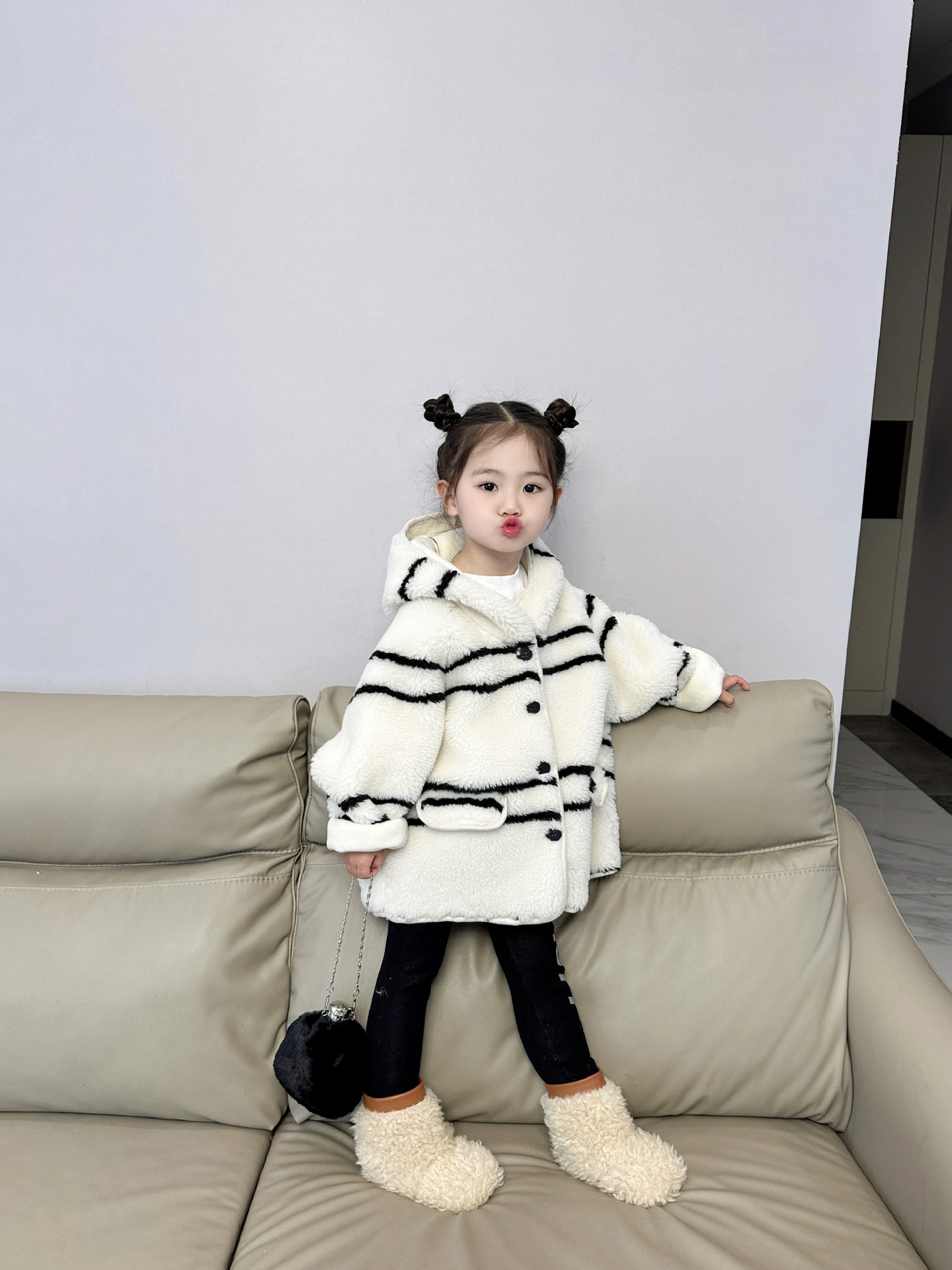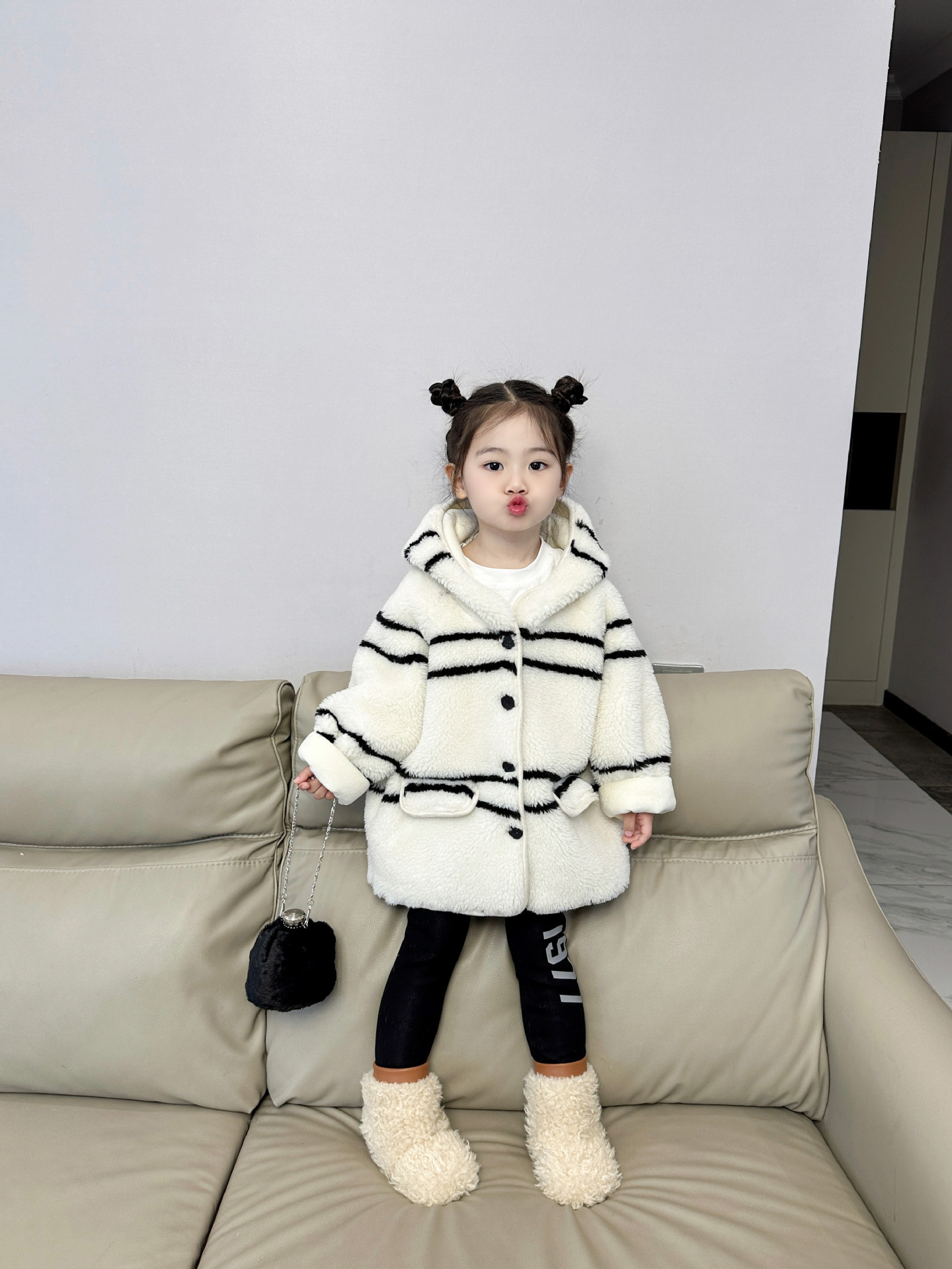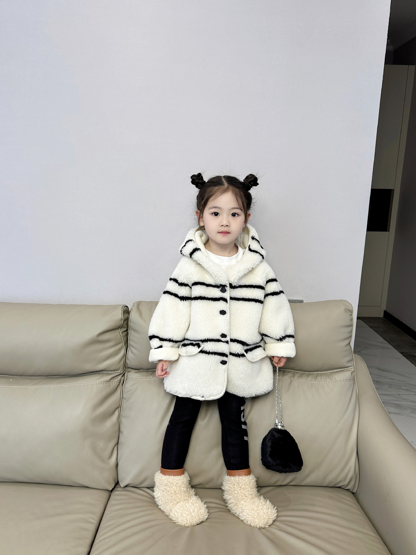 반품 불가, 정가 65, 여아용 스트라이프 퍼 후드 플리스 재킷, 겨울용 아동용 패셔너블하고 다재다능한 스타일스토어 가기