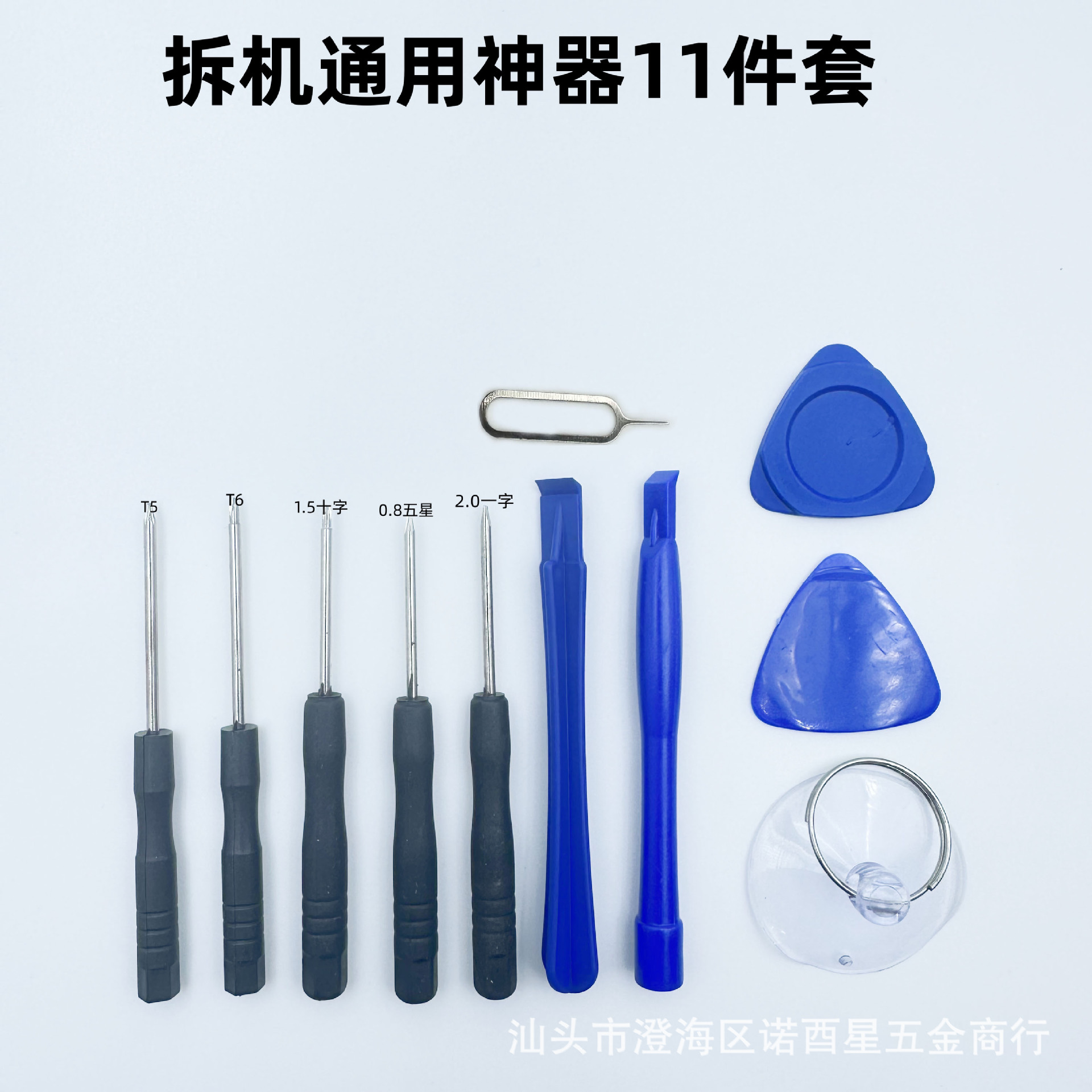 11件套配件:1.5十字螺丝刀,一字螺丝刀,0.8五星螺丝刀,T5螺丝刀,T6螺丝刀,拆机方形撬棒,薄片,厚片,吸盘,卡针