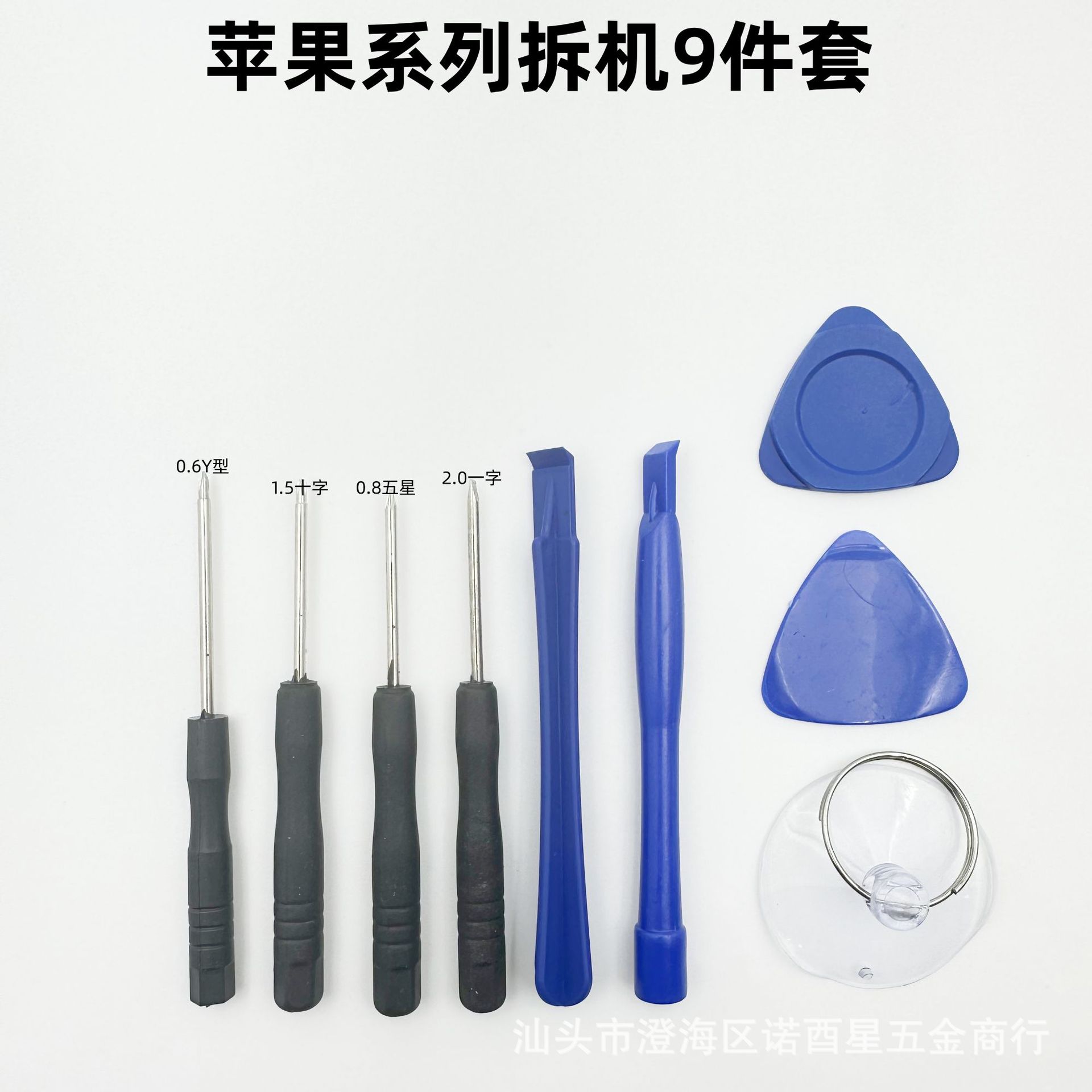 9件套配件:1.5十字螺丝刀,一字螺丝刀,0.8五星螺丝刀,0.6Y螺丝刀,拆机方形撬棒,薄片,厚片,吸盘