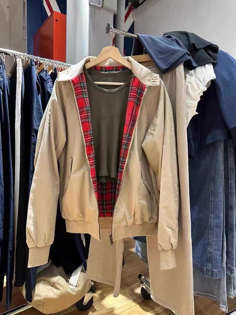 BM 새로운 스타일 스탠딩 칼라 레드 체크 무늬 느슨한 슬림 긴 소매 플라잉 재킷 여성용 bm 야구 유니폼 코트 오토바이 탑스토어 가기