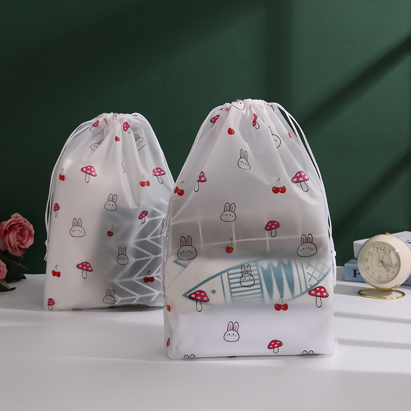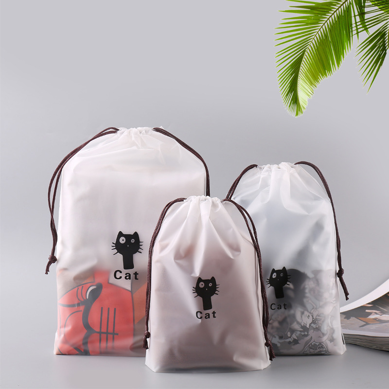 现货pe小熊束口袋简约透明磨砂收纳袋卡通小猫旅行收纳抽绳