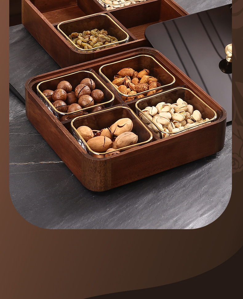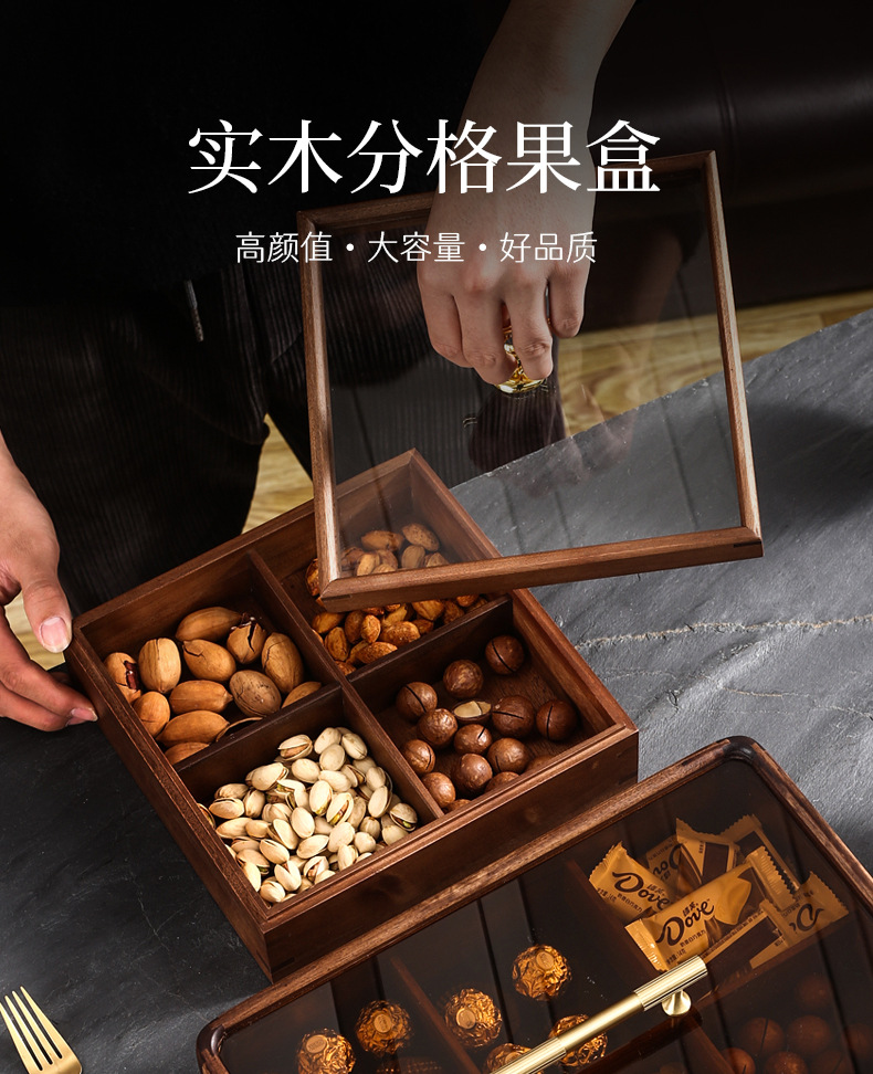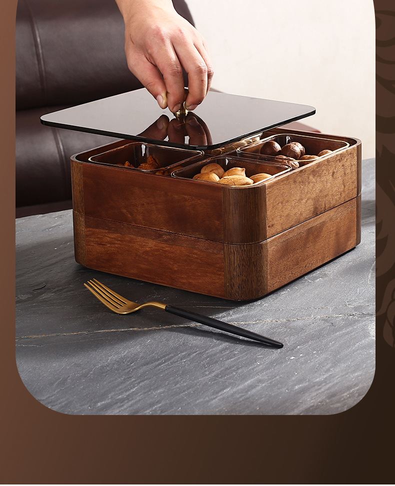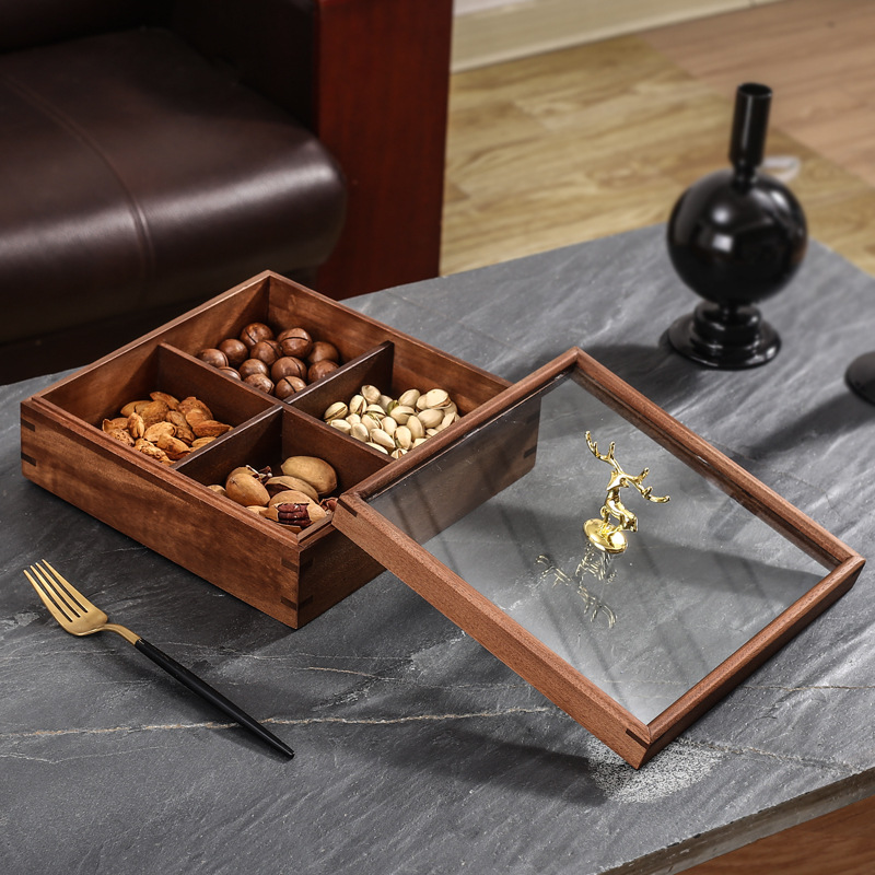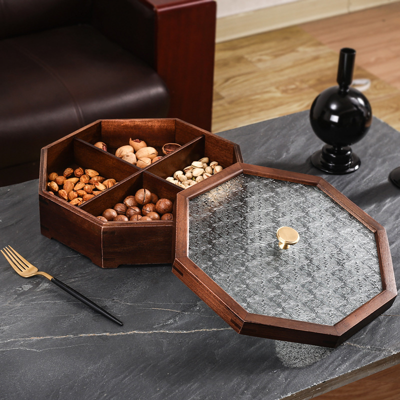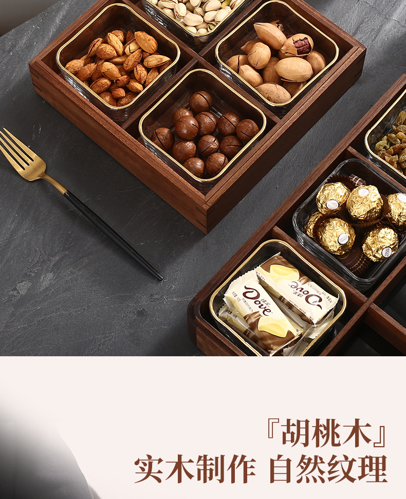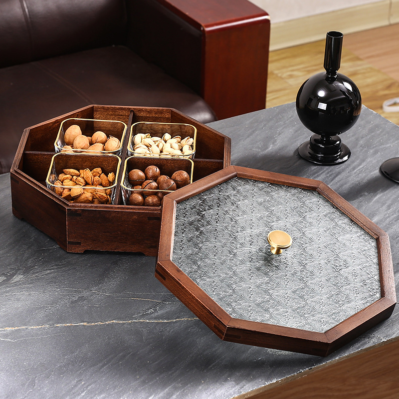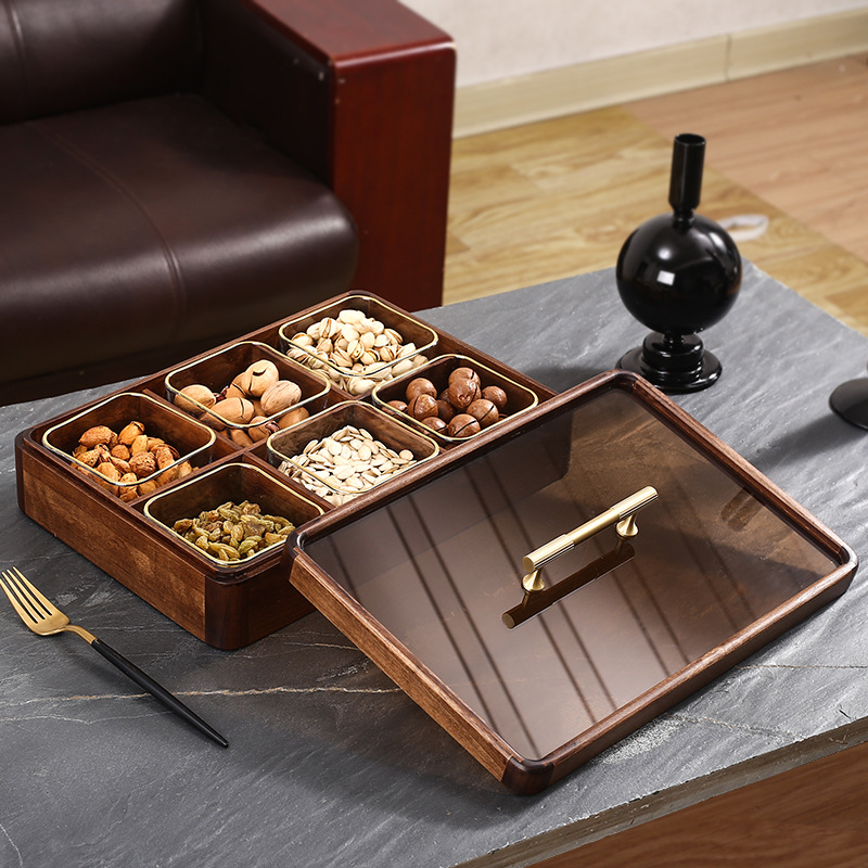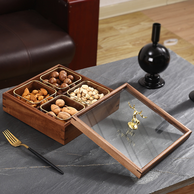 호두 분할 과일 플레이트 가정용 거실 커피 테이블 고급 단단한 나무 빛 고급 사탕 말린 과일 너트 저장 상자 유리
