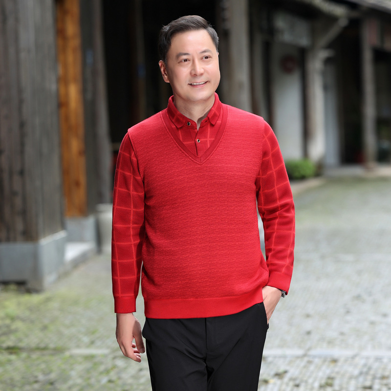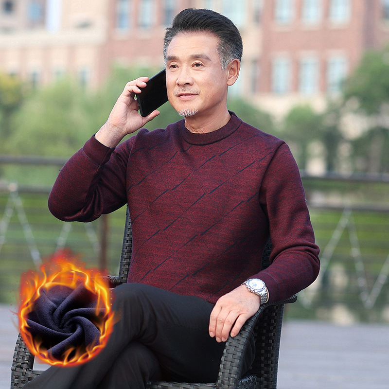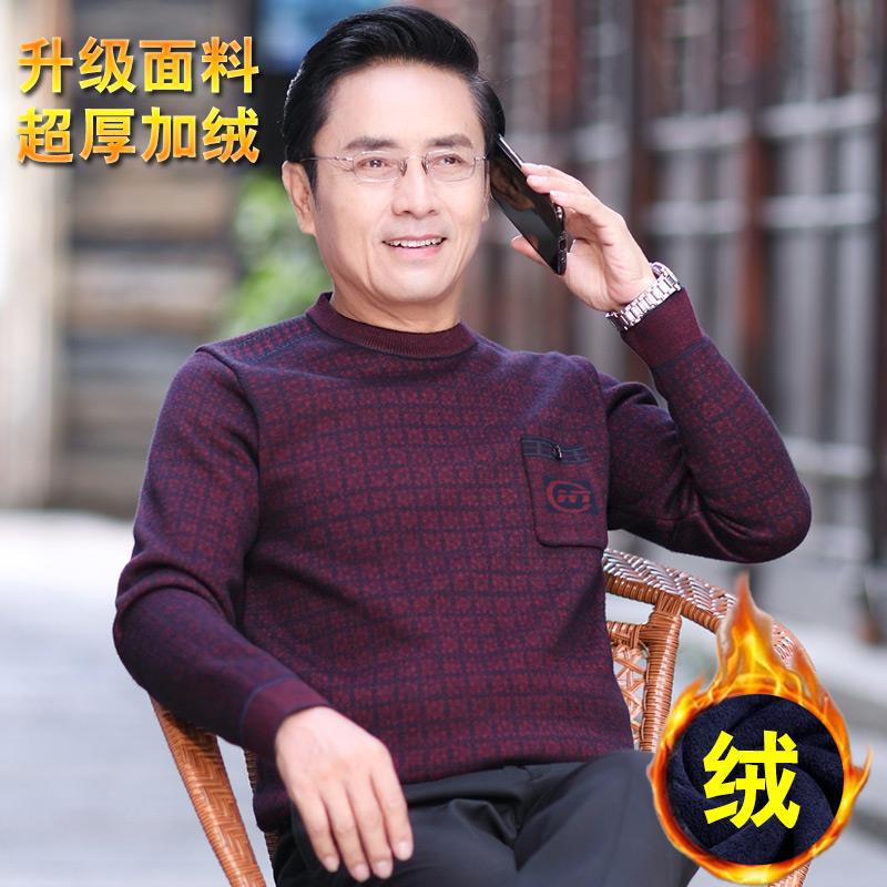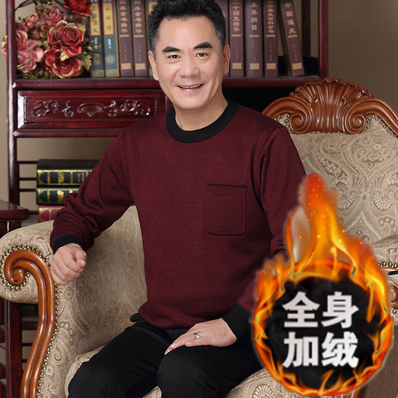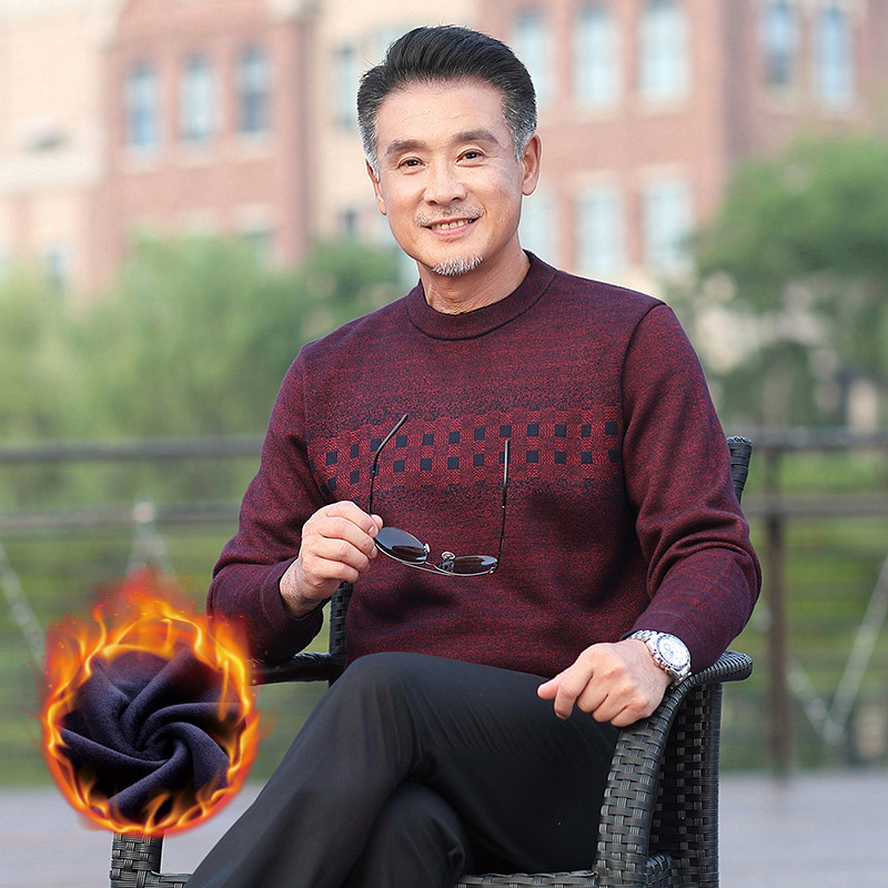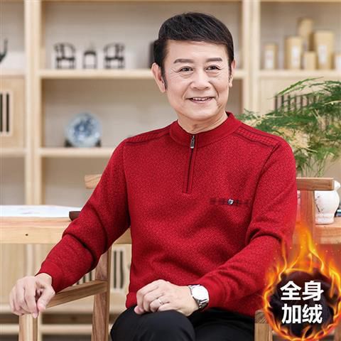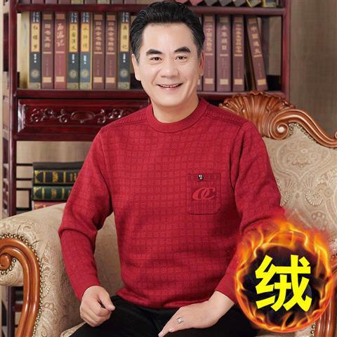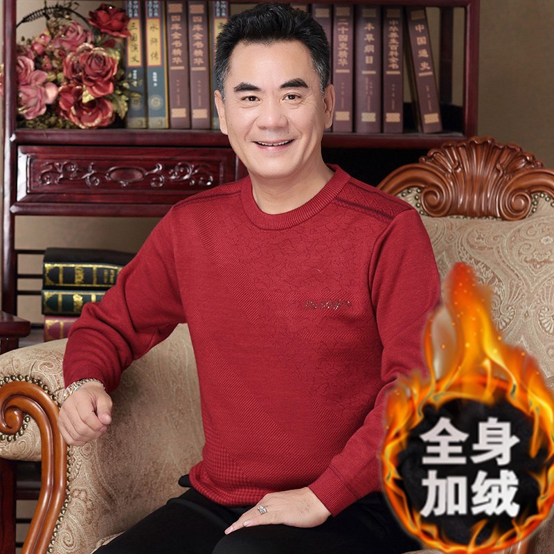 Bermingnian 큰 빨간 따뜻한 스웨터 남자의 기모 두꺼운 중년 및 노인 사람들의 가을과 겨울 옷 아빠 니트 기본 스웨터