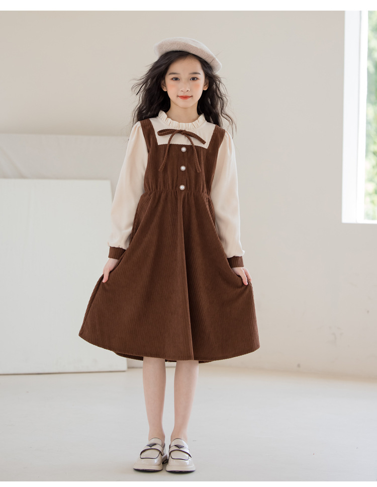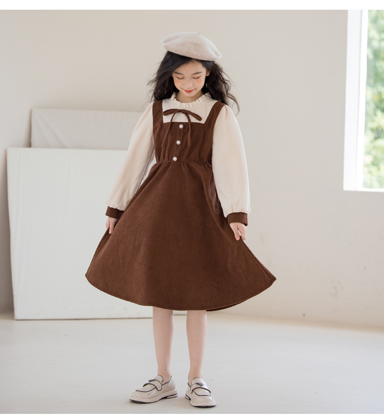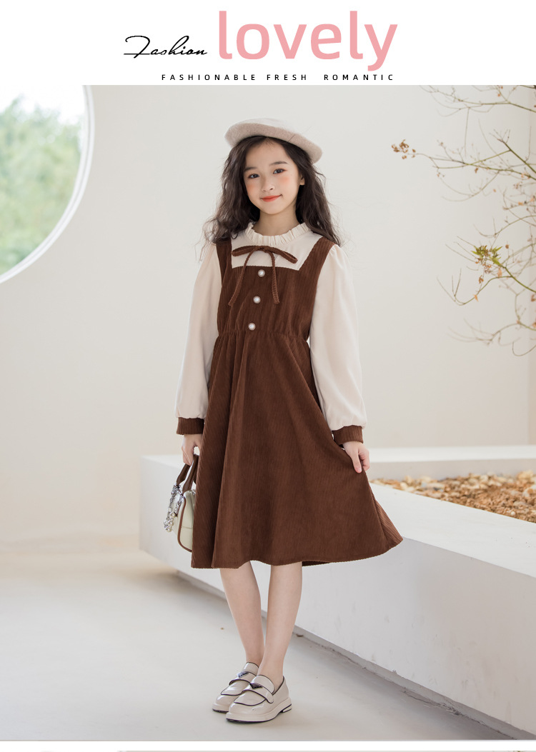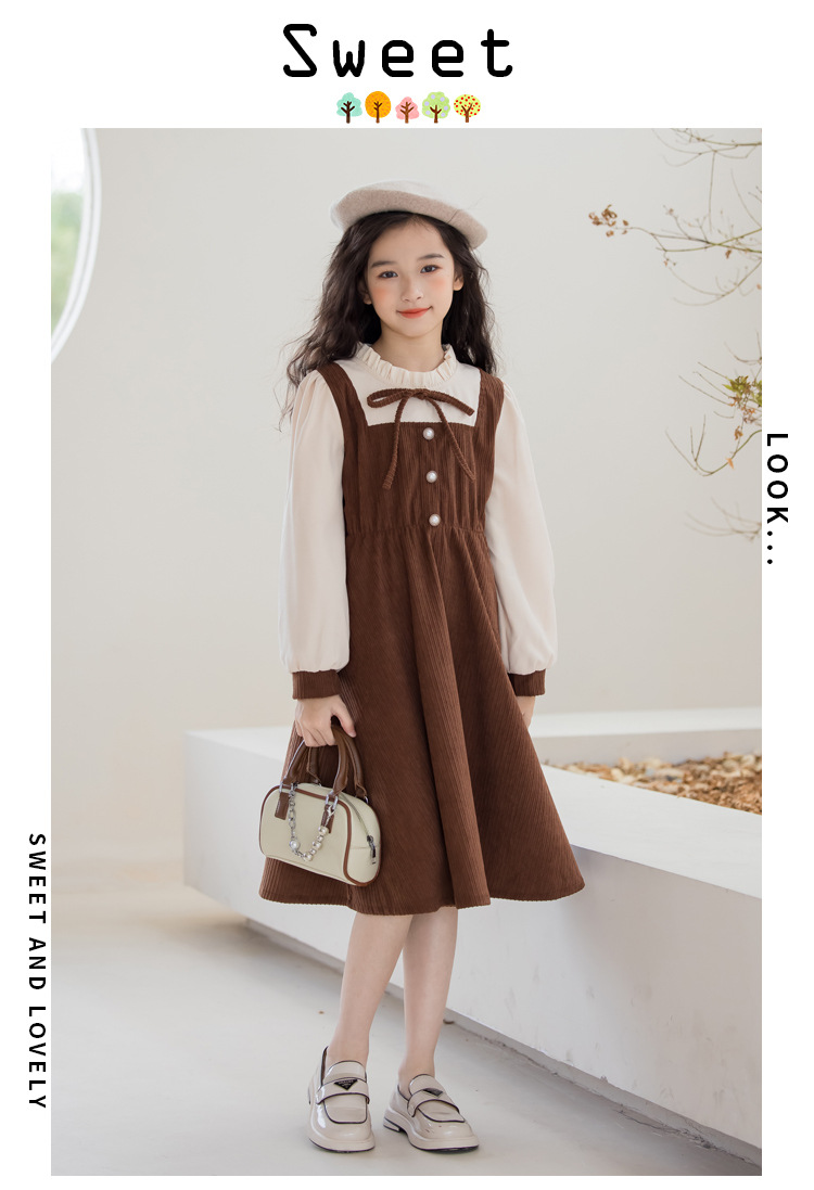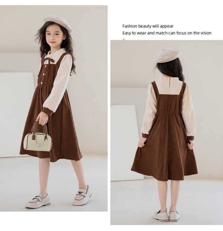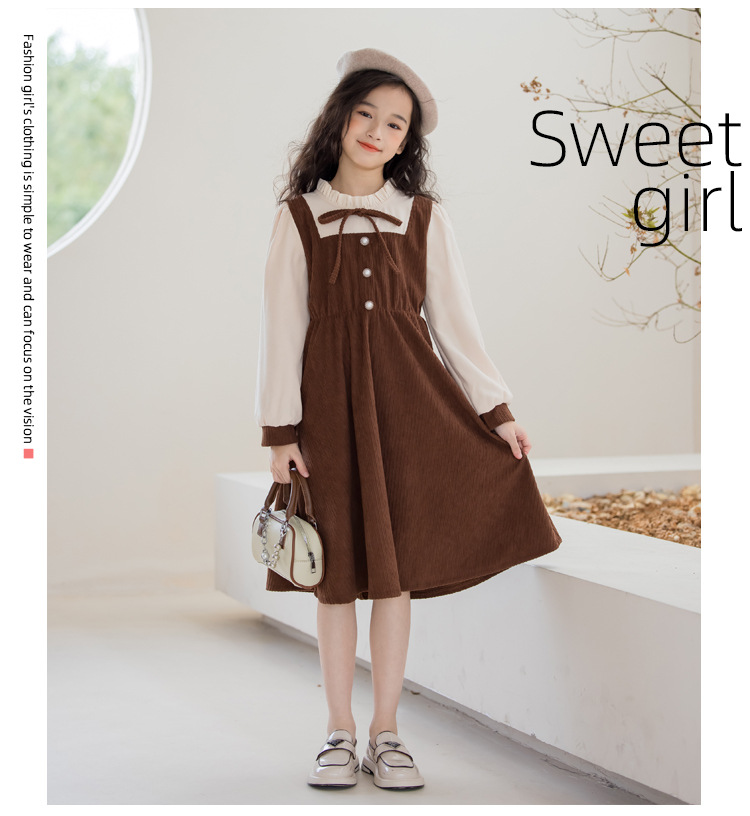 여아 원피스 투피스 스타일 2025 가을 달콤한 학생복 코듀로이 공주 드레스 큰 아이들 배색 레트로 드레스스토어 가기
