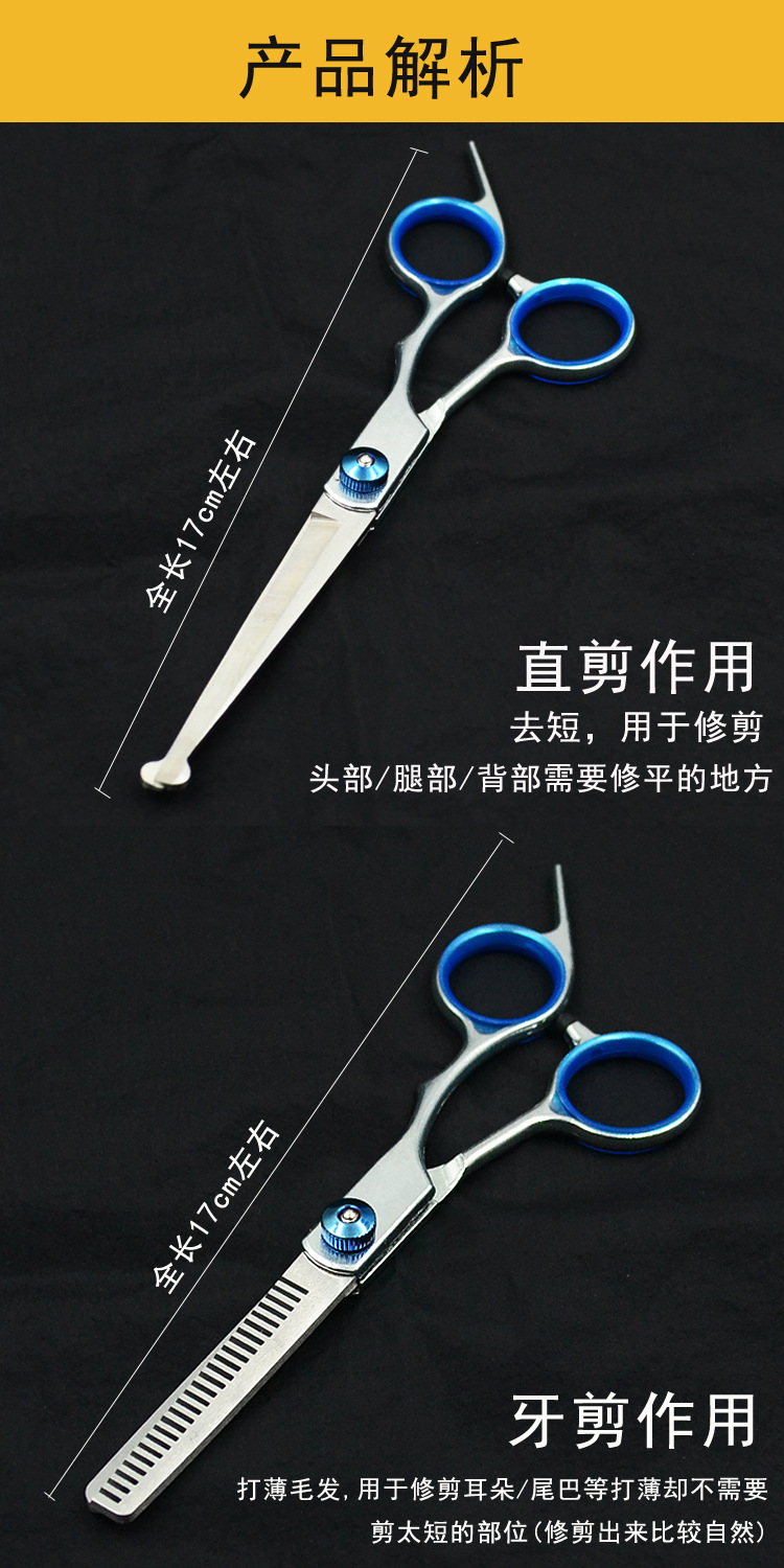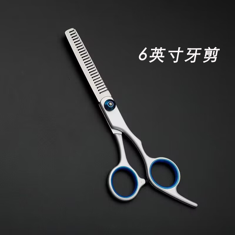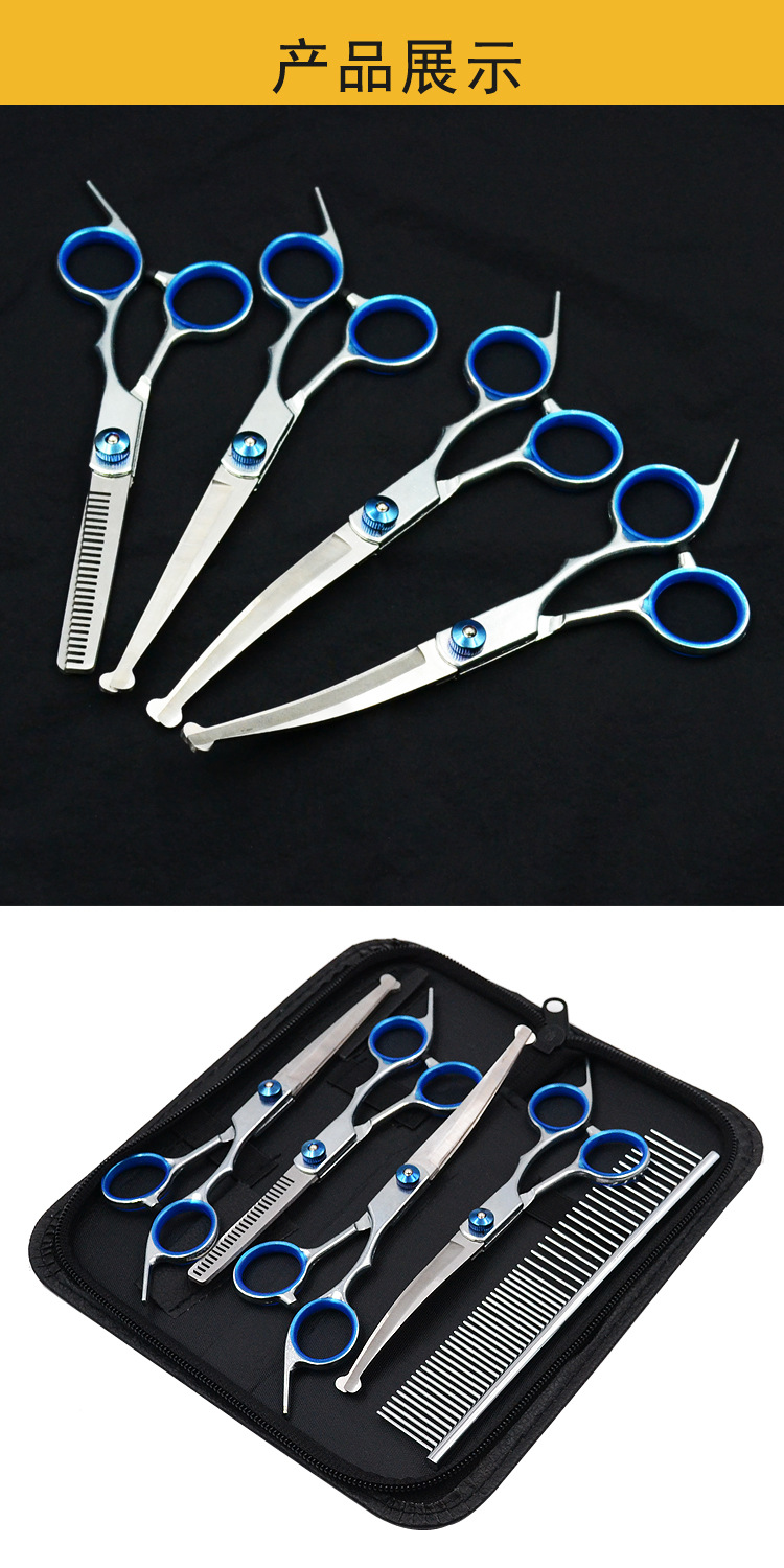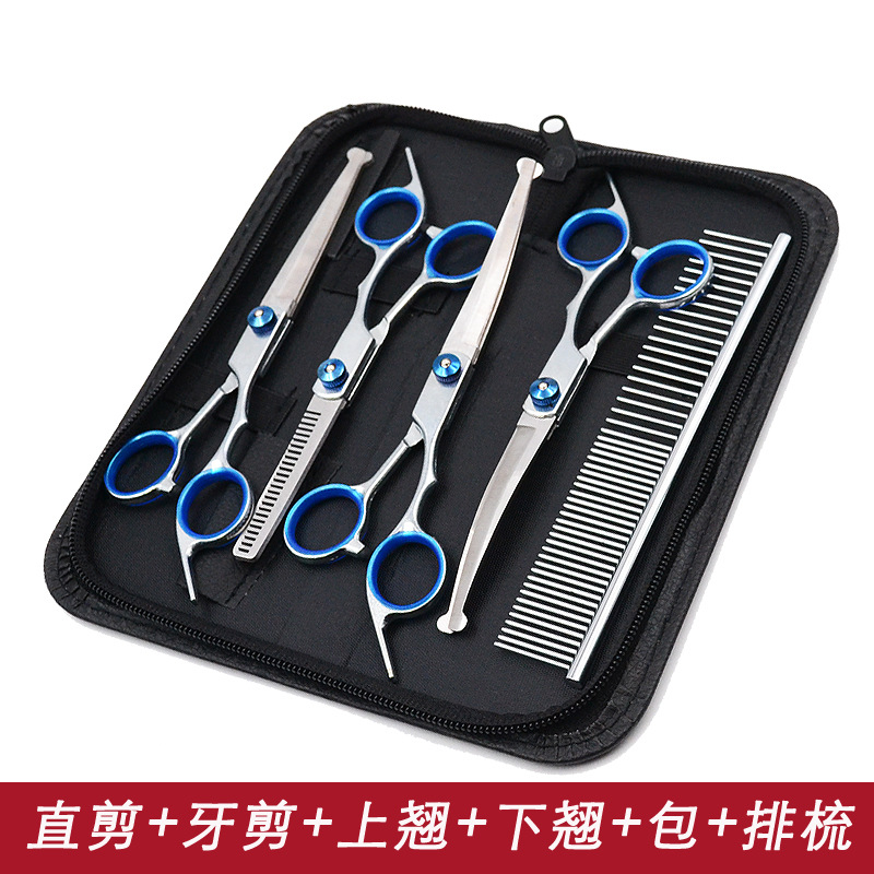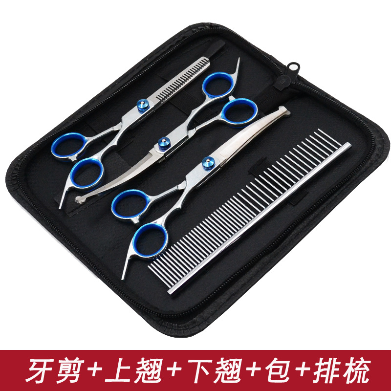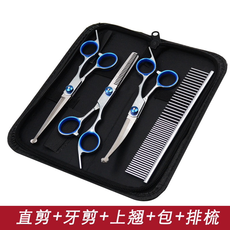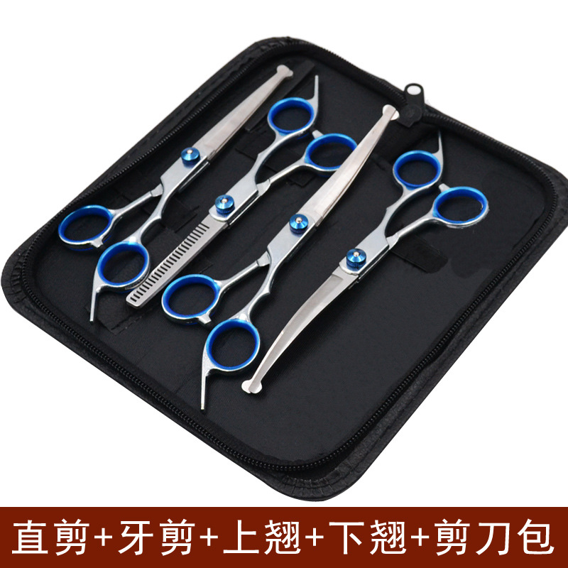 • 블루 샤프트 스플릿 물고기 입 스트레이트 가위 + 치아 가위 + 뒤집기 + 줄 빗 + 가위 가방