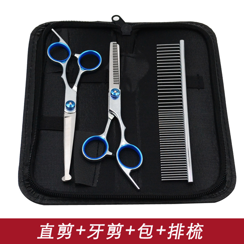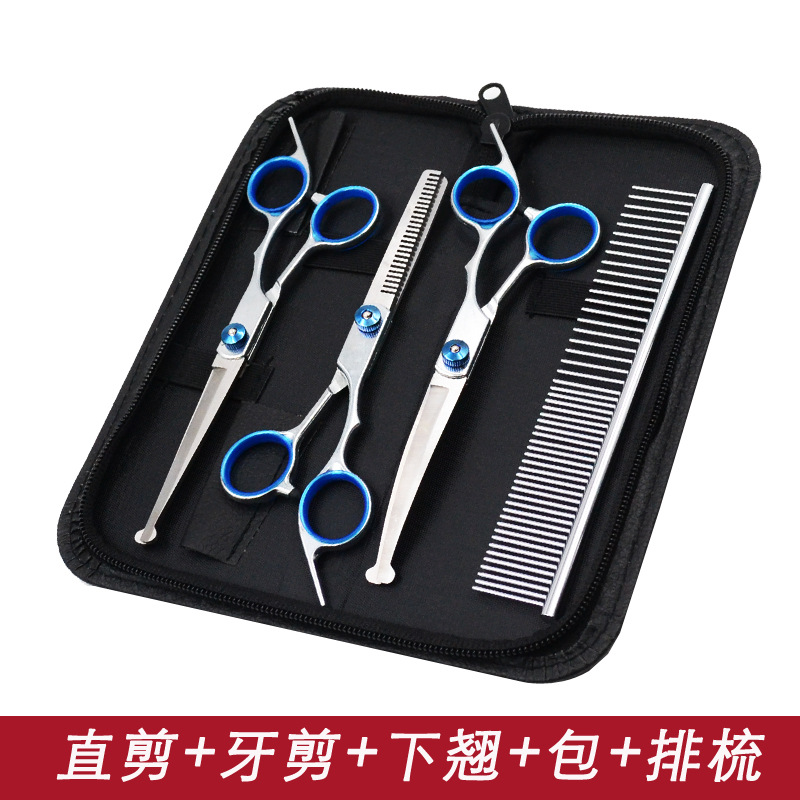 • 블루 샤프트 스플릿 물고기 입 스트레이트 가위 + 치아 가위 + 줄 빗 + 가위 가방