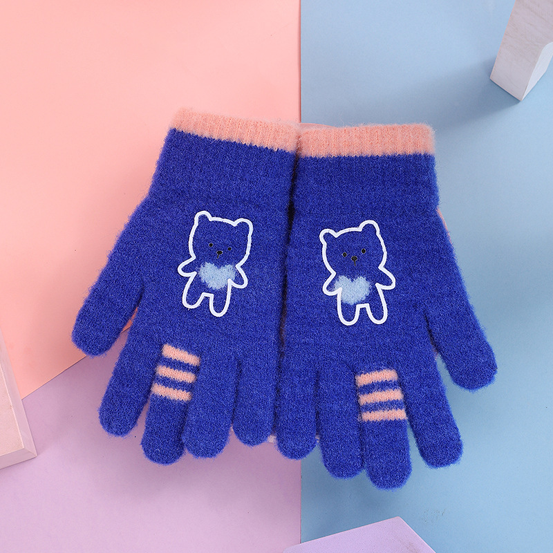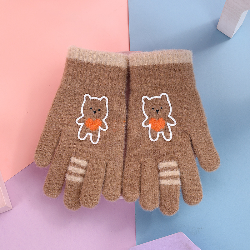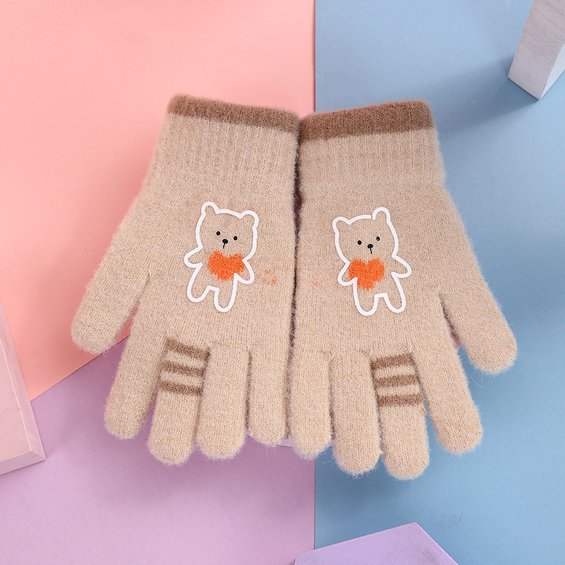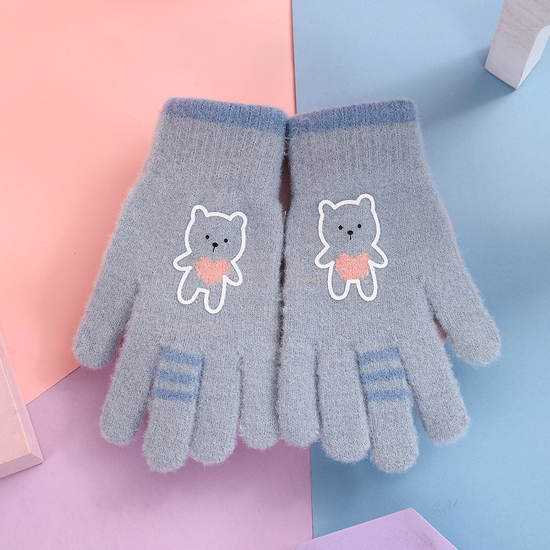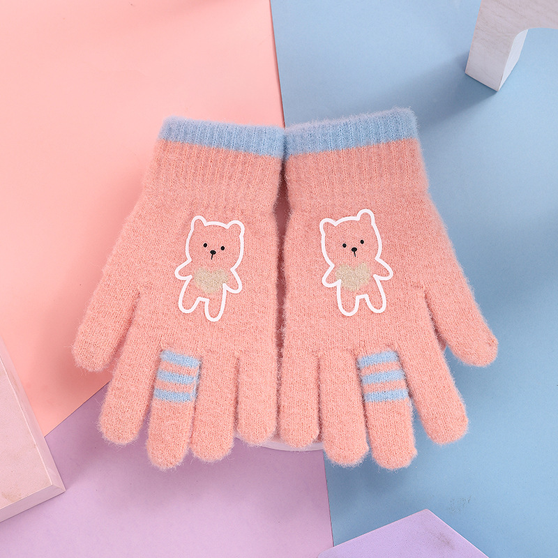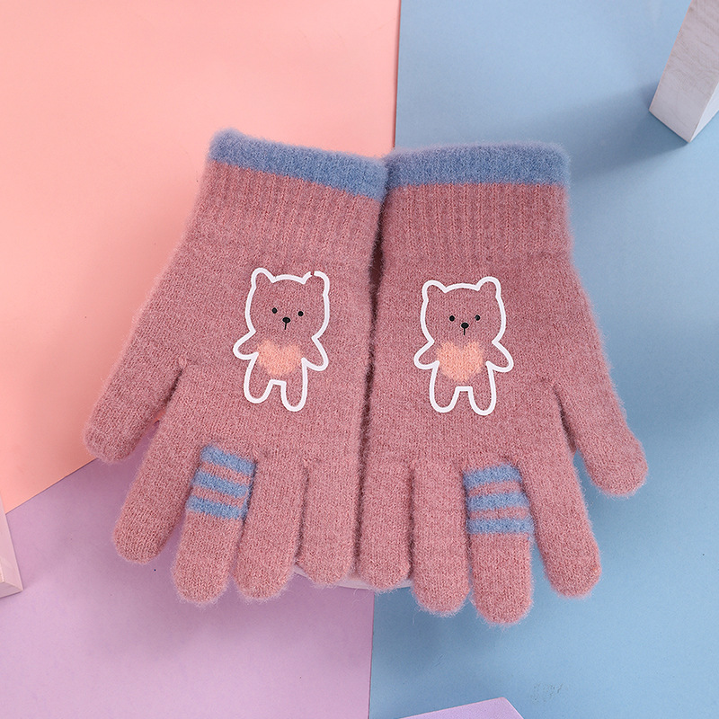 가을과 겨울 새로운 단색 곰 양모 니트 장갑 여성용 따뜻한 5 손가락 귀여운 겨울 야외 장갑