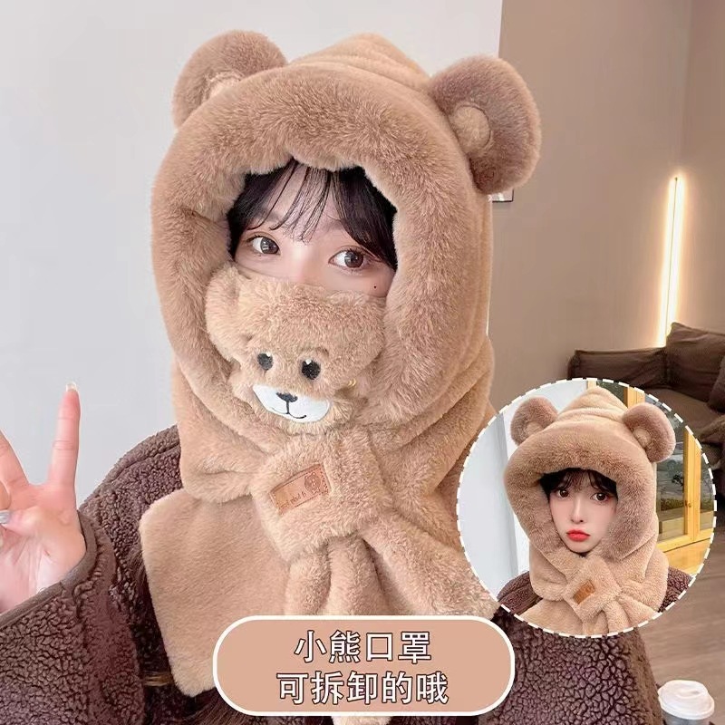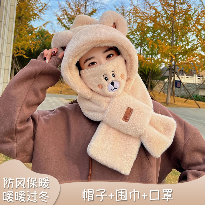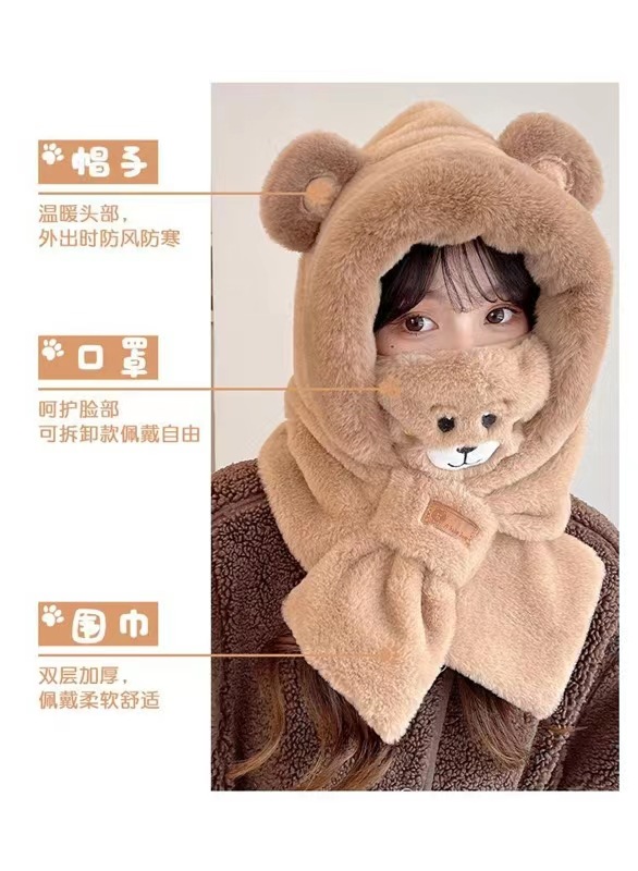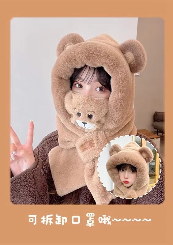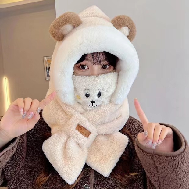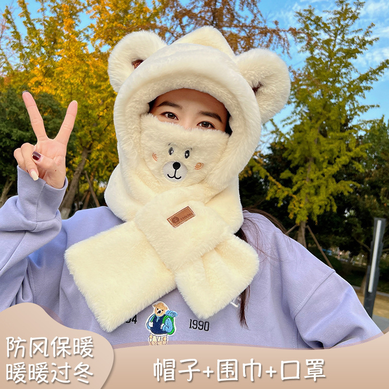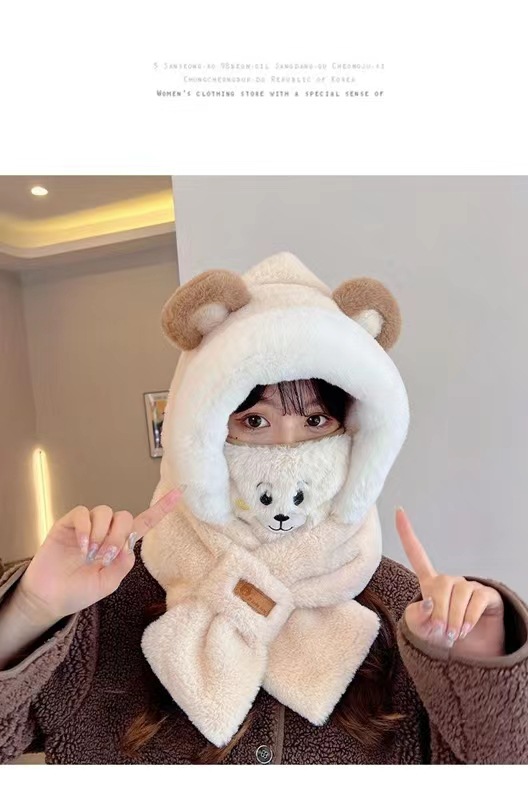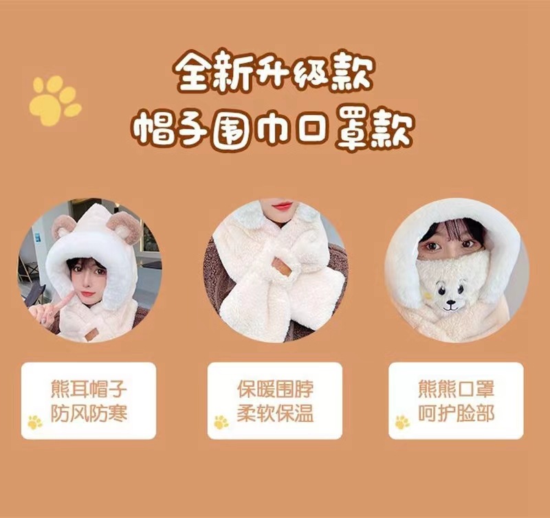가을 겨울 신상 모자와 스카프 투피스 세트 여성용 만능 만화 귀 달린 곰 마스크 보온 세트 도매 라운드형스토어 가기