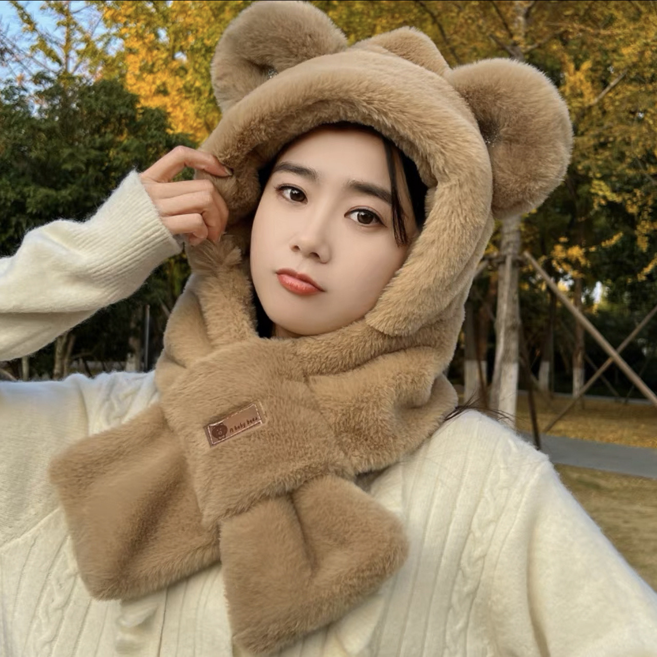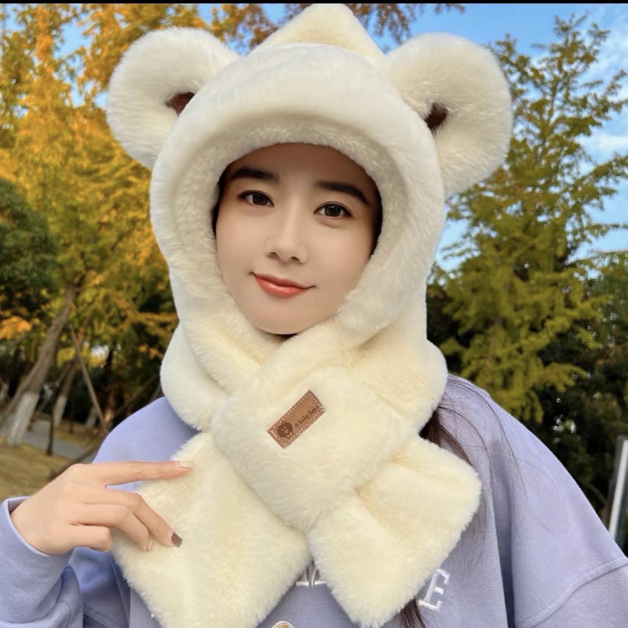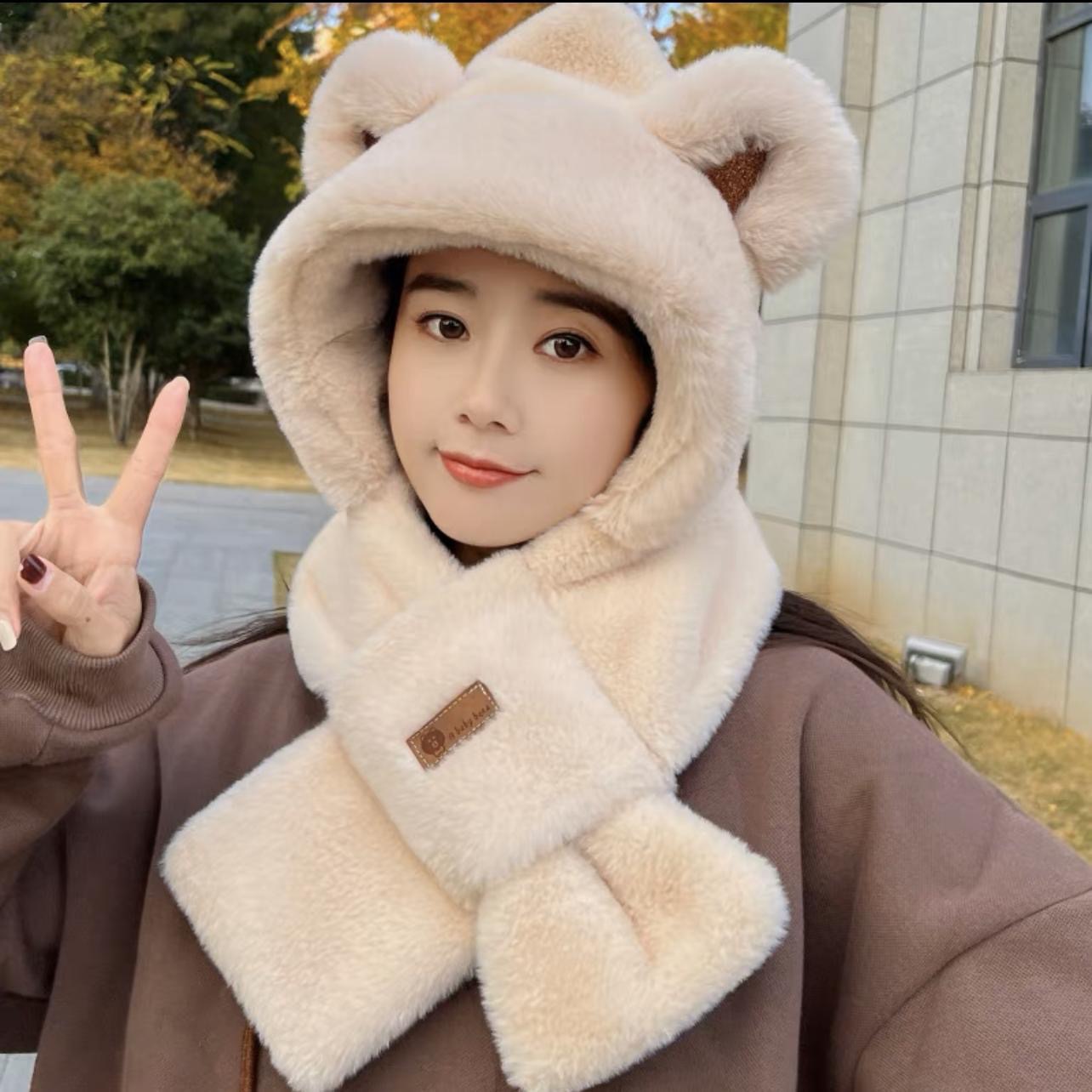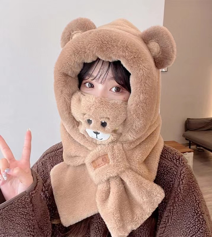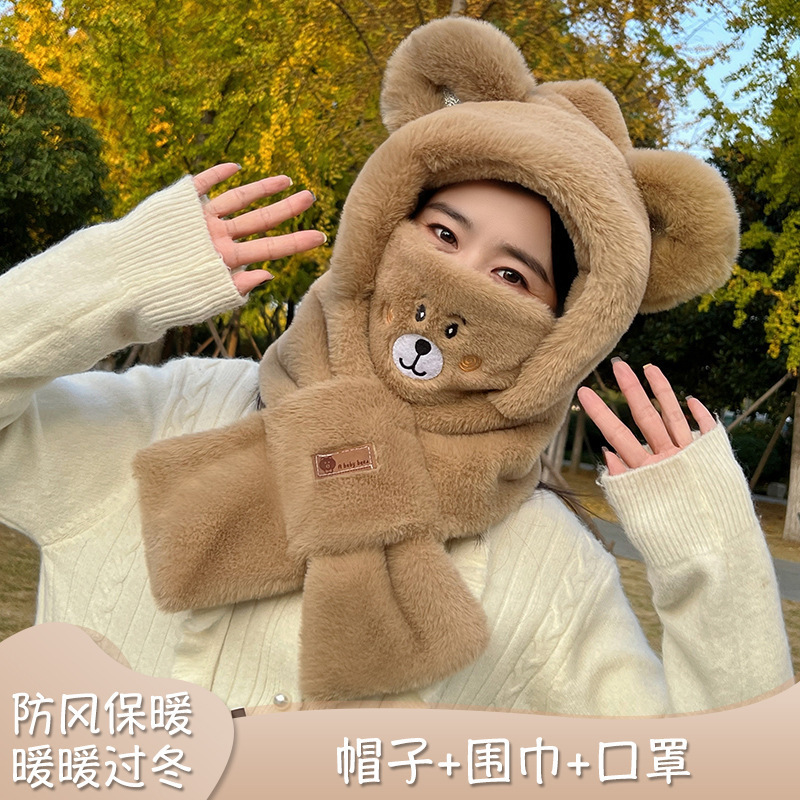 가을 겨울 신상 모자와 스카프 투피스 세트 여성용 만능 만화 귀 달린 곰 마스크 보온 세트 도매 라운드형스토어 가기
