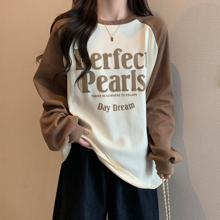 봄과 가을 독일 벨벳 따뜻한 대비 색상 긴팔 스웨터 여성용 틈새 디자인 감각 느슨한 슬리밍 티셔츠베이스 셔츠 탑