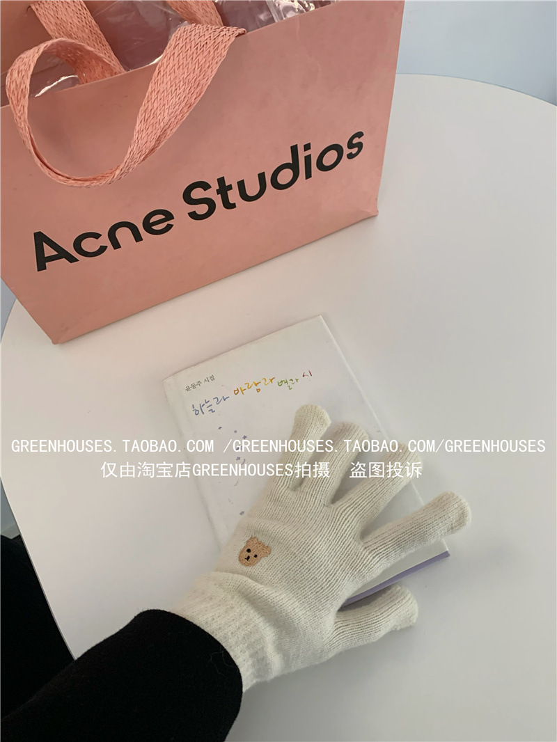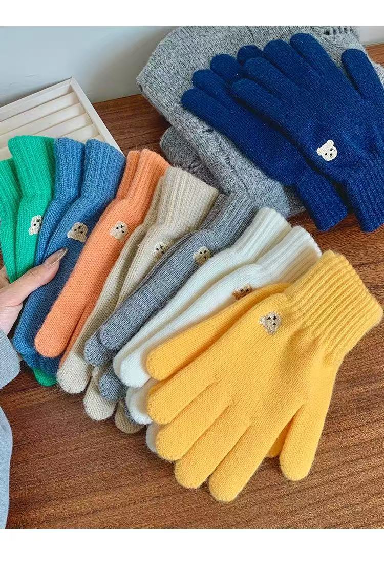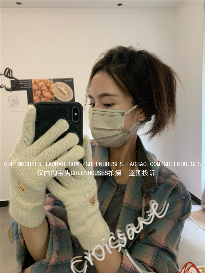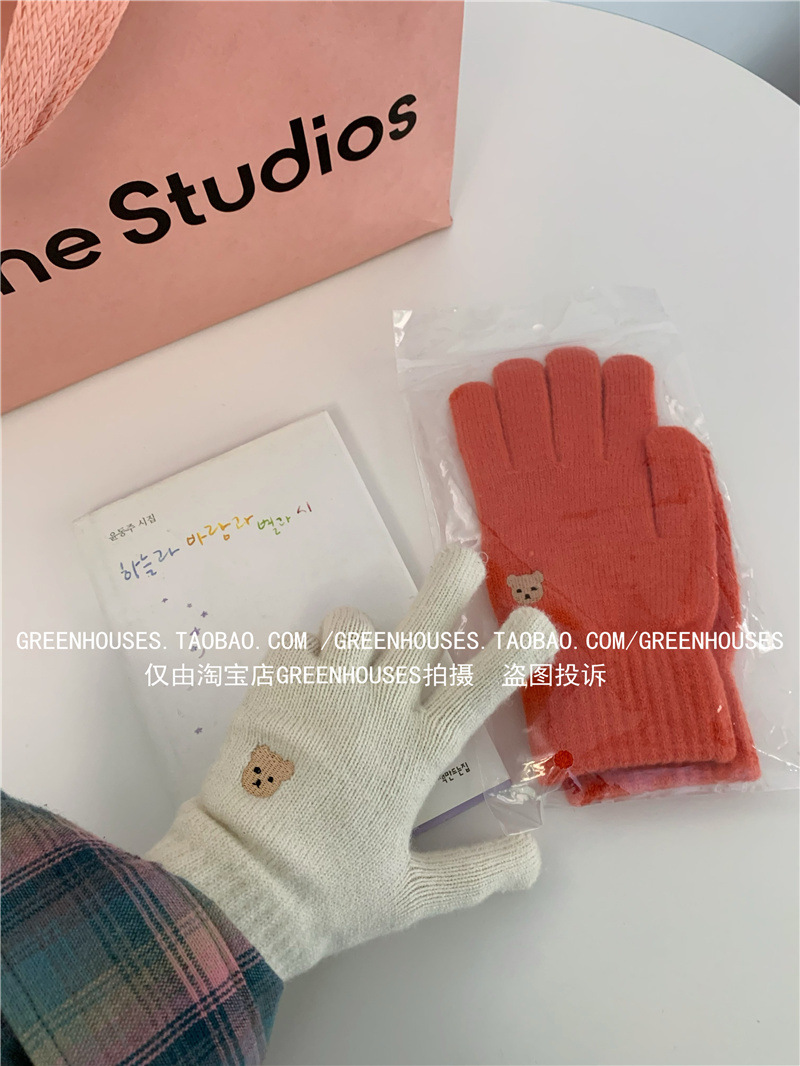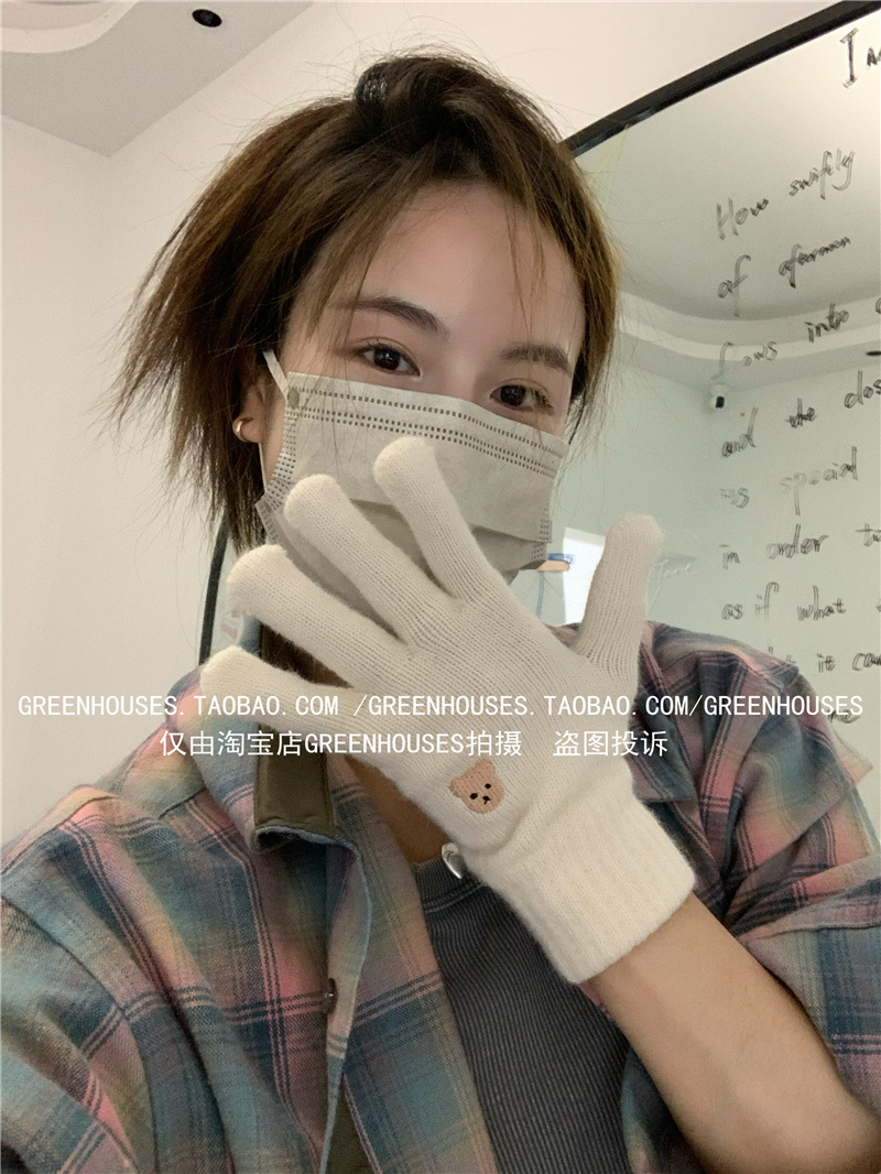 양모 장갑 여자의 가을과 겨울 한국 귀여운 곰 자수 니트 터치 스크린 학생 따뜻한 사이클링 장갑 방풍