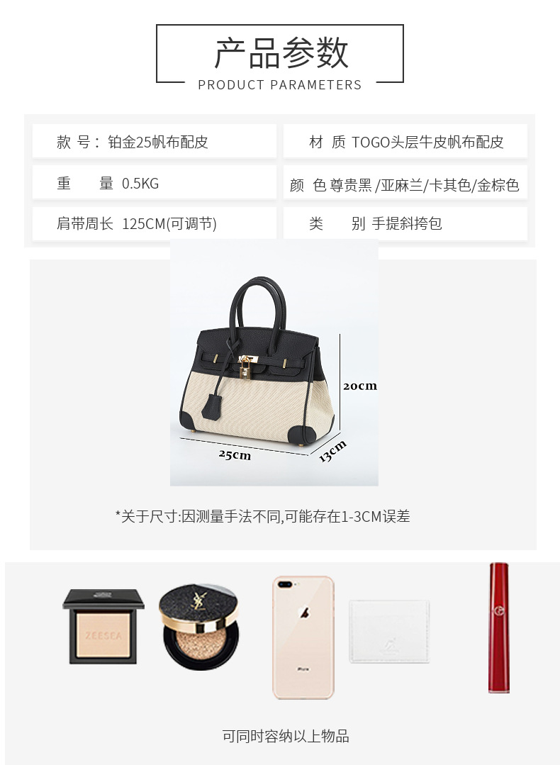 【包身尺寸】:尺寸:长25cm 宽13cm高20CM(不同的人测量方式不同会存在2cm-3cm左右的误差属正常)