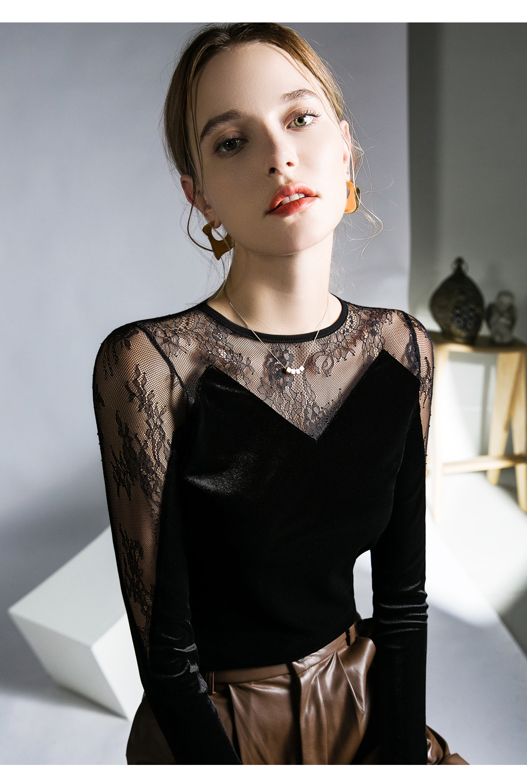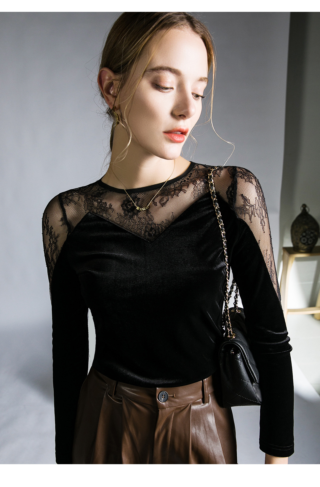 세련된 디자인 감각 레이스 탑 스티칭 블랙 벨벳 섹시한 티셔츠 가을 새로운 프랑스 스타일 여성을위한 세련된 작은 셔츠