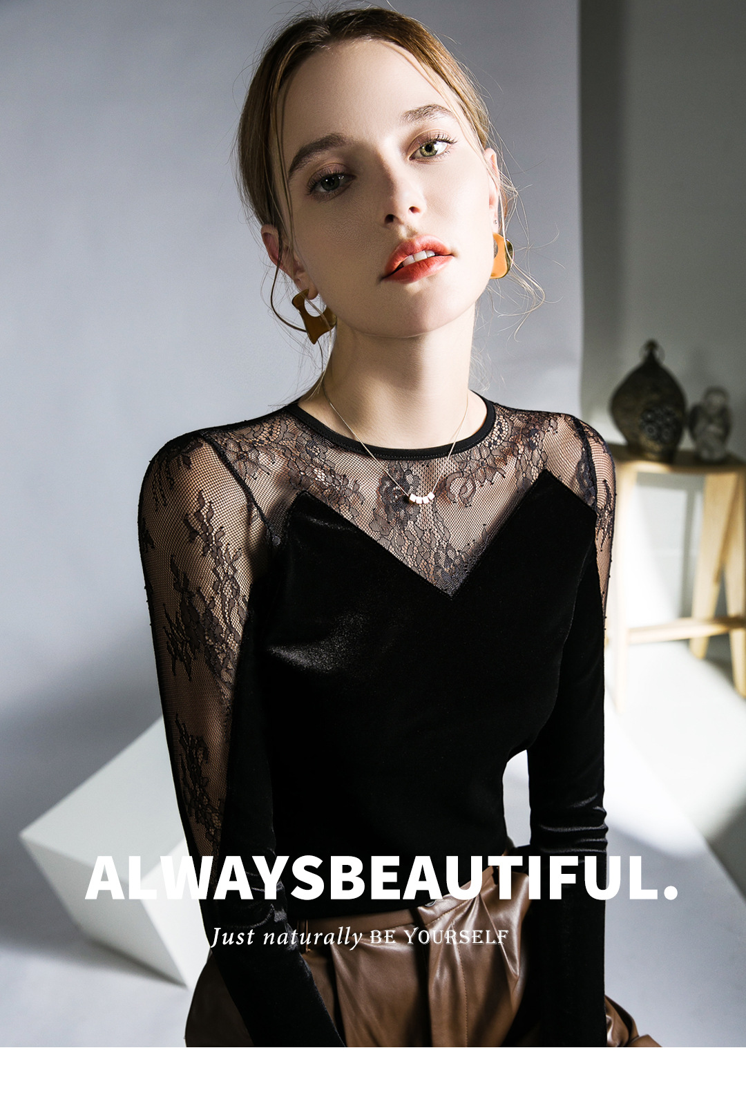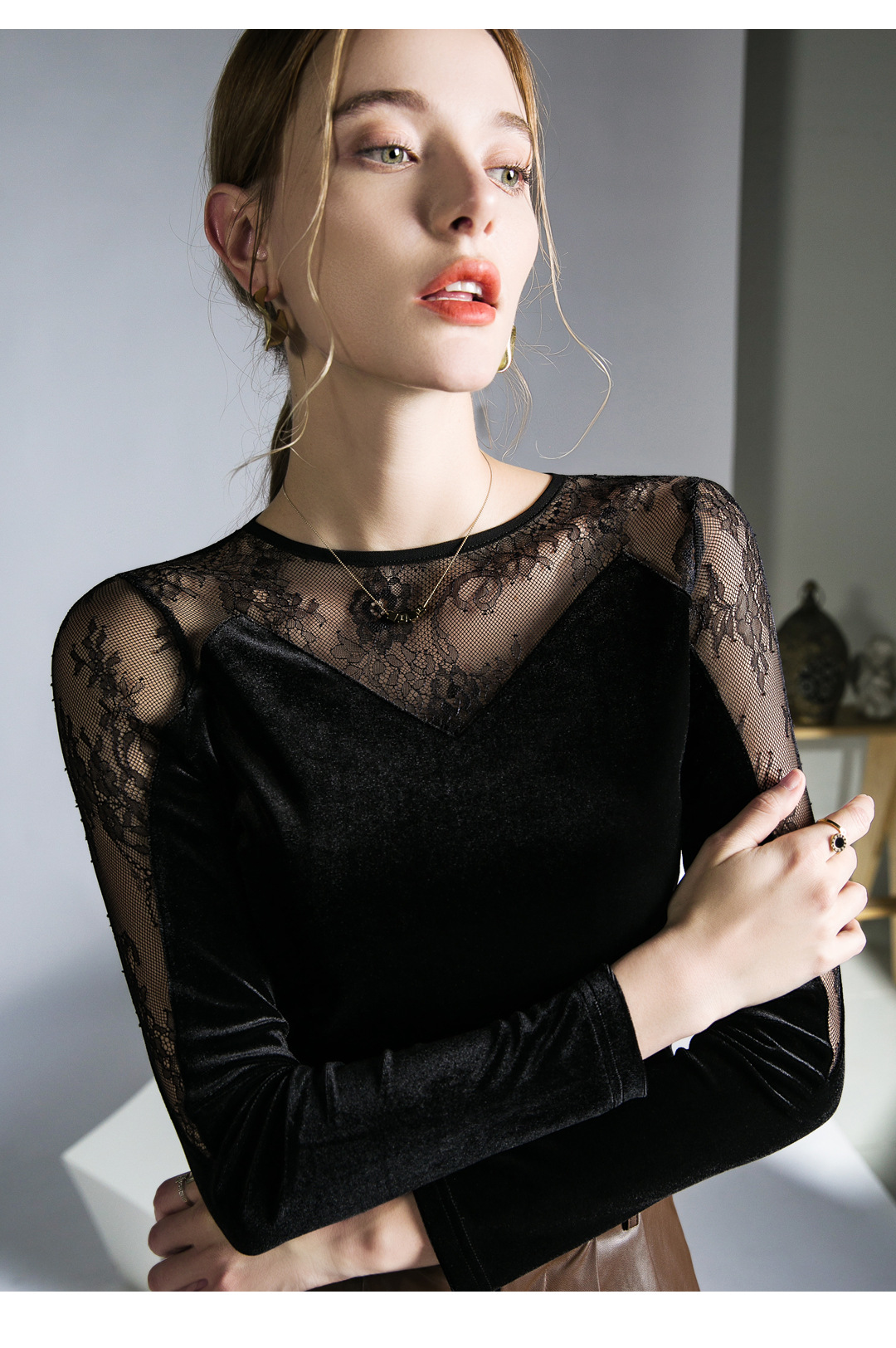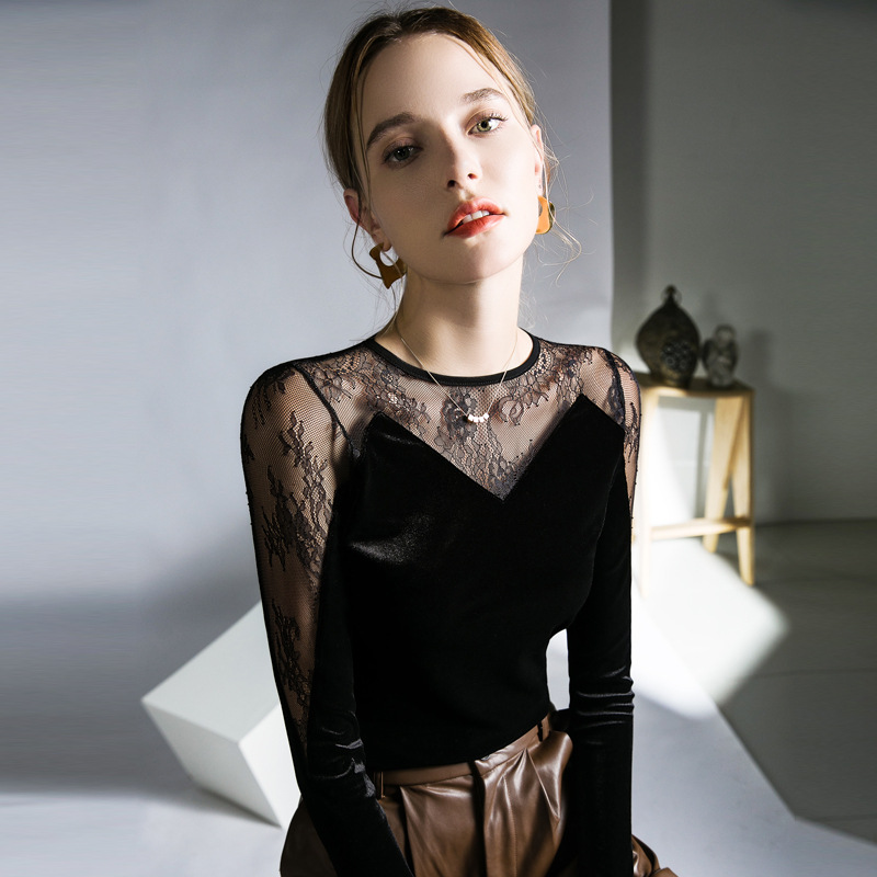 세련된 디자인 감각 레이스 탑 스티칭 블랙 벨벳 섹시한 티셔츠 가을 새로운 프랑스 스타일 여성을위한 세련된 작은 셔츠스토어 가기