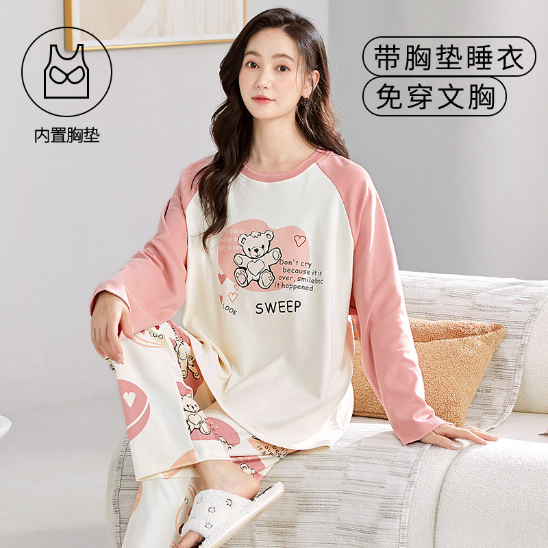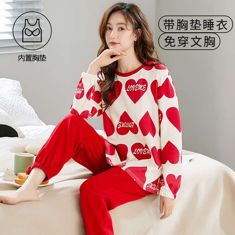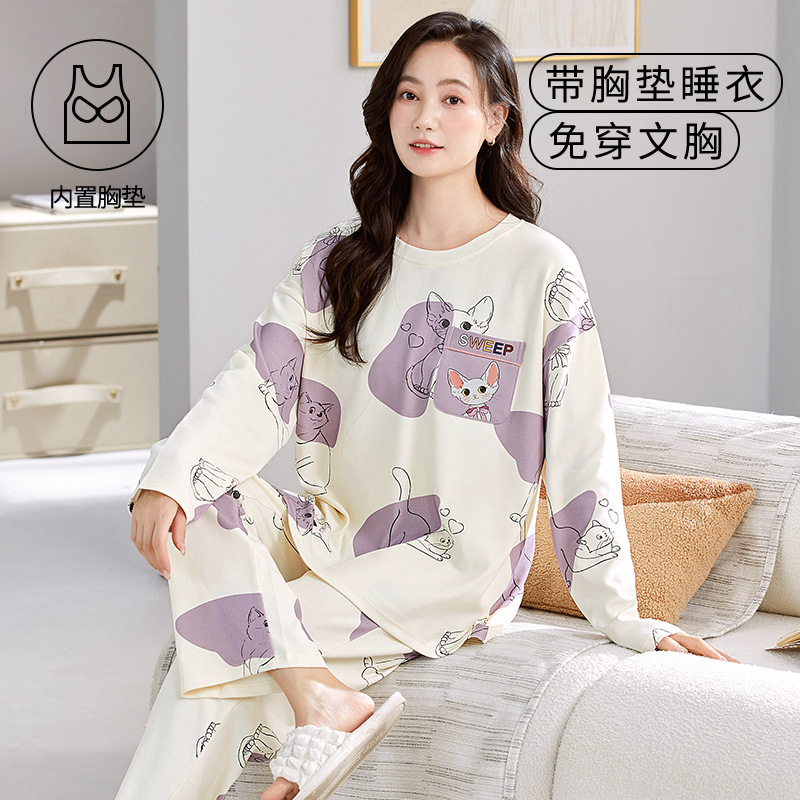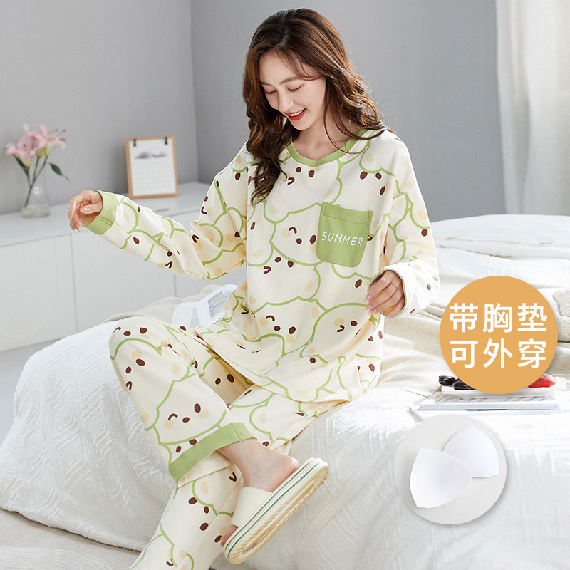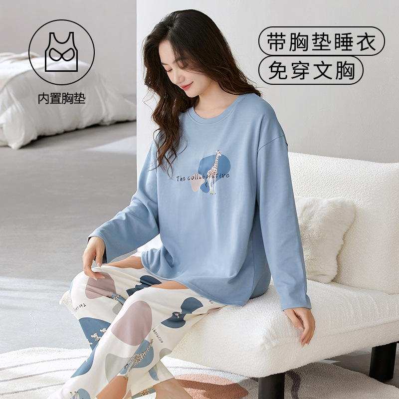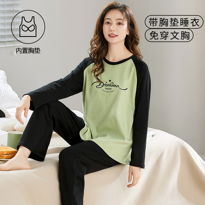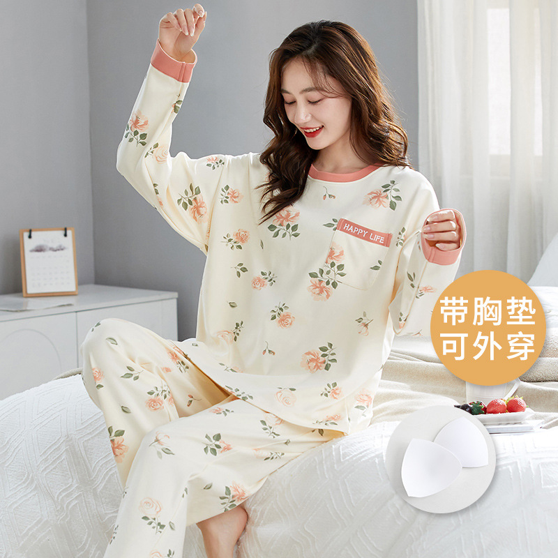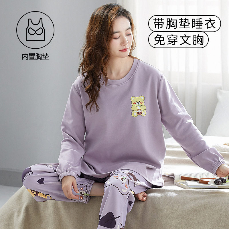 크루 넥 풀오버 파자마 여성의 봄과 가을, 가슴 패드웨어-무료 속옷 긴팔 홈 옷 안티 범프 복장