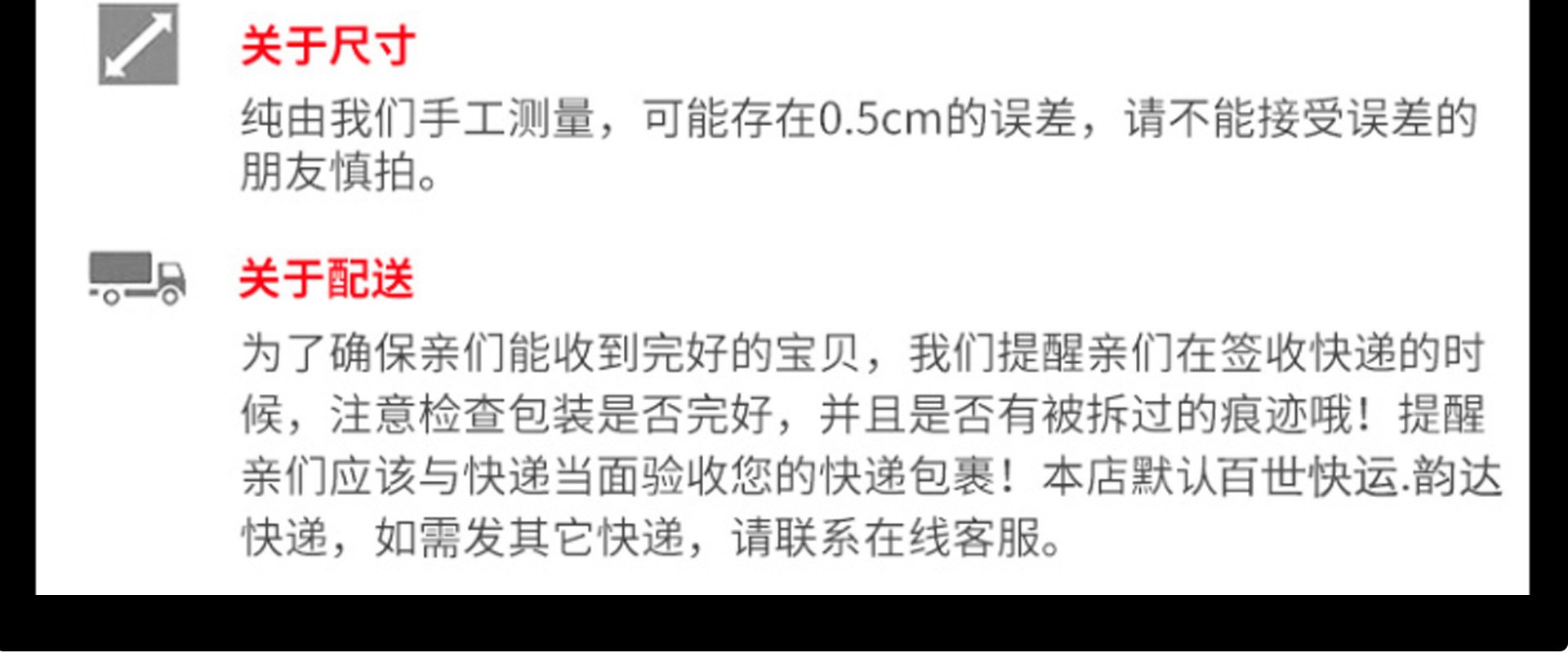 2、质量要求:产品将严格按以上参数说明生产,款式以图片为标准,请买家仔细阅读商品介绍说明,确认商品的规格、颜色、材料等相关的详细资料,若不明之处请随时与我们联系;
