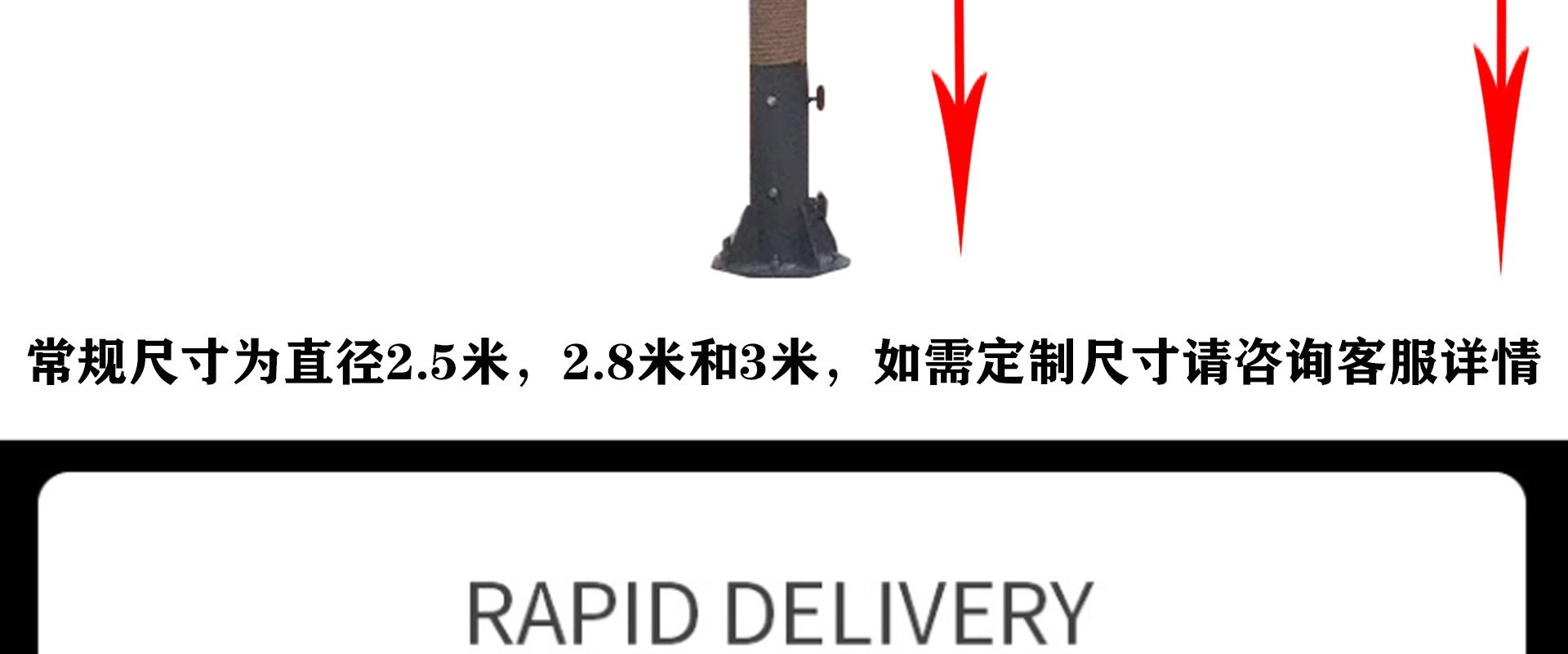 6、产品安装:为了方便运输,户外伞大部份产品都为拆装打包产品,买家购买及收到商品后请按配备的组装说明书安装,安装过程中,若有不明白的地方,请随时与我们联系;