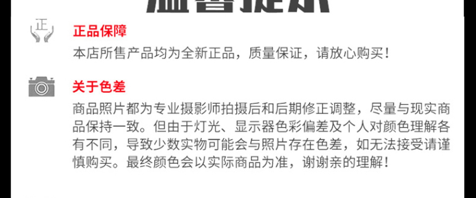 3、关于色差:产品照片是由原工厂请专业摄影师拍摄,拍照时而由于光线、角度问题以及查看图片时显示屏分辩率的不同,可能会存在颜色的误差,故产品的颜色应以实物为准;