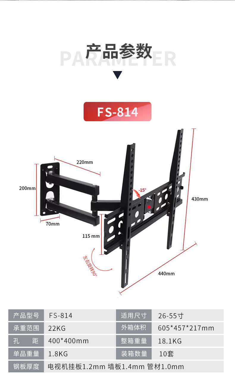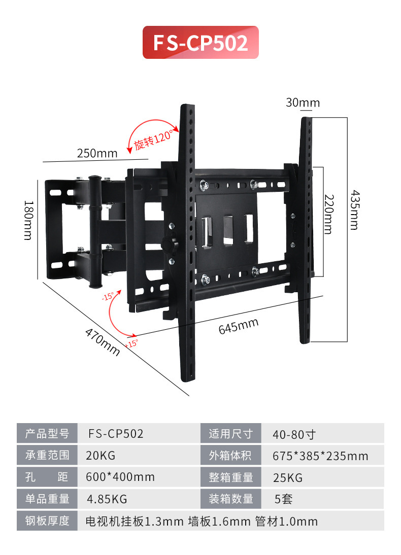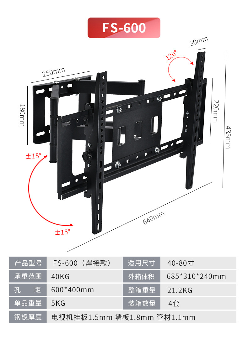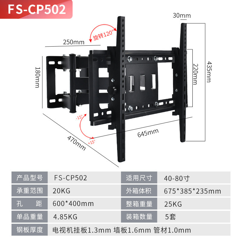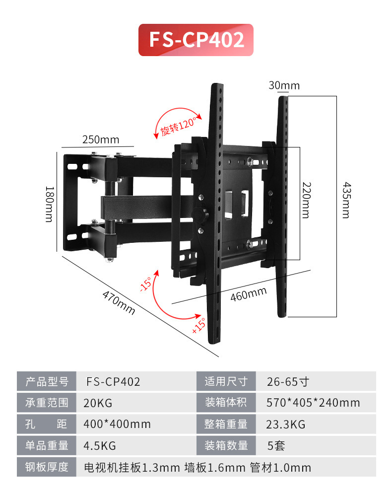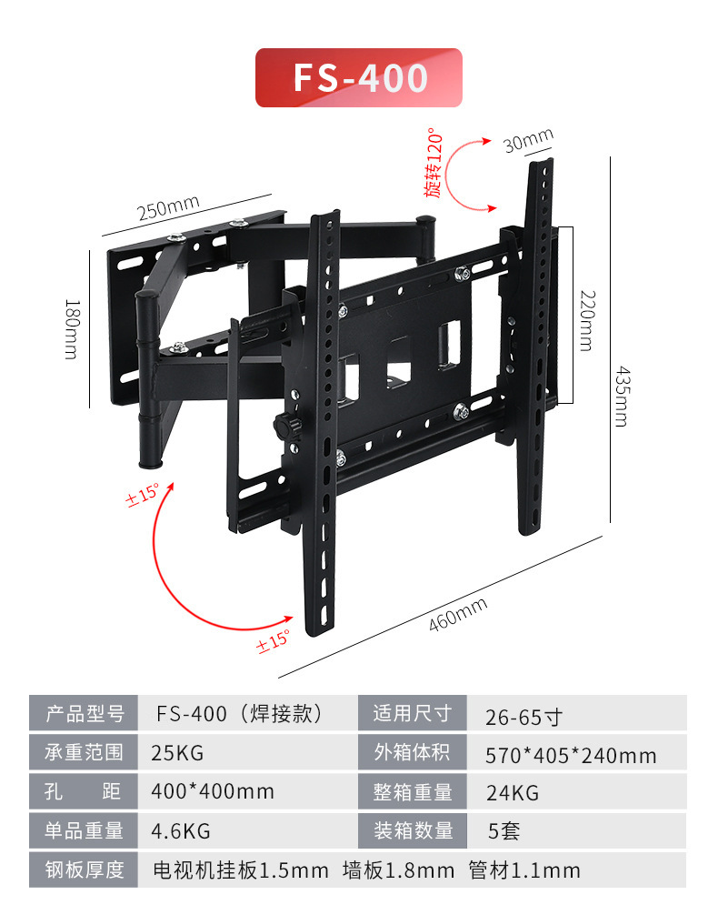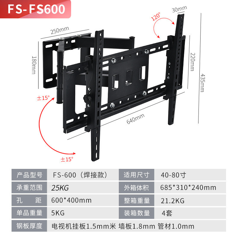 국경 간 TV 브래킷 회전식 신축형 벽걸이 브래킷 14-120inch 모니터 범용 TV 스윙 브래킷