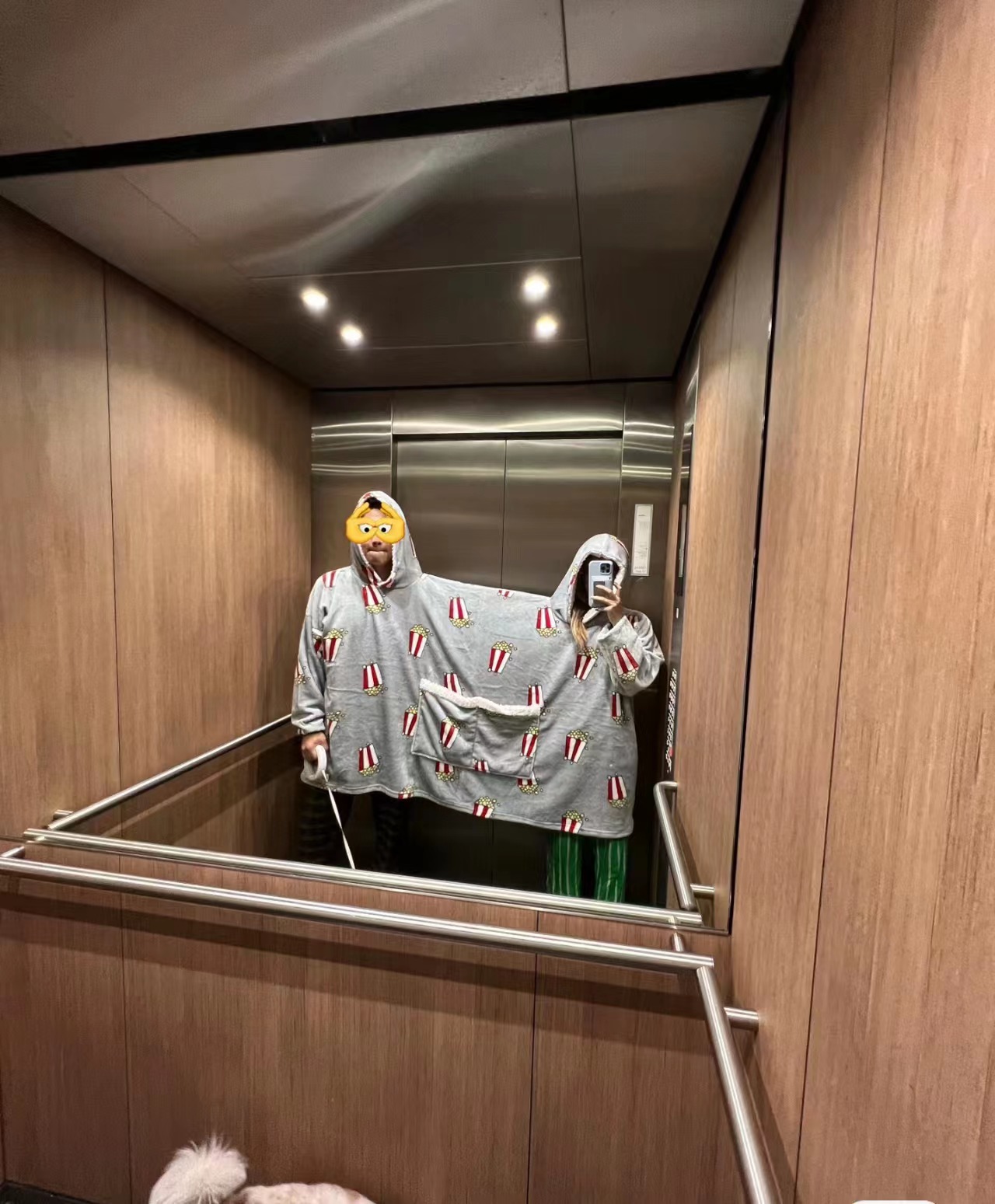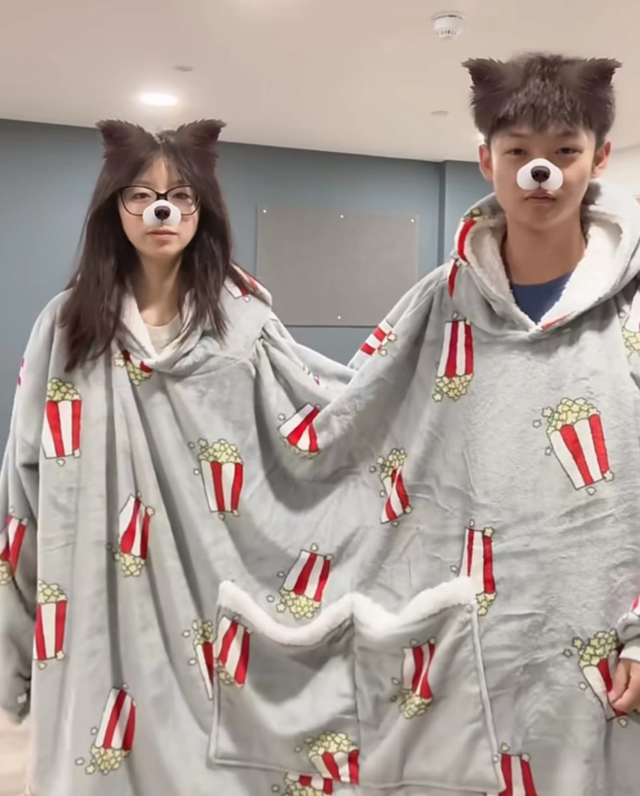 가을과 겨울 아마존 팝콘 더블 원 후드 파자마 크리에이티브 기모 커플 홈 옷 느슨한 여자 친구 스푸프 타이드