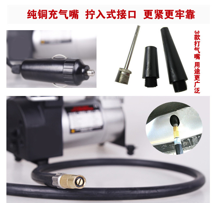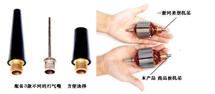 8、附送三种气嘴,自行车,摩托车,球类,充气床也可打气。