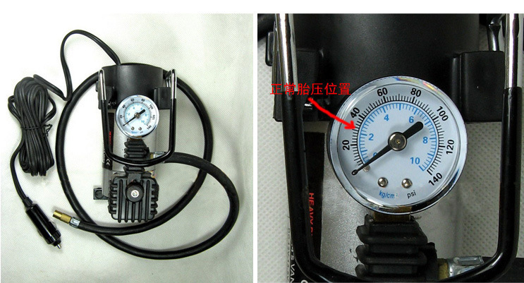 充气时,仪表指针随轮胎饱和程度上升,当指针到达适当胎压时(一般轿车轮胎胎压为223kpa=35PSI),取出插头和气嘴,即完成工作。