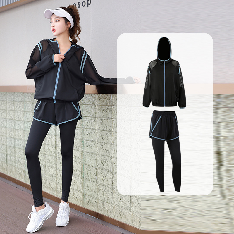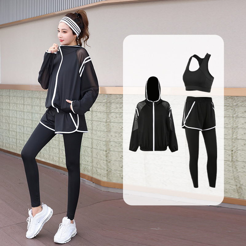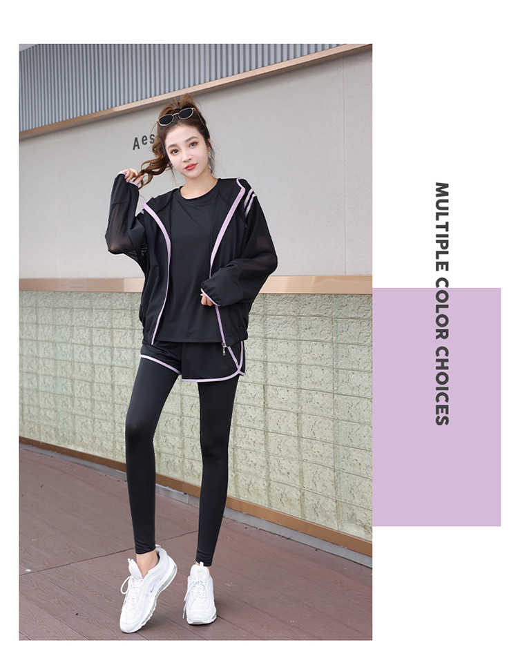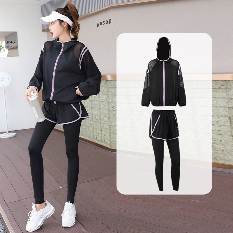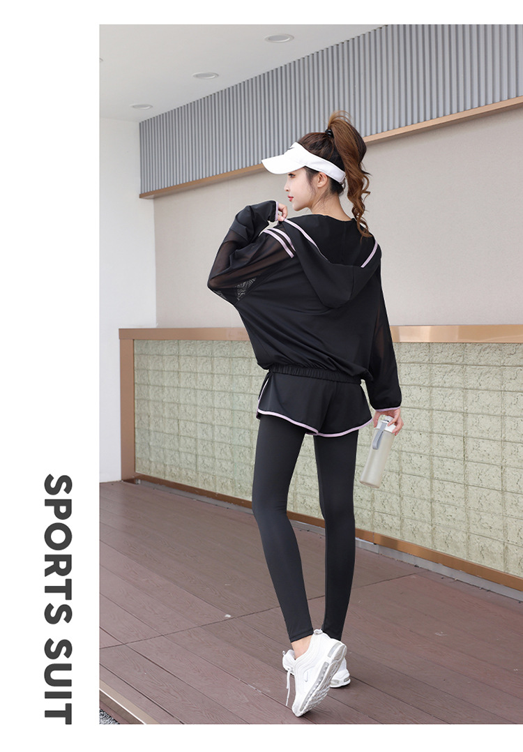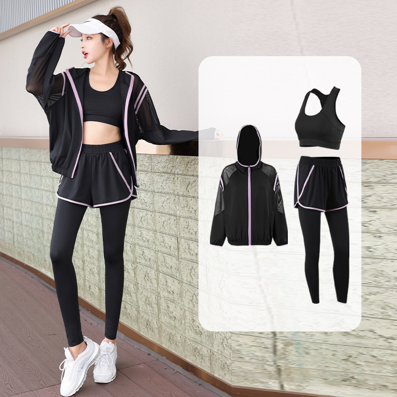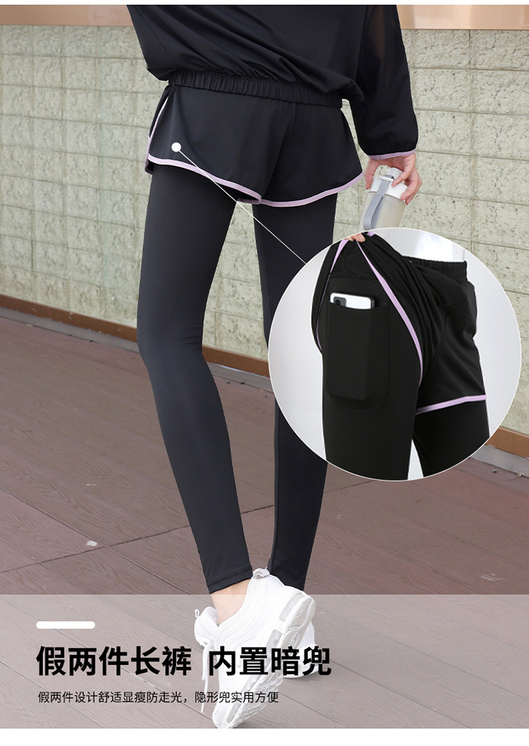 요가 의류 세트 2023 새로운 메쉬 스티치 가짜 투피스 바지와 휴대 전화 빠른 건조 달리기 운동복